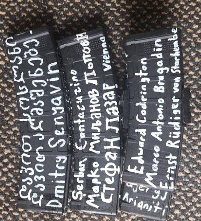 Caninin silahlarının üzerinde, daha önce dünyanın başka bölgelerinde Müslümanlara saldırı düzenleyenlerin isimlerinin yer alması dikkat çekti.