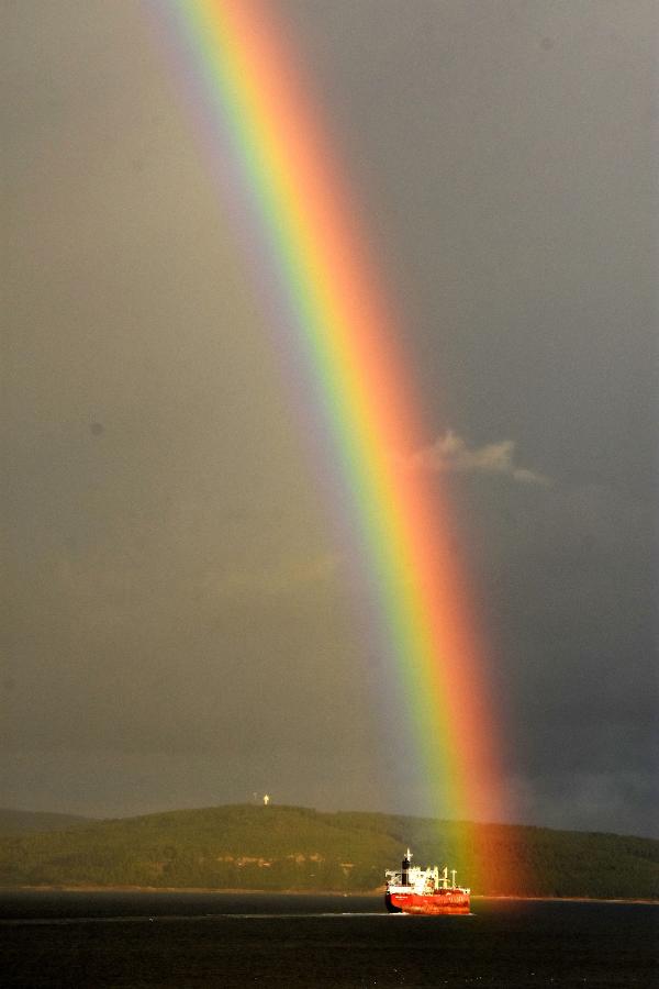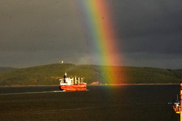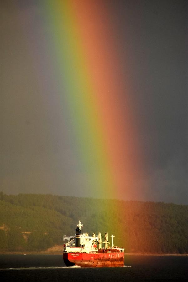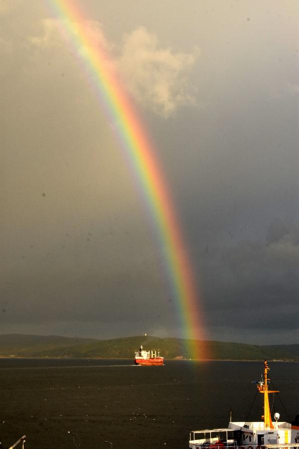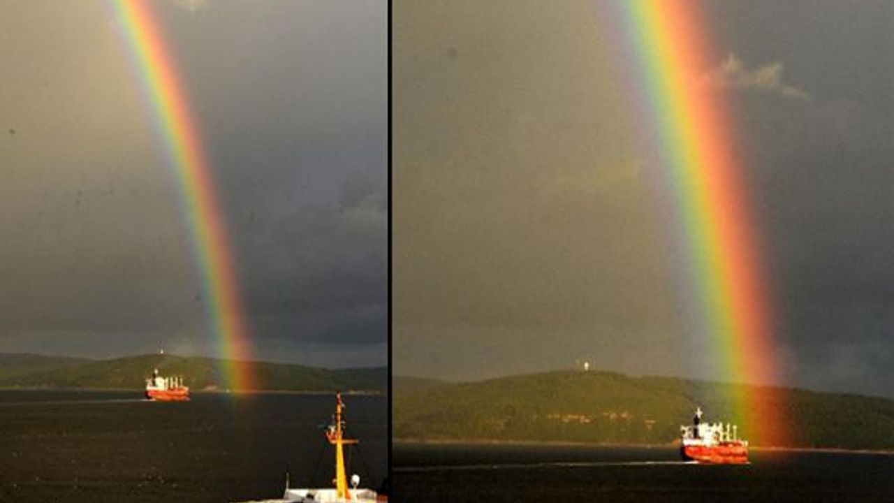 Kilitbahir Kalesi üzerinde ve boğazın ortasında oluşan gökkuşağının altından geçen gemiler, güzel görüntüler oluşturdu.