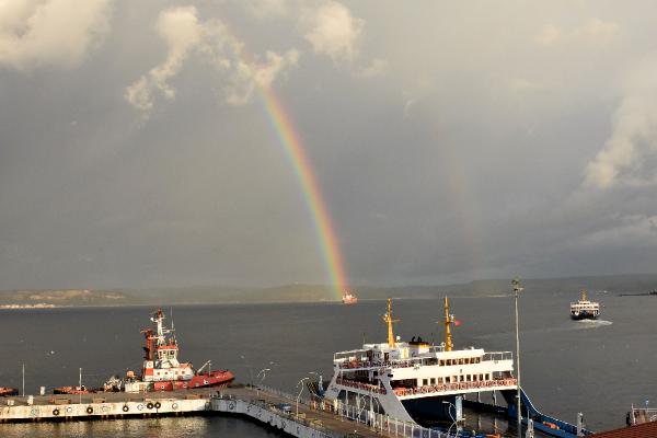 Günün ilk ışıklarıyla birlikte Çanakkale Boğazı ise gökkuşağına sahne oldu.