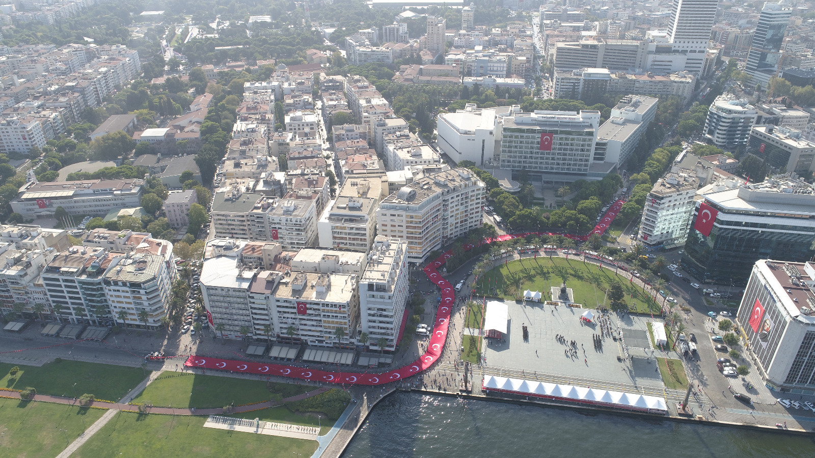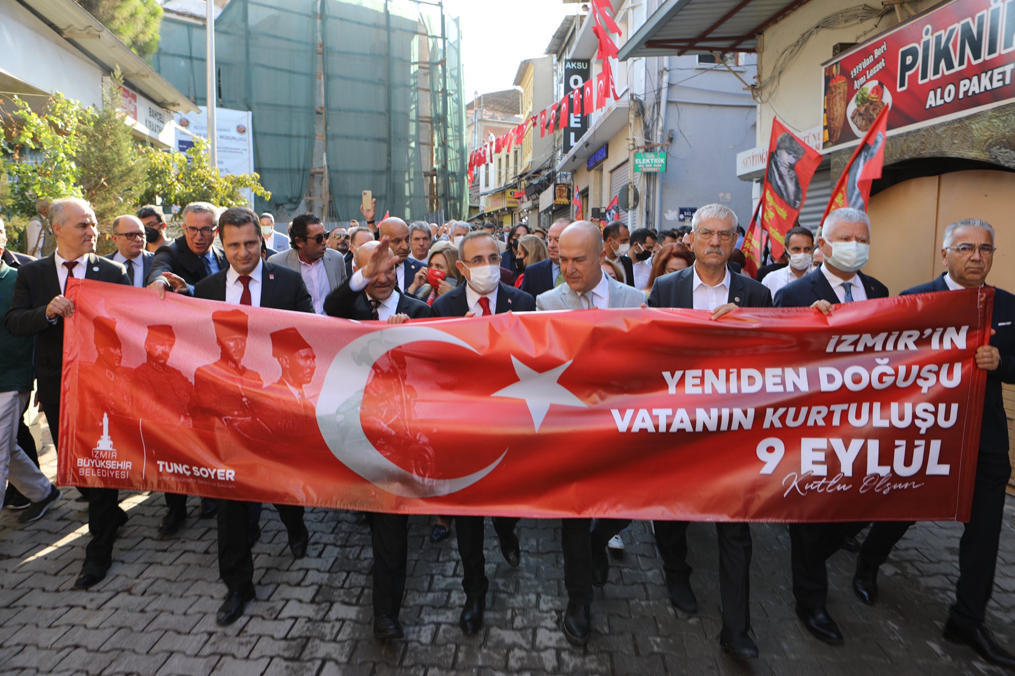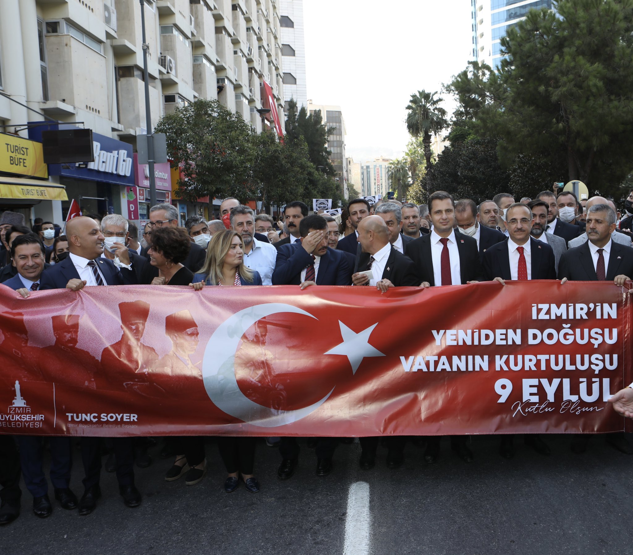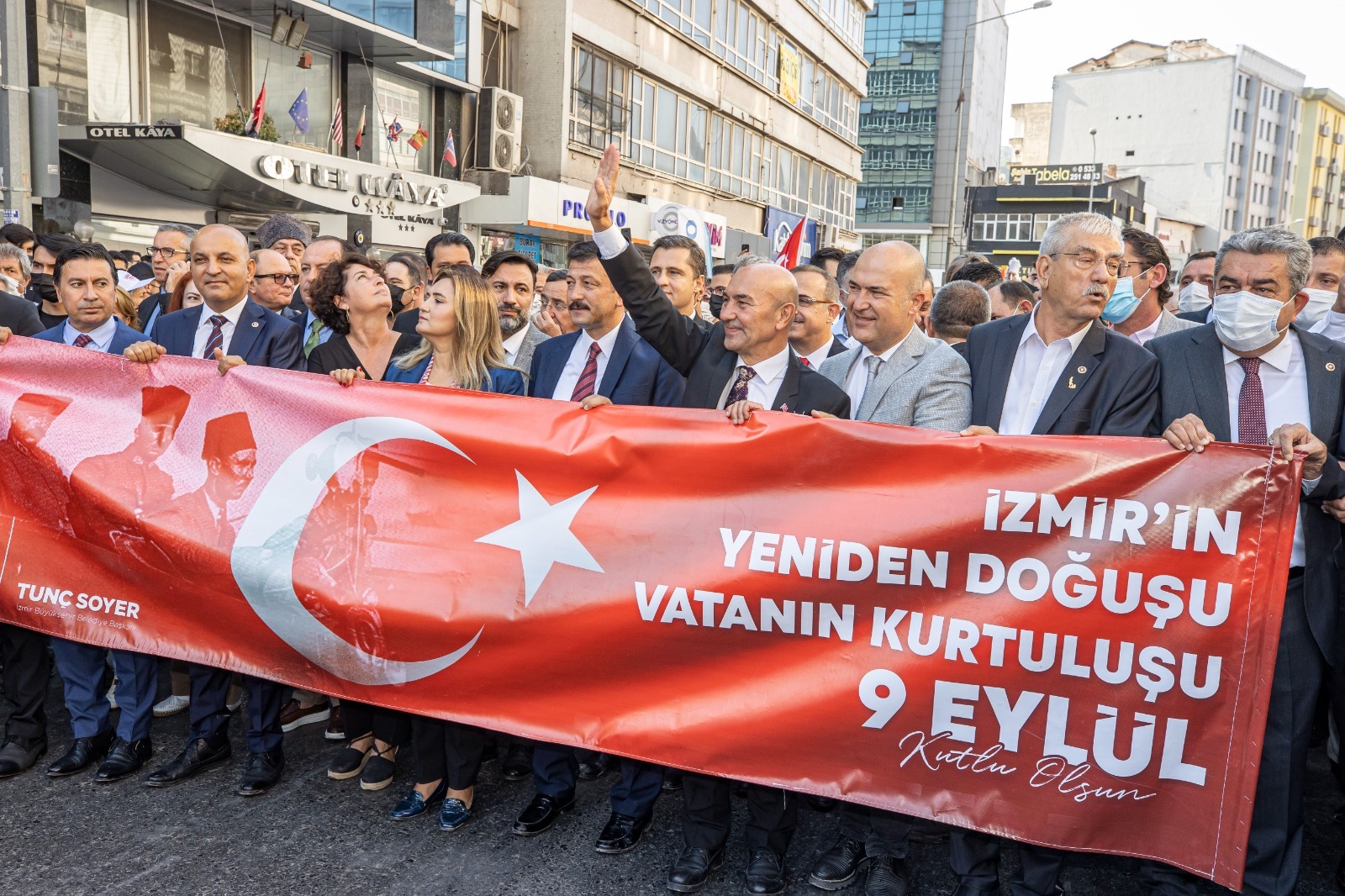 İzmir Büyükşehir Belediye Başkanı Tunç Soyer, 350 metre uzunluğundaki bayrağı taşıyan İzmirlilerle birlikte, Türk Ordusu’nun 9 Eylül 1922'de kente girdiği güzergâhı kullanarak Basmane Karakolu önünden Cumhuriyet Meydanı'na dek yürüdü.