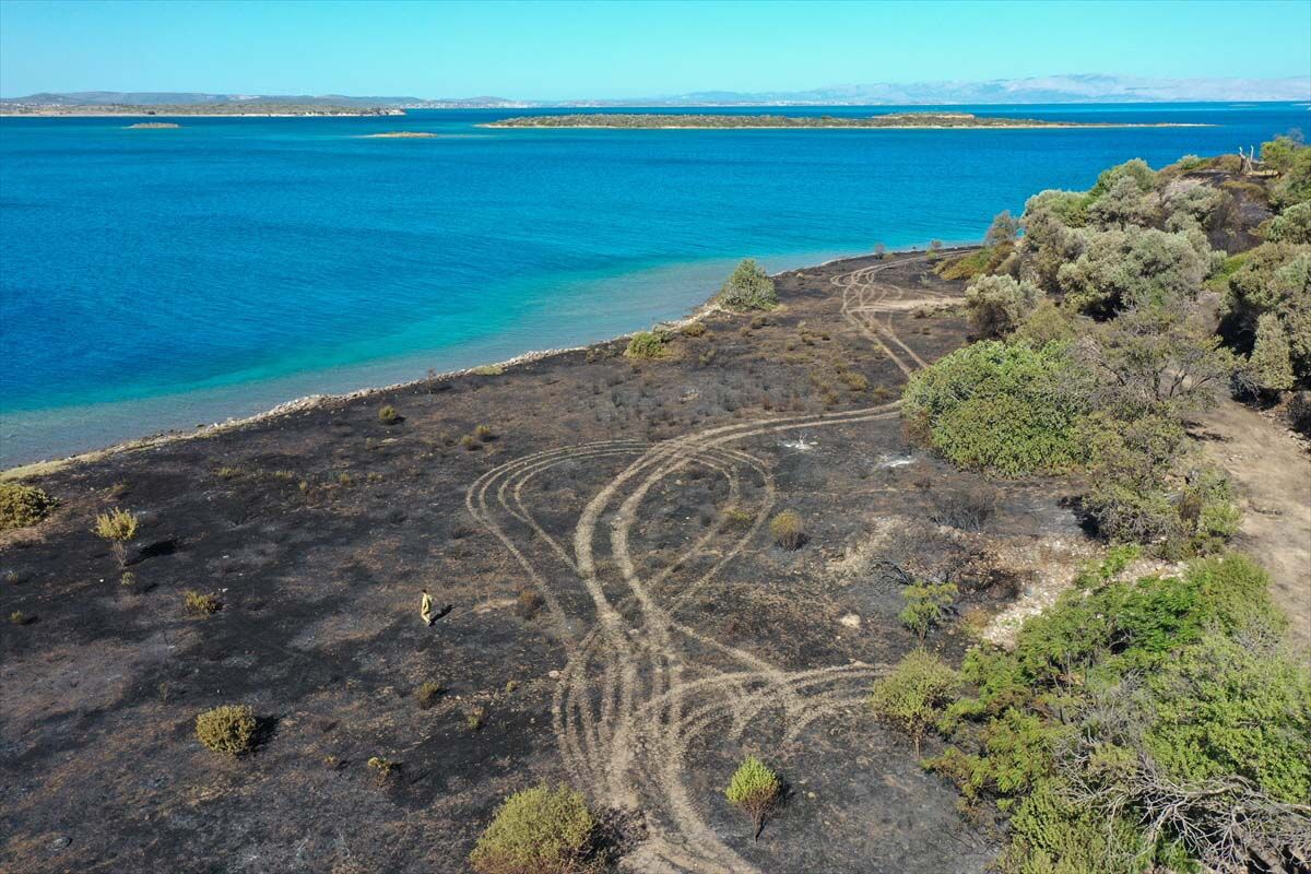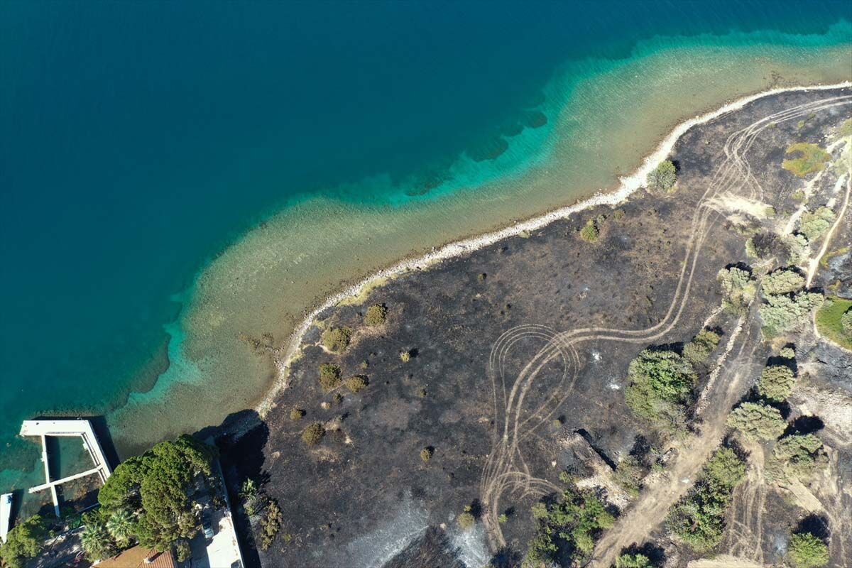 Video ve fotoğraflarda yangının, yer yer maki ağaçlarının olduğu deniz kıyısına yakın otluk alanda etkili olduğu ve konutlara çok yaklaştığı görülüyor.
