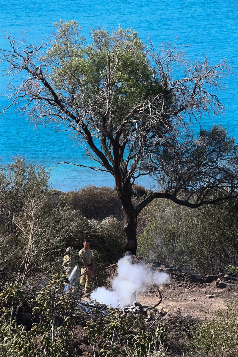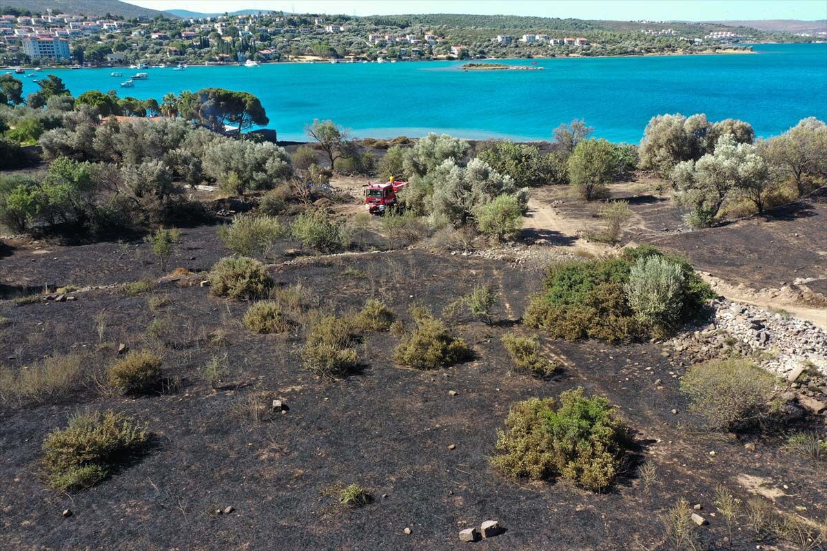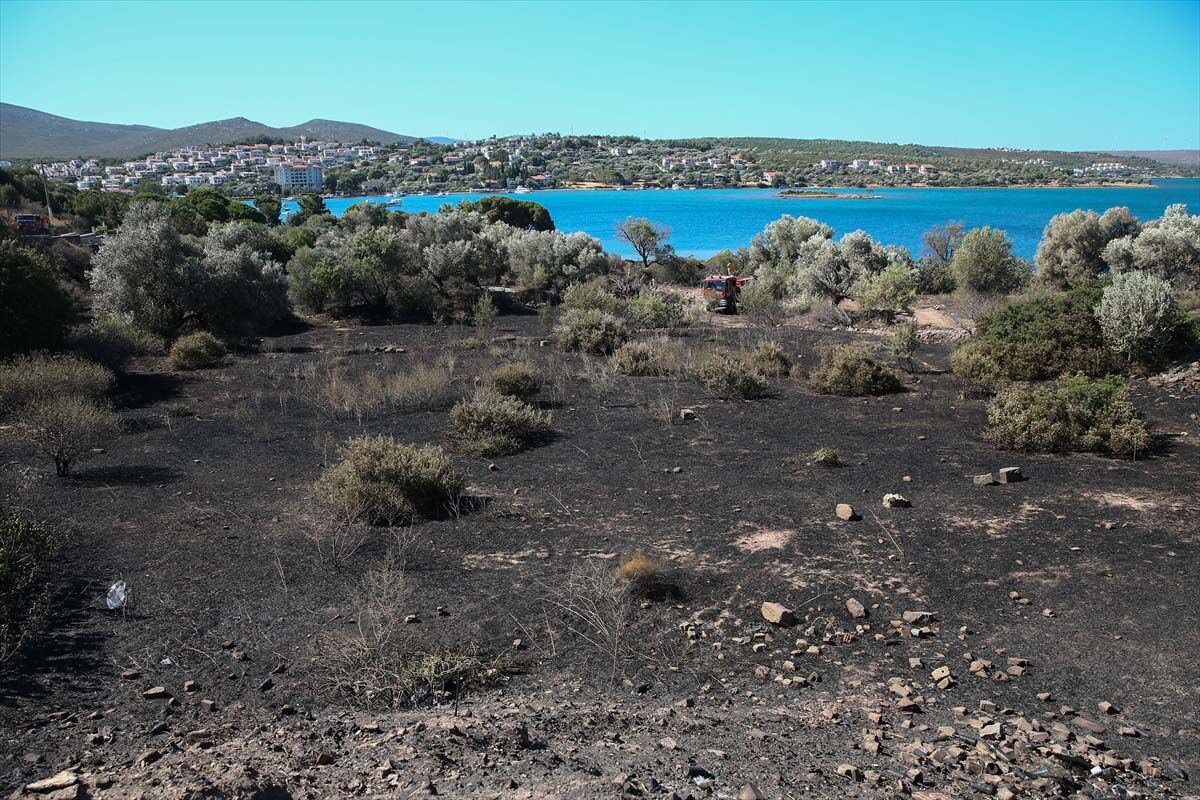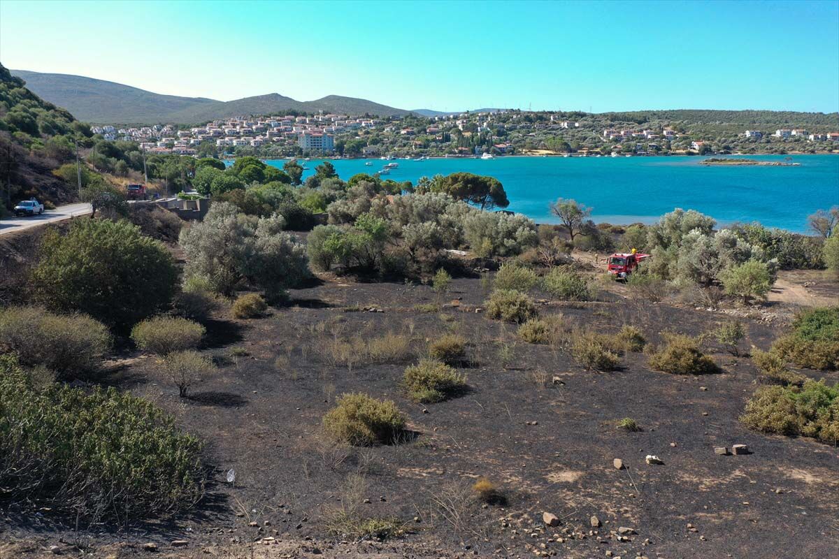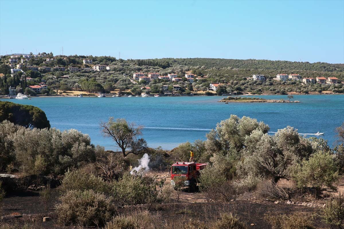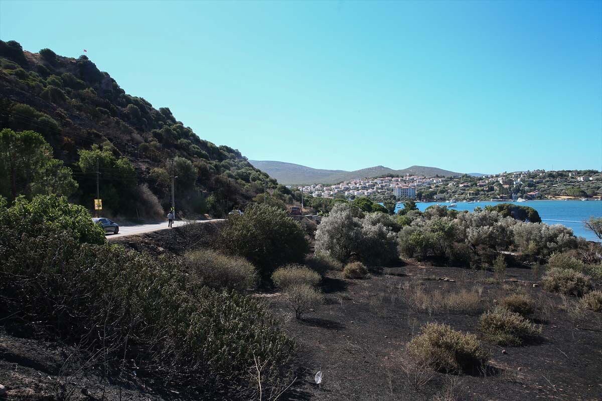 İzmir'in Çeşme ilçesinde dün gece yanan otluk alanda soğutma çalışmalarına devam ediliyor.