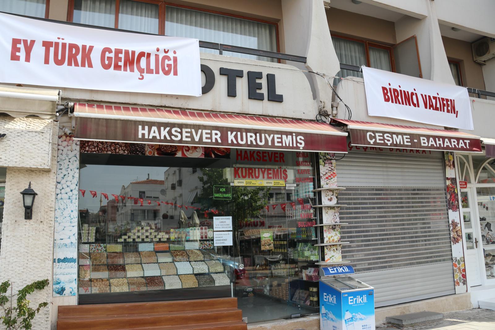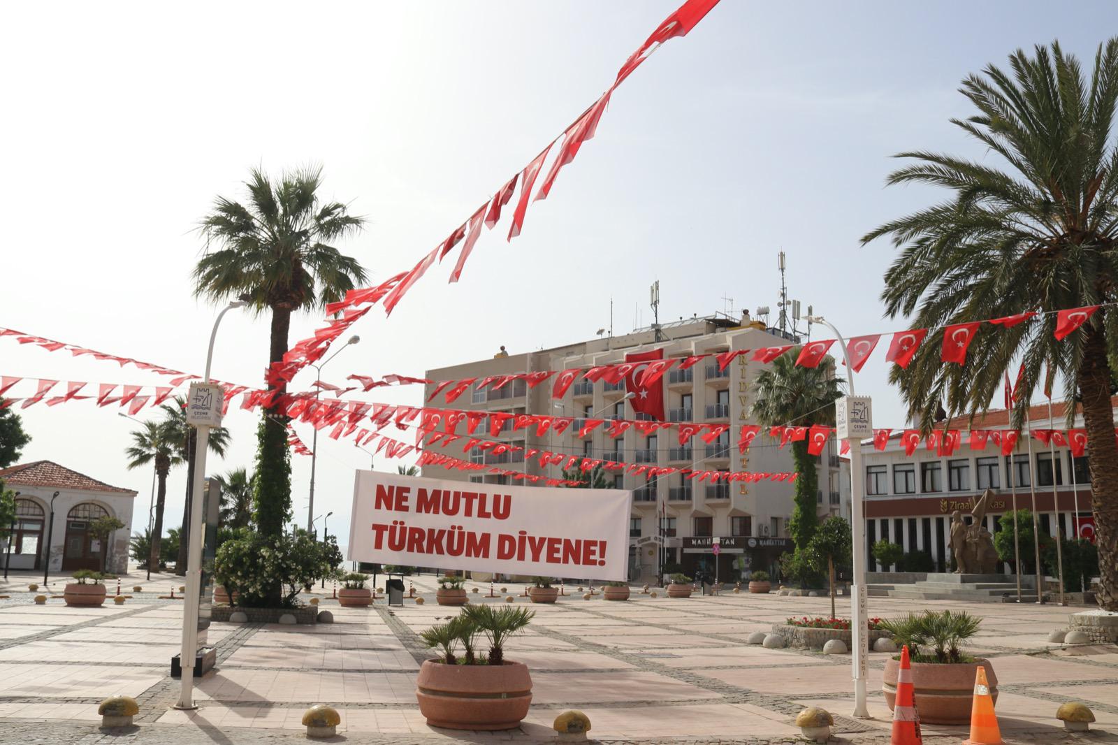 Çeşme Belediyesi 19 Mayıs Atatürk’ü Anma Gençlik ve Spor Bayramı öncesi sokakları ve caddeleri “Atatürk’ün Gençliğe Hitabesi” sözlerinin yazılı olduğu pankartlarla ve Türk Bayraklarıyla süsledi.