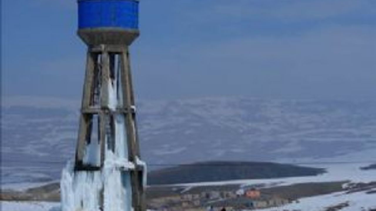 Van'da dondurucu soğuklar nedeniyle boruları patlayan su deposu, akan suların donmasıyla buz kulesine dönüştü.