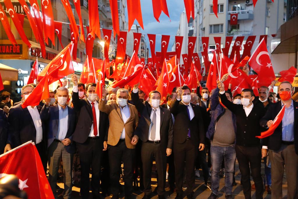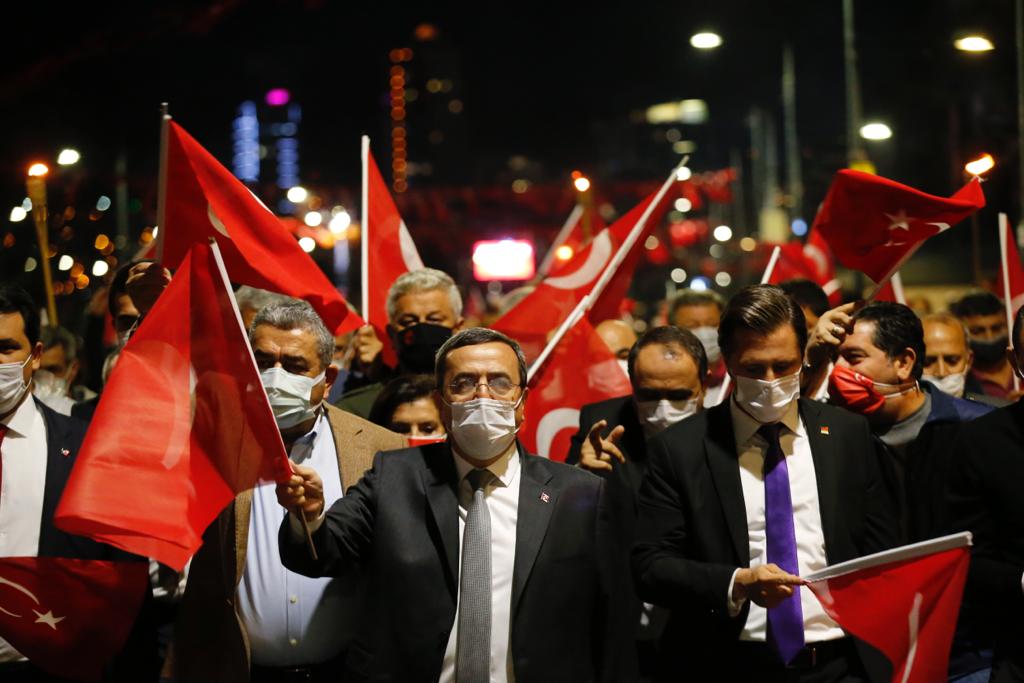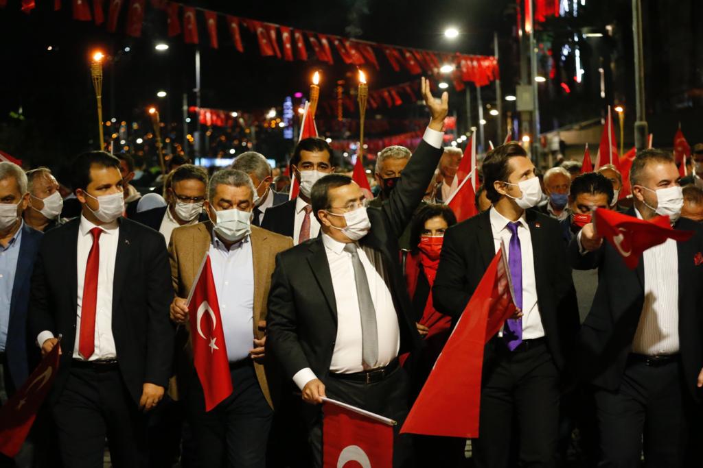 Konak’ta Cumhuriyet Bayramı, Türk Bayraklarıyla süslenerek kırmızı beyaza bürünmüş Kıbrıs Şehitleri Caddesi’nden başlayıp Cumhuriyet Meydanı’na uzanan meşaleli yürüyüş ile kutlandı.