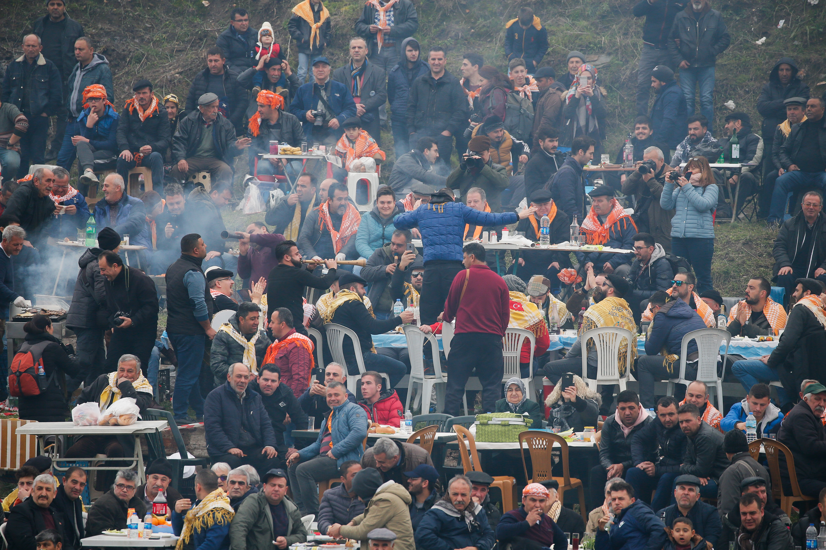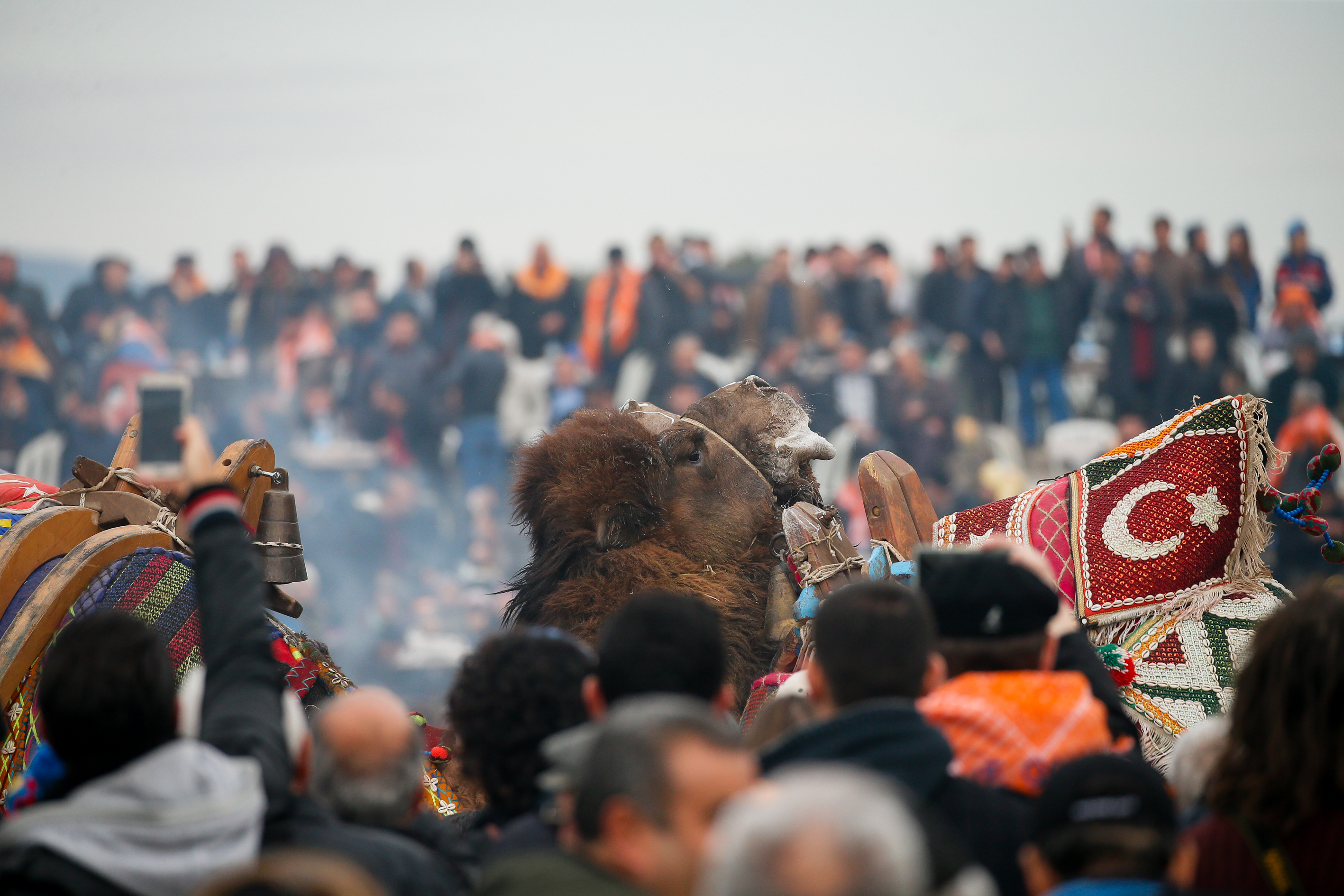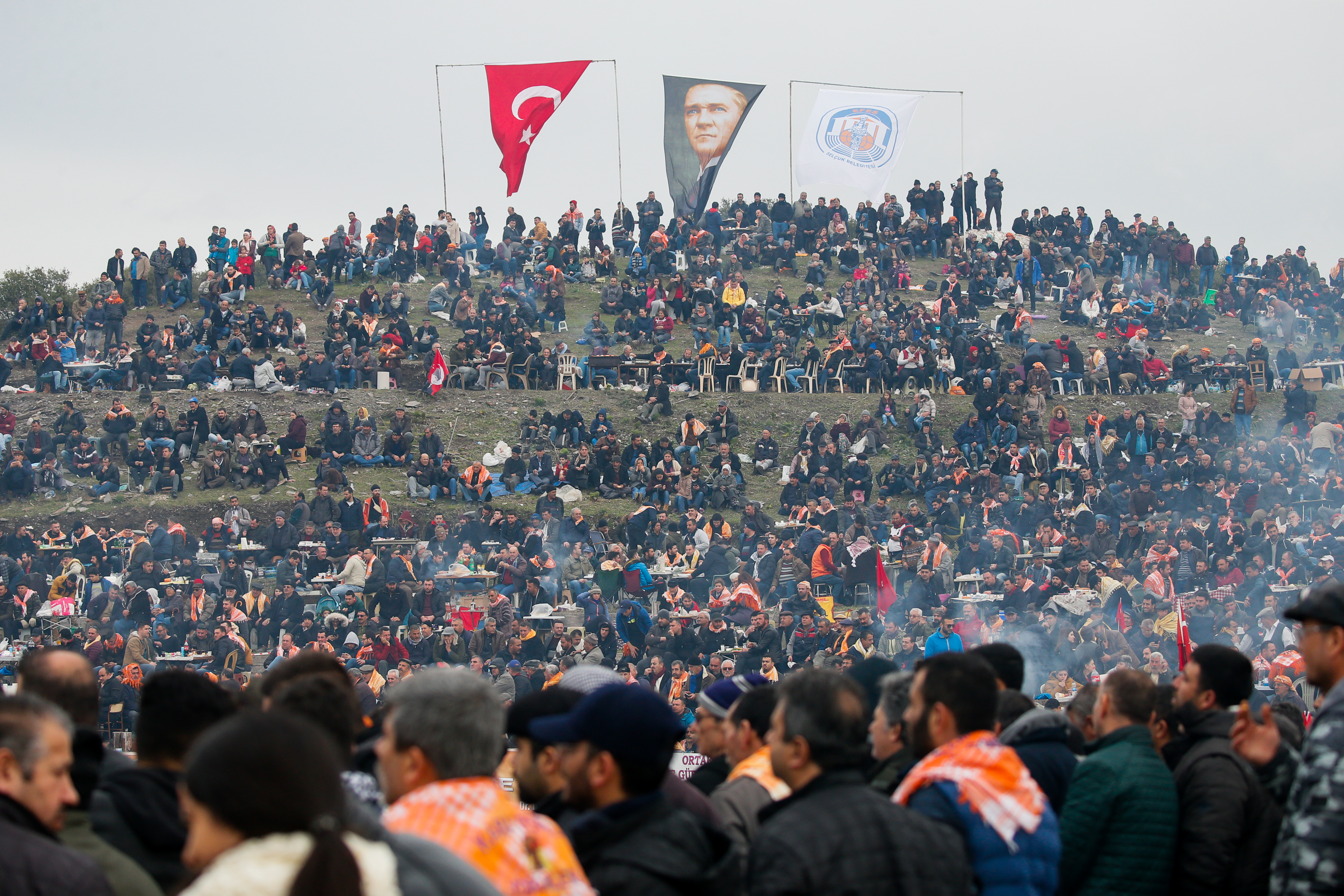 Deve güreşi meraklıları güreşleri izlemek için sahayı çevreleyen yamaçları, günün erken saatlerinden itibaren doldurdu.