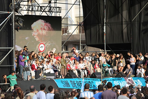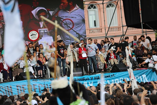 Öğle saatlerinde Plaza de Mayo Anneleri ve Büyükanneleri, sol partiler ve Kirchnerci grupların organize ettiği yürüyüşte, çok sayıda kişi katıldı.