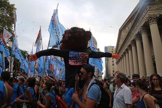 Sık sık slogan atan kalabalık sağcı Macri hükümetini ve resmi bir ziyaret için ülkede bulunan ABD başkanı Barack Obama'yı da protesto ettiler.