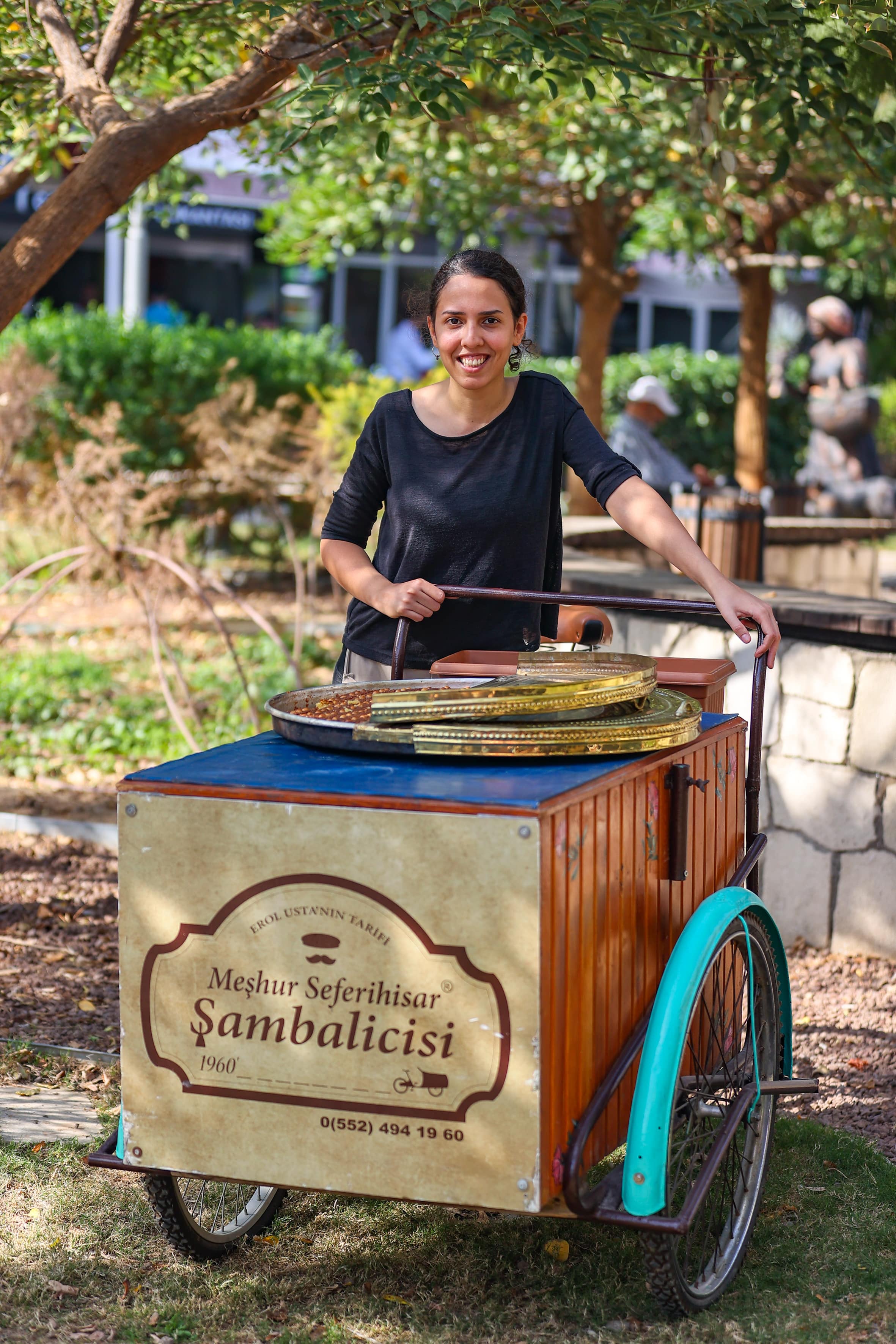 Seferihisar'da yaşayan şambali ustası Erol Ulus, 1960'lı yıllarda bakır tepsi ile başladığı mesleğini bir müddet sonra üç tekerlekli bisiklete taşıdı.