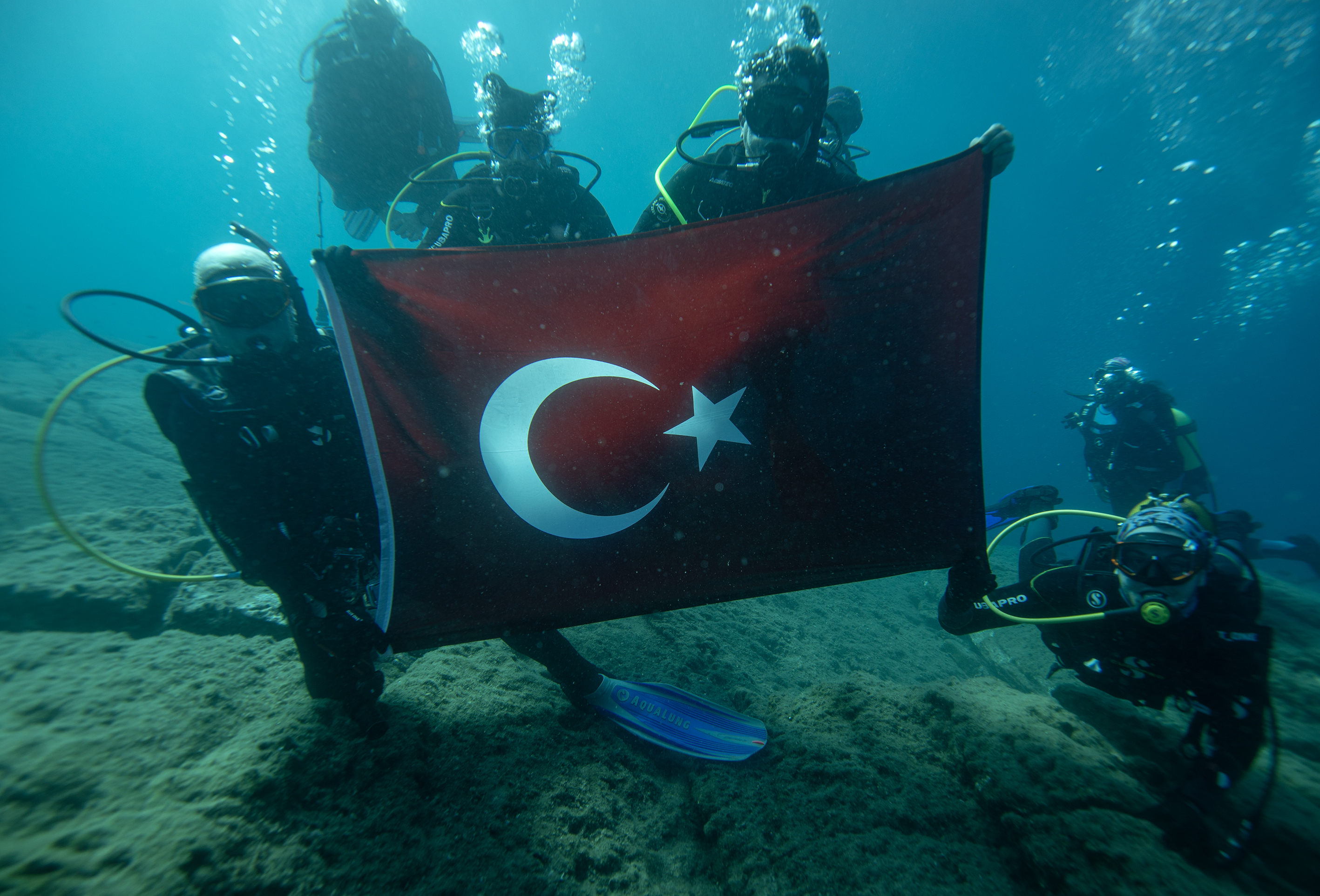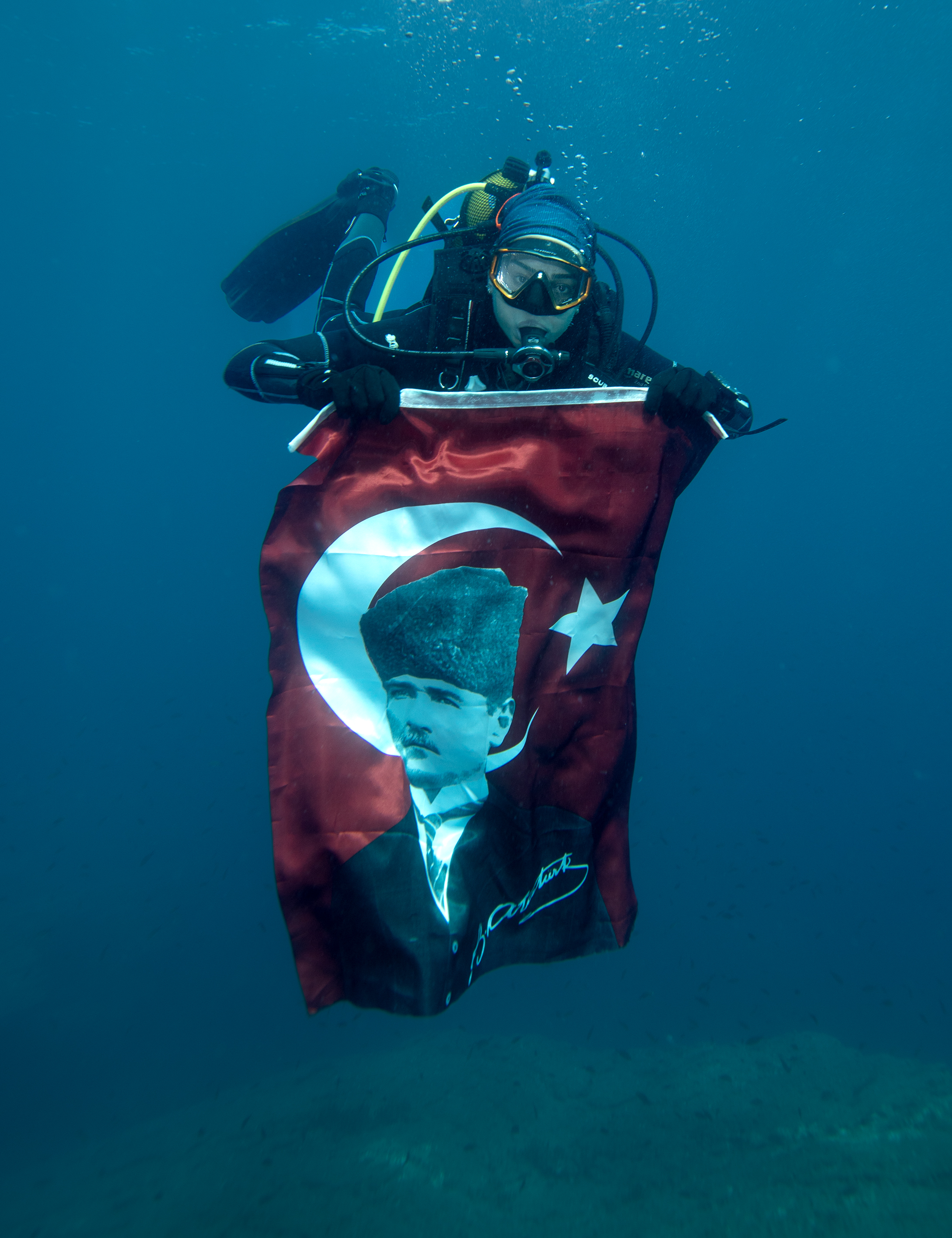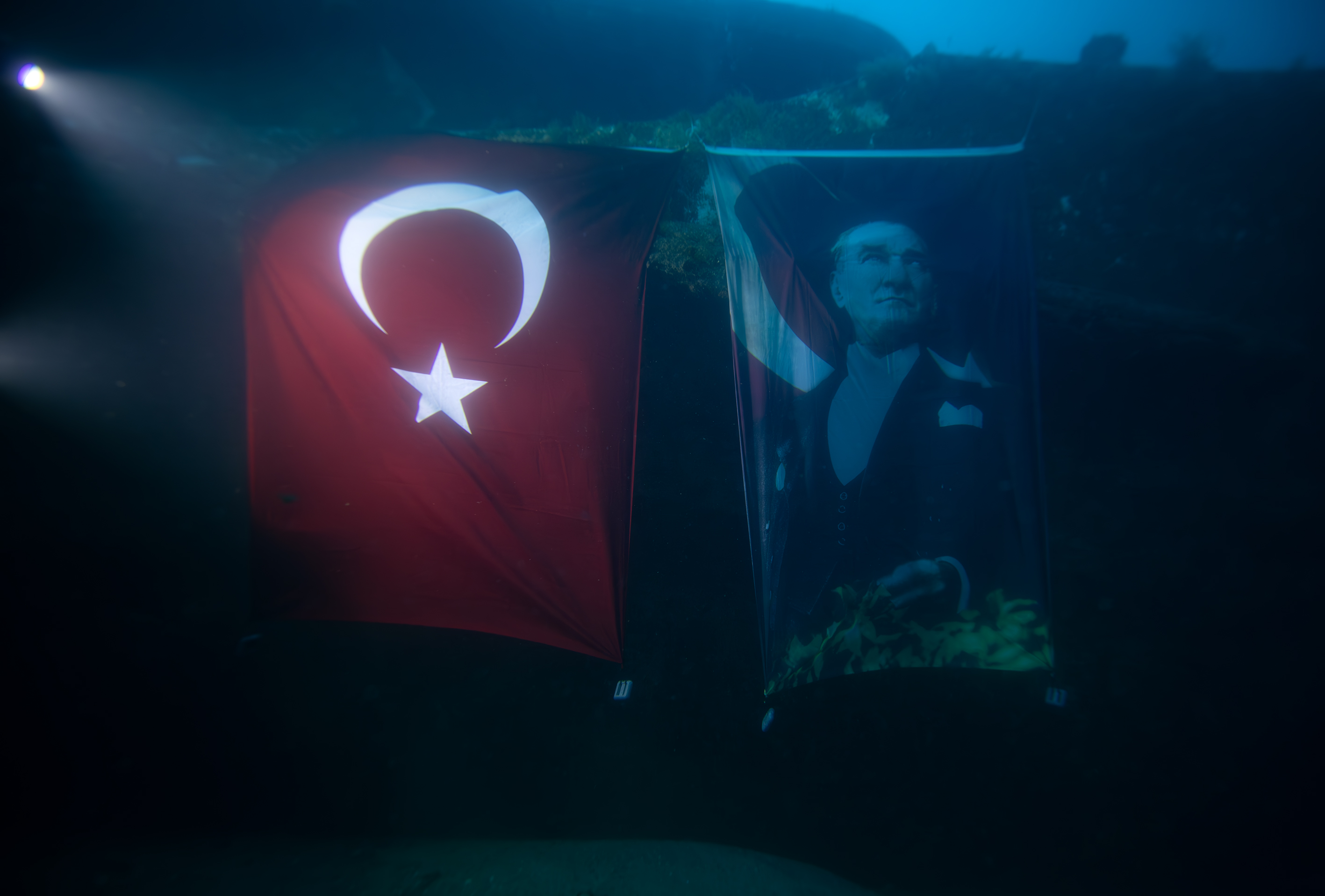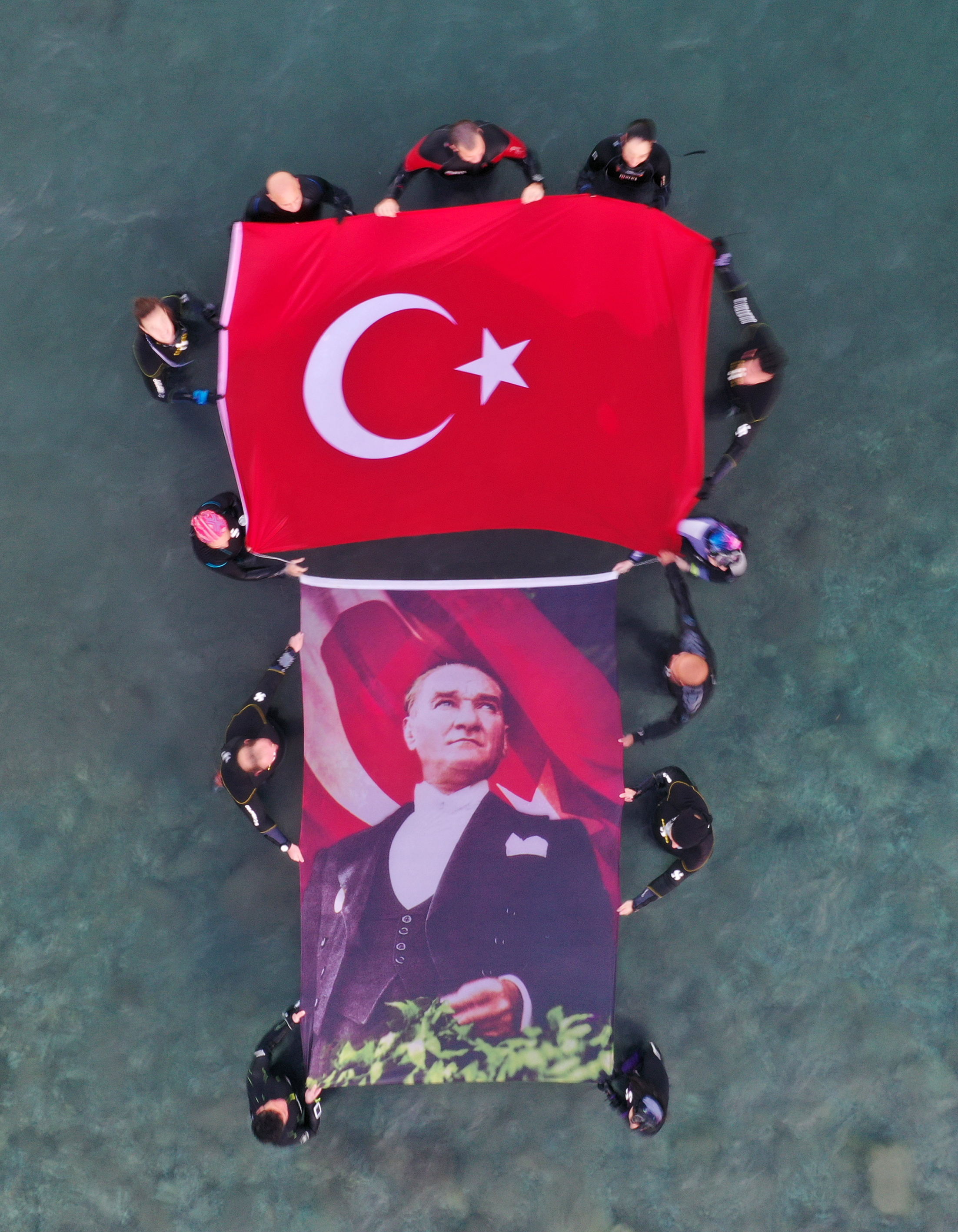 İzmir'in Karaburun ilçesinde bir grup dalgıç, Cumhuriyet'in 100. yıl dönümü etkinlikleri kapsamında su altında Türk bayrağı ve Atatürk posteri açtı.