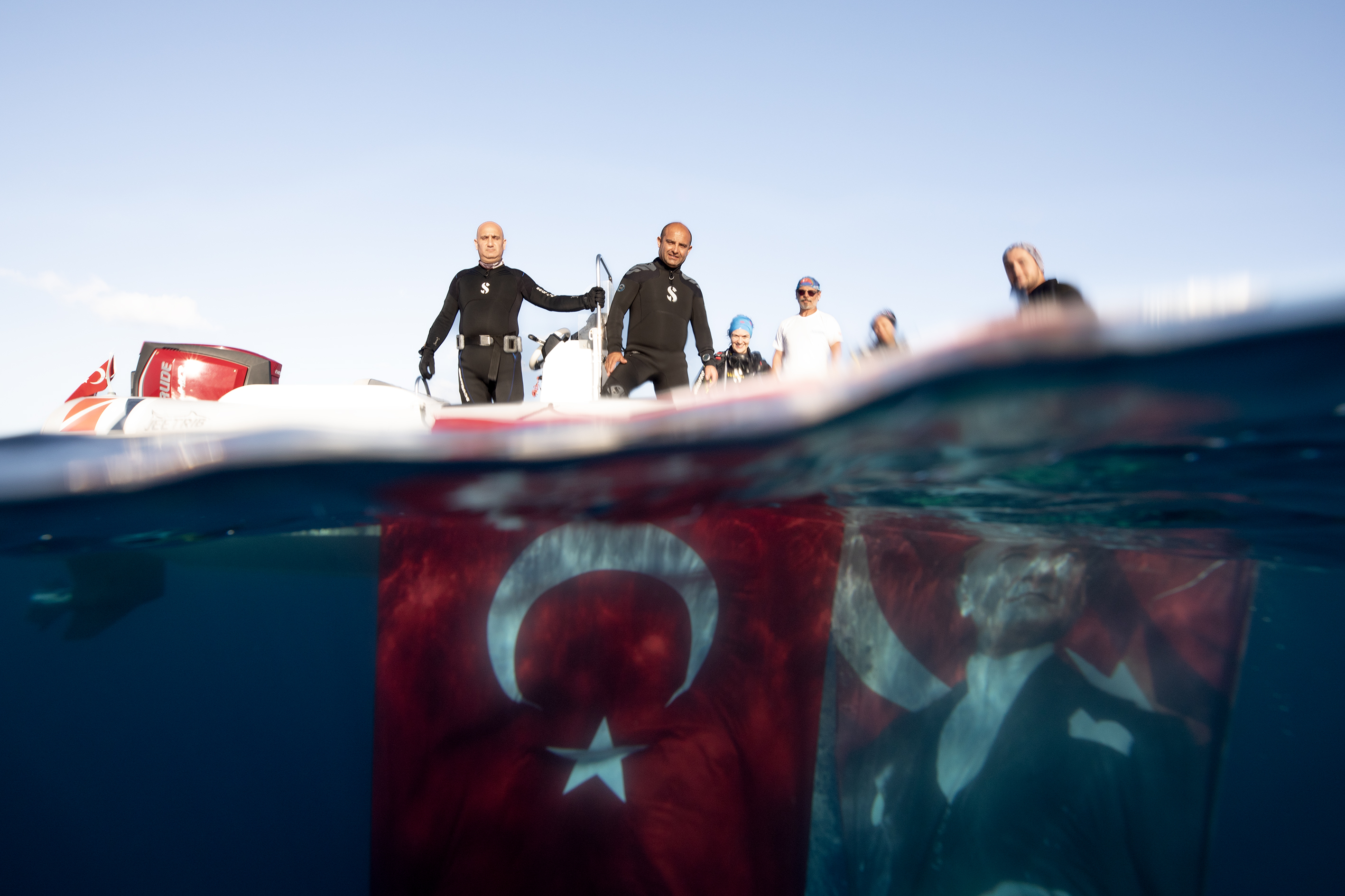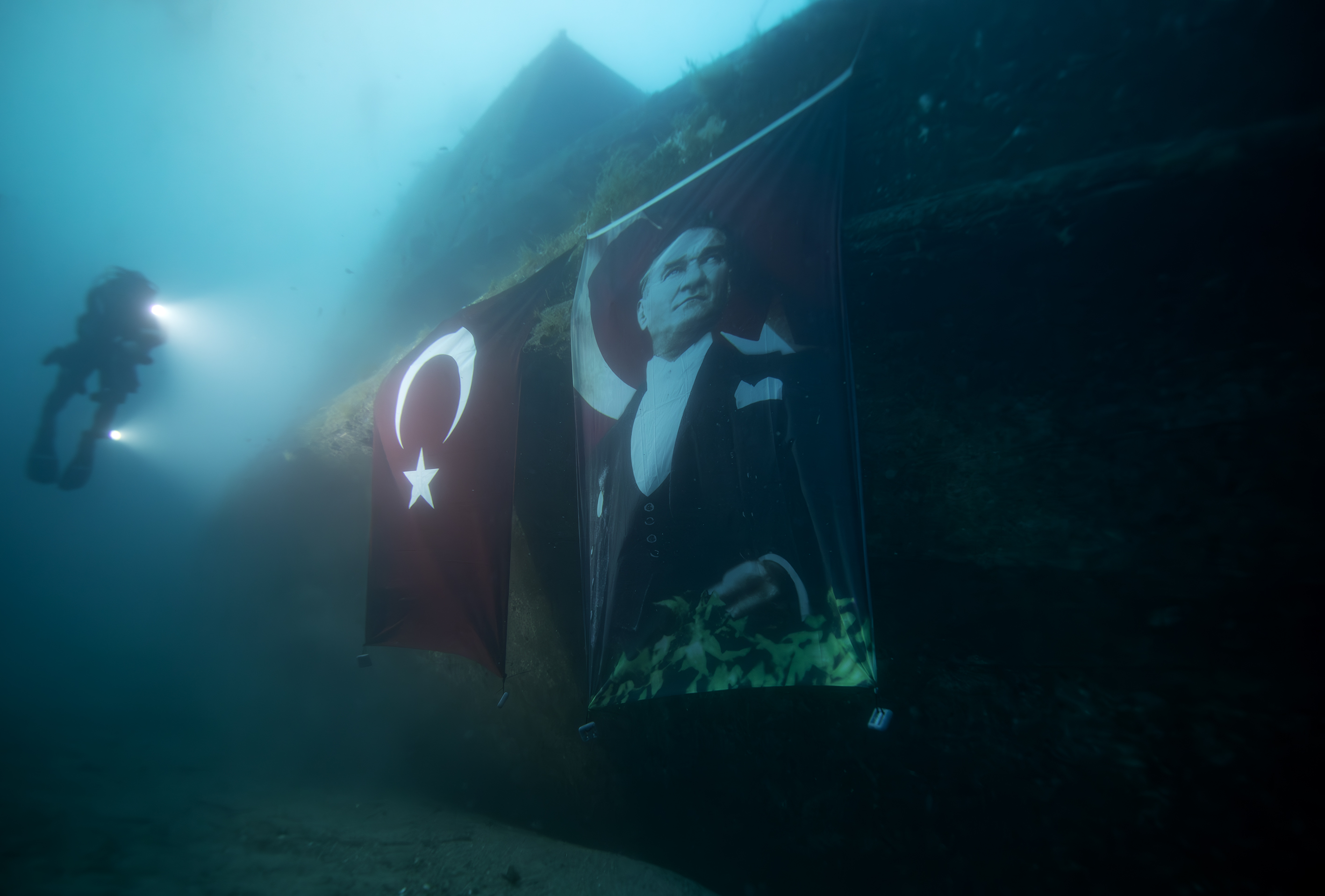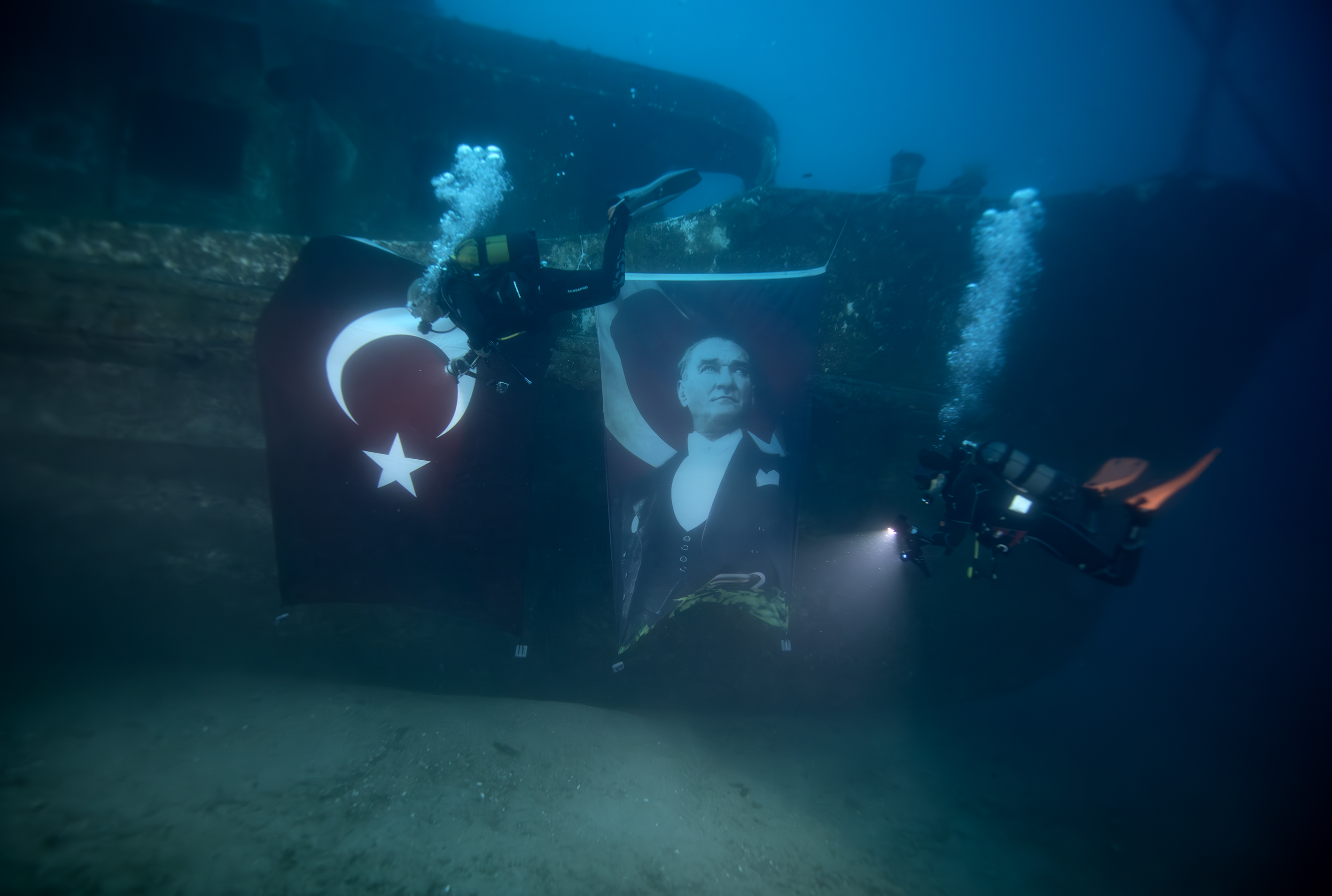 İzmir'in Karaburun ilçesinde bir grup dalgıç, Cumhuriyet'in 100. yıl dönümü etkinlikleri kapsamında su altında Türk bayrağı ve Atatürk posteri açtı.
