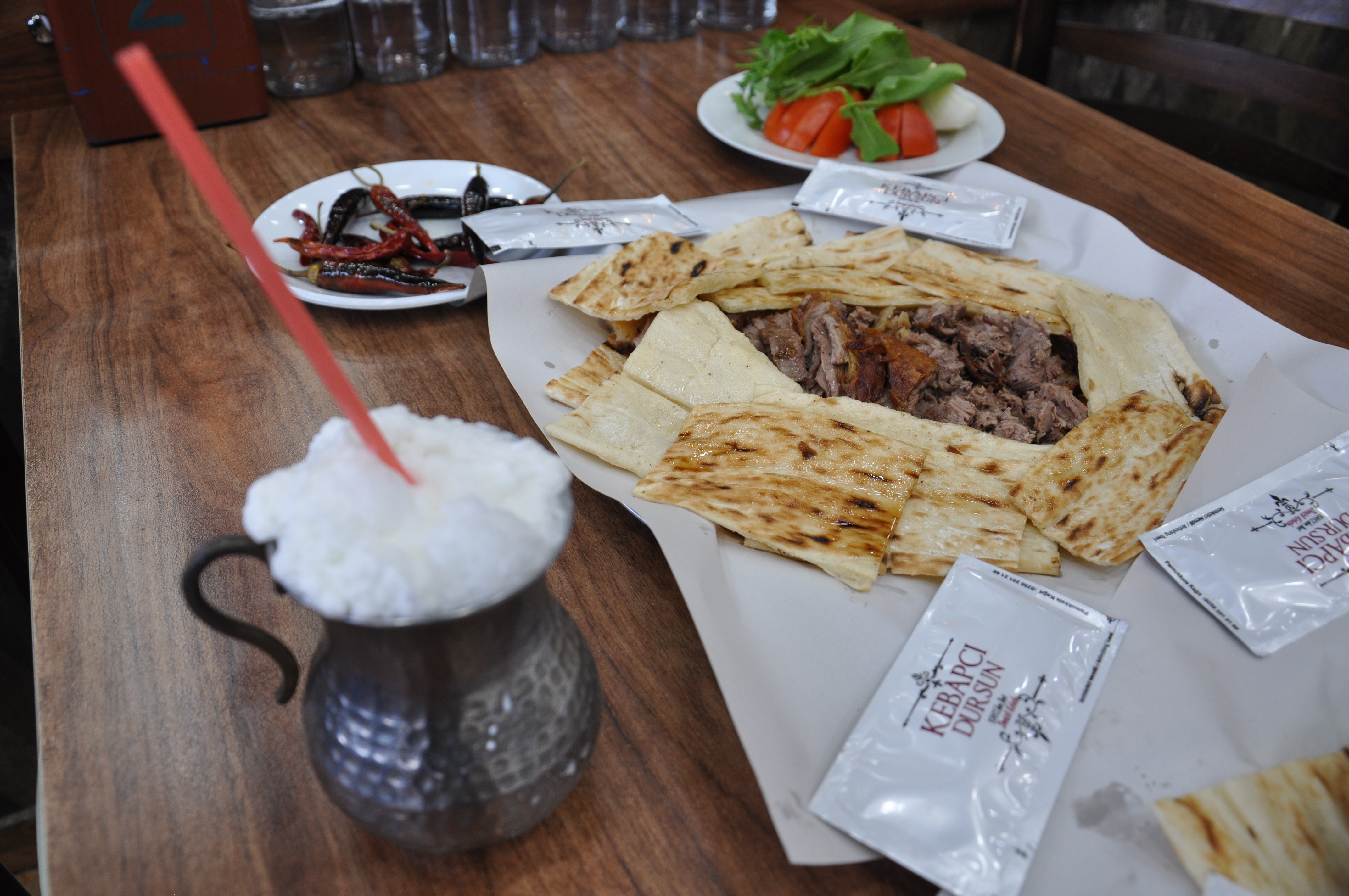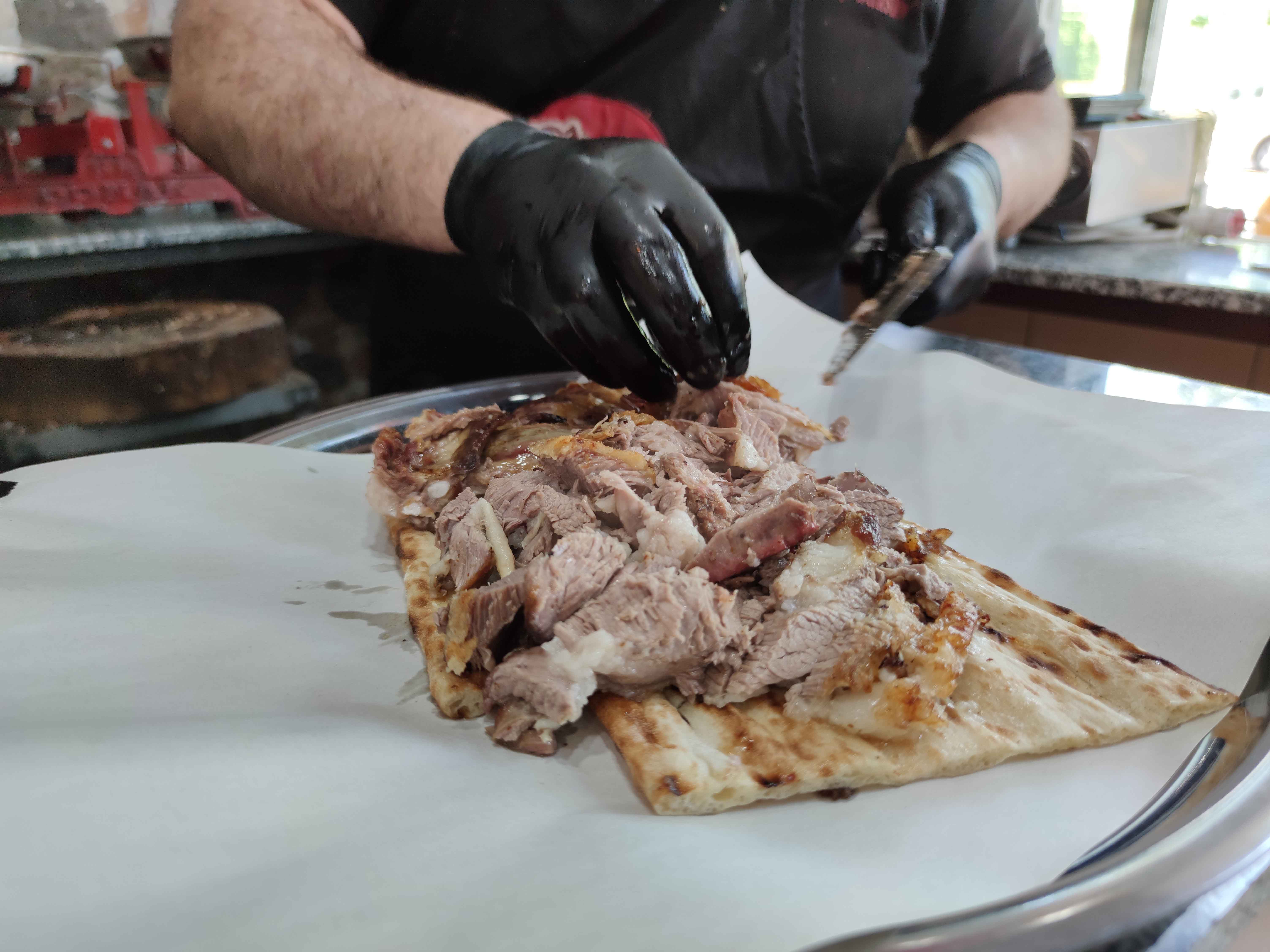 Pişen etler, çift kefeli oturak terazi ile tartıldıktan sonra tahta üzerindeki pidenin üstünde satırla kesilip pide ile birlikte servis ediliyor.