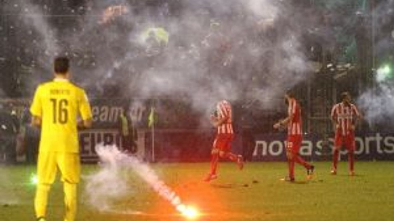 Bunun üzerine tribünlerde gerilim başladı, Panathinaikos taraftarları Marinakis'e çok sayıda meşale ve yabancı madde attı.