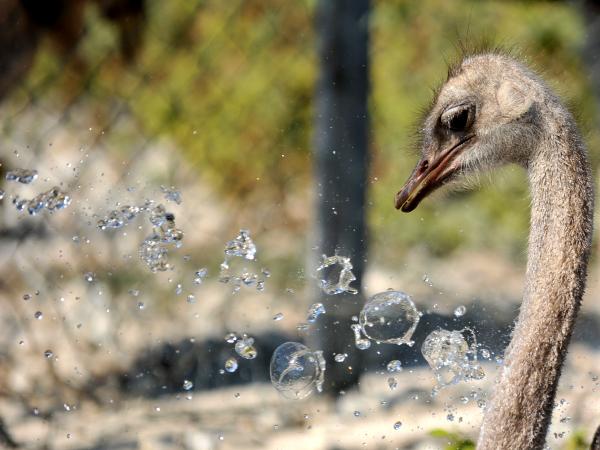 Uludağ Üniversitesi Ziraat Fakültesi'ndeki çiftlikte deve kuşları üzerine akademik çalışmalar yapılıyor. Sıcak havada çiftlikteki 12 deve kuşu, bakıcısı tarafından hortumla su tutularak serinletiliyor.