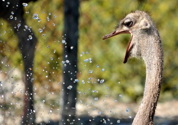 Sıcak havada deve kuşları, bakıcıları tarafından hortumla su tutularak serinletiliyor.