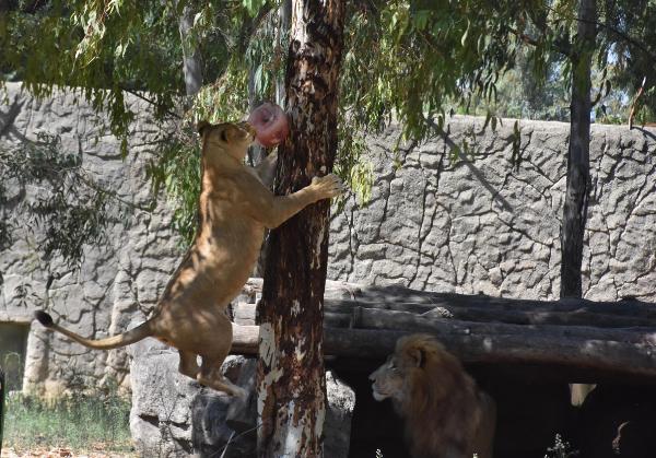 Afşin, "Aslan, kaplan ve puma gibi yırtıcı hayvanlar için tavuk ya da dana etini dondurup ağaçlara asıyoruz. Hayvanlar eti yiyor ve serinliyor. Parkımızda göletler var. Kaplanlar gölü çok iyi kullanıyor. Sıcak havada ise buzlu et tüketiyorlar. Kalıpların farklı bir şey olduğunu hissediyorlar ama et kokusu onları çekiyor" dedi.