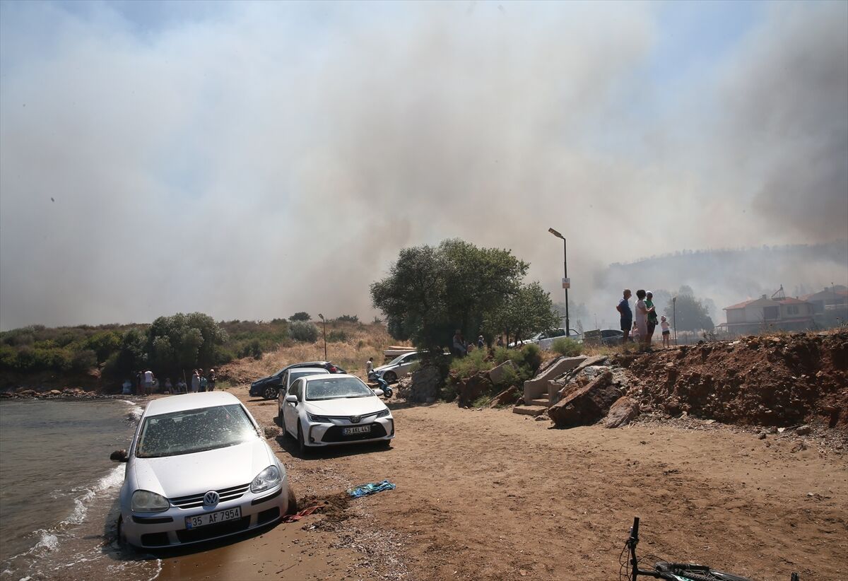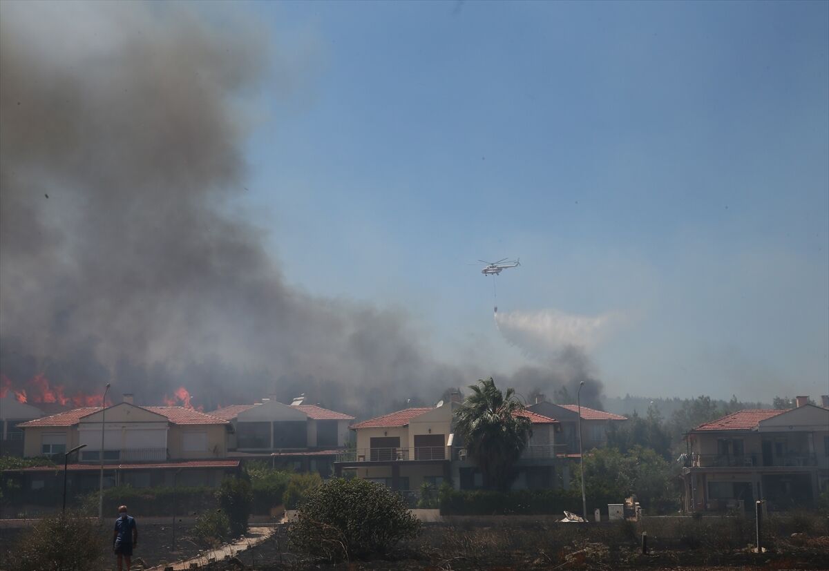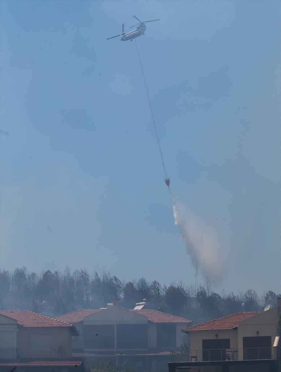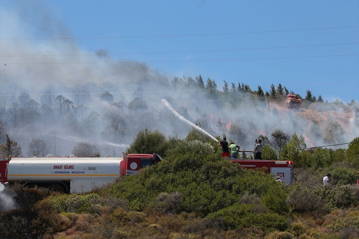 İzmir'in Seferihisar ilçesinde Doğanbey bölgesinde çıkan yangına havadan ve karadan müdahale ediliyor.