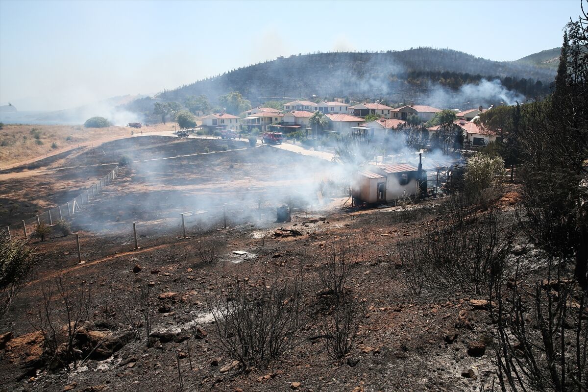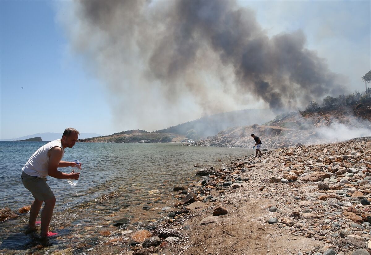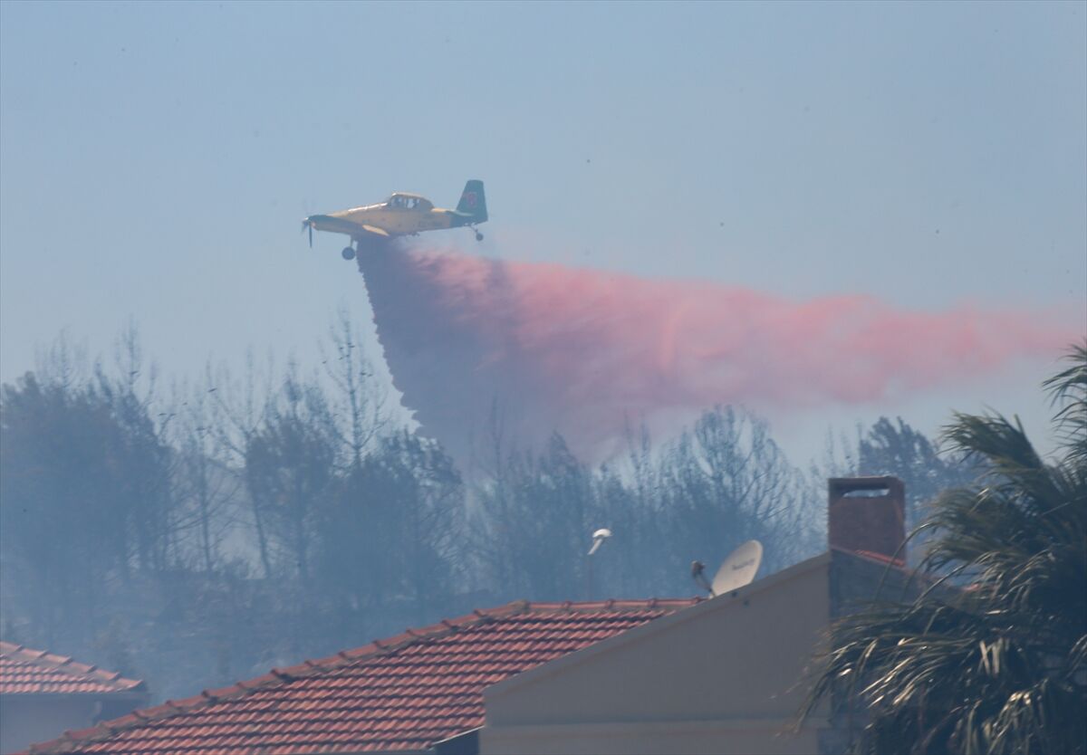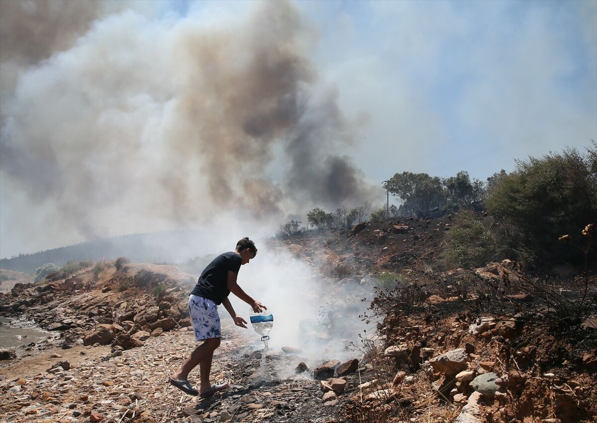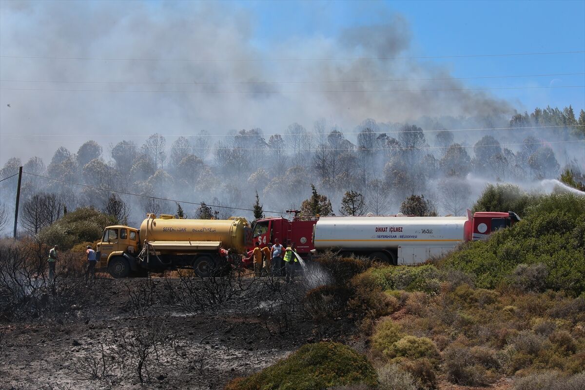 İzmir'in Seferihisar ilçesinde Doğanbey bölgesinde çıkan yangına havadan ve karadan müdahale ediliyor.
