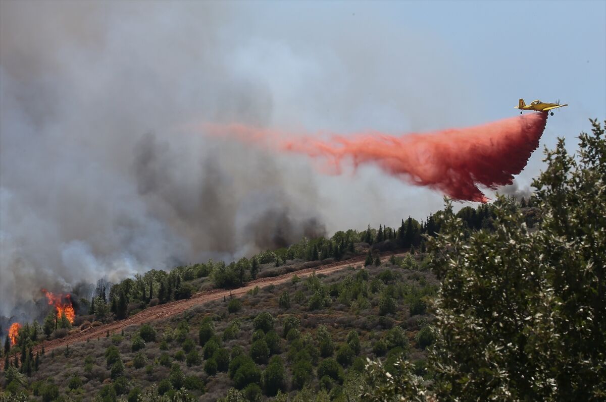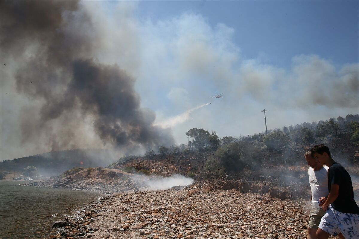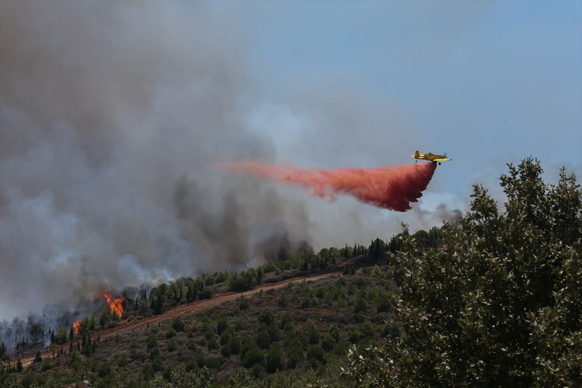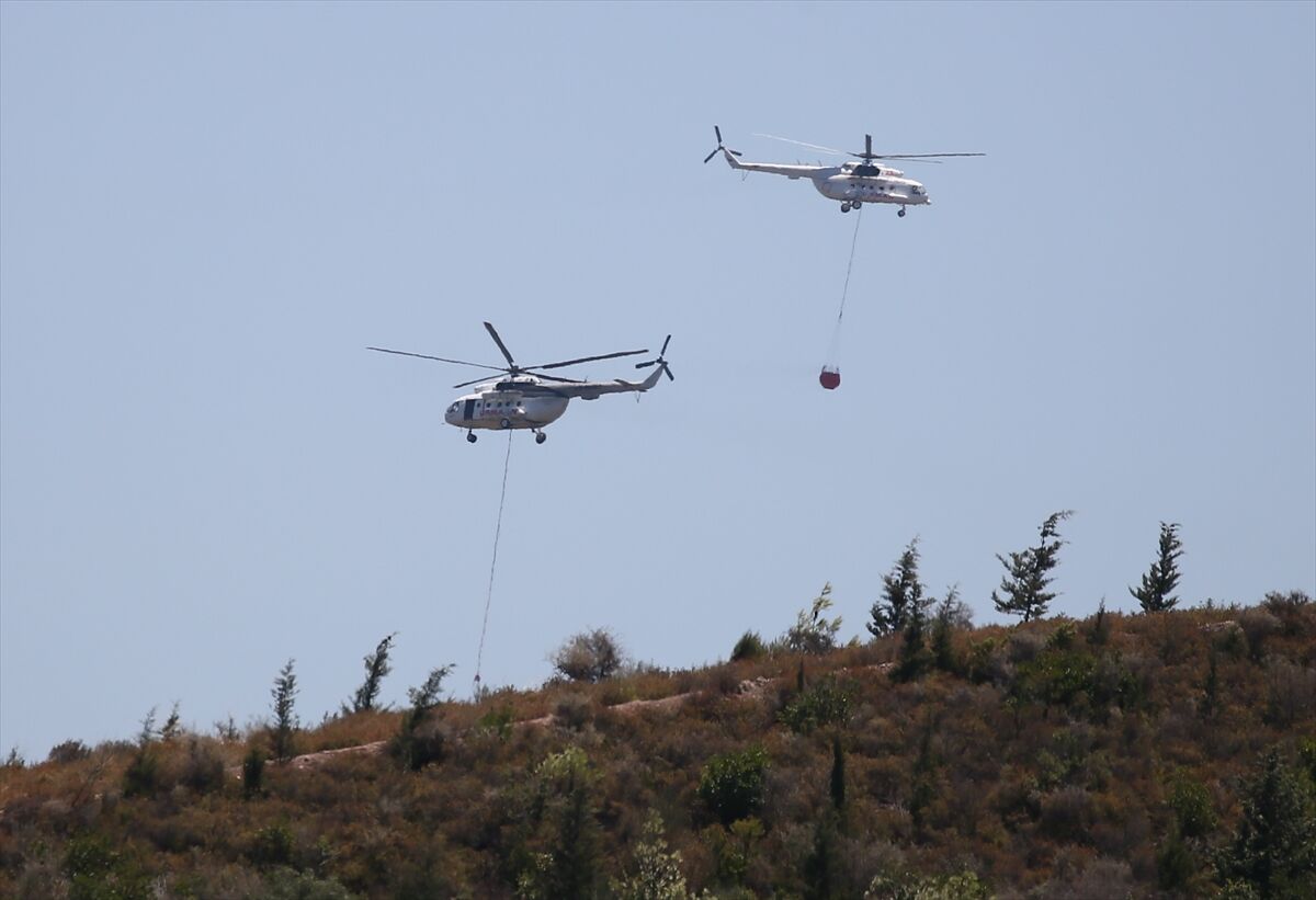 İzmir'in Seferihisar ilçesinde Doğanbey bölgesinde çıkan yangına havadan ve karadan müdahale ediliyor.