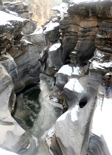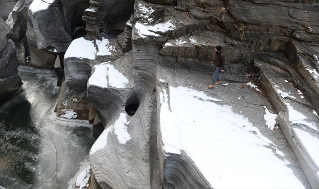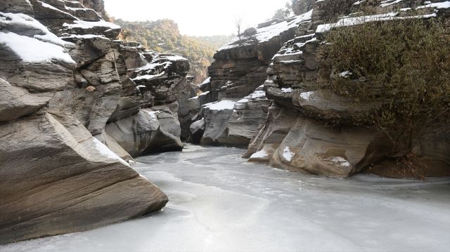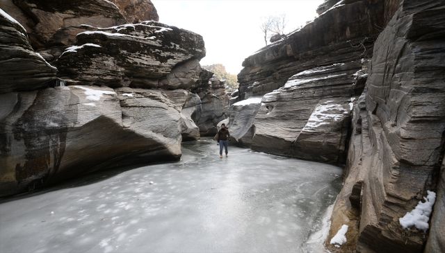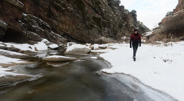 Yüzeyi buz tutan akarsuyu görmek isteyen çok sayıda kişi, vadiye geliyor.