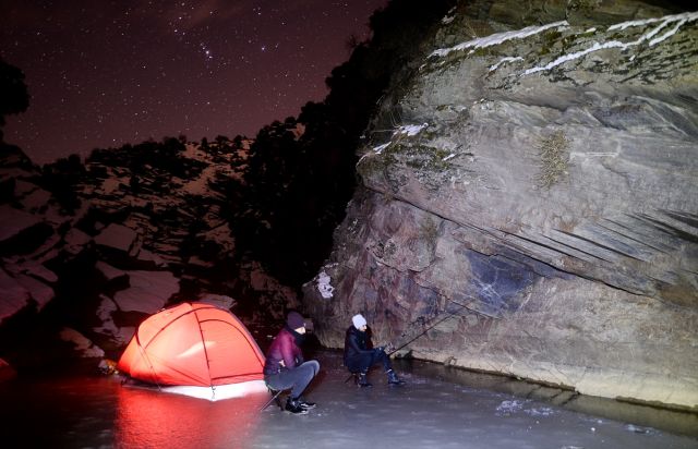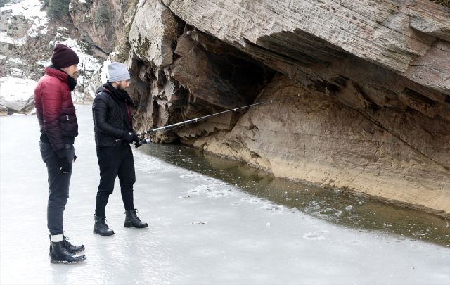 Yüzeyi donan akarsuyun üzerinde kamp kuran öğrenciler, oltayla balık tuttu.