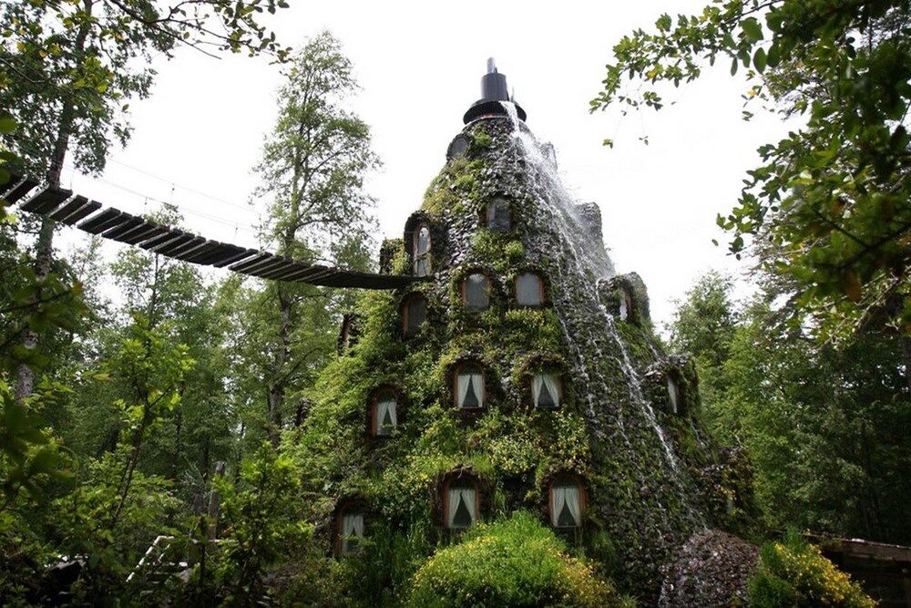 Şili’de Andes Dağı’nın eteklerindeki bu yapay dağ oteli gerçek bir sanat eseri. Montaña Mágica Lodge’un doruğundaki saklı bir kaynaktan fışkıran sular yamaçlardaki kayalara vurmadan önce, yosunlarla çevrili minik pencerelerden geçerken enfes bir görüntü oluşturuyor.