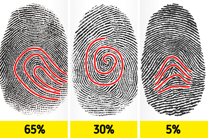 Sol tarafta yer alan parmak izi şekli, en yaygın olandır. Ardından sarmal parmak izleri gelir. Tepe şeklindeki parmak izleri ise en nadir parmak izi tipidir.