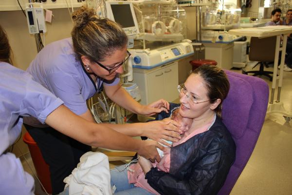 Hastanenin Yenidoğan Yoğun Bakım Servisi Sorumlu Hemşiresi Havva Gökduman, annelere büyük mutluluk yaşatan uygulamayı anlattı. Gökduman, "Kanguru bakımı annenin göğsüne bebeğinin yatırılılarak ten tene temaslarının sağlanmasıdır. Bu yöntem, prematüre bebeğin dış ortama uyumunu kolaylaştırıp, sakinleşmesini ve anne-bebek arasındaki duygusal bağın kurulmasını sağlıyor" dedi.