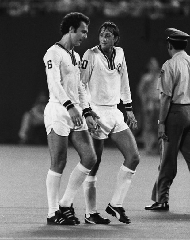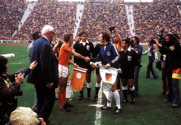 1974 FIFA Dünya Kupası Finali'nde Münih Olimpiyat Stadı'nda Hollanda ile Batı Almanya karşılaşması. Seremoni sırasında Johan Cruyff ve Franz Beckenbauer, solda FIFA Onursal Başkanı Stanley Rous.
