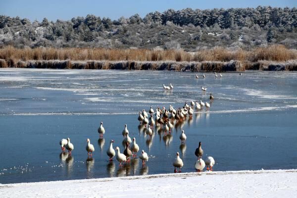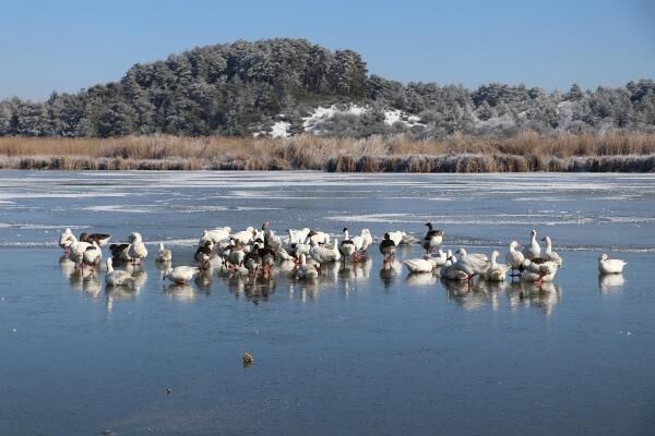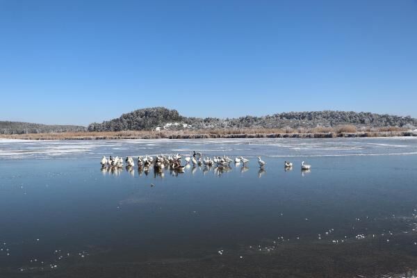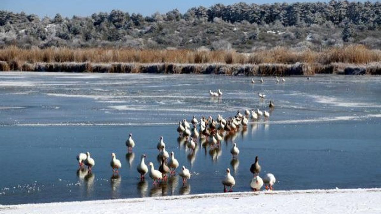 Hava sıcaklığının sıfırın altına düştüğü 50 hektarlık gölde, buz kalınlığı yaklaşık 10 santimetreye ulaştı. 180 kuş türüne ev sahipliği yapan gölün buz tutmasıyla kartpostallık görüntüler oluştu.