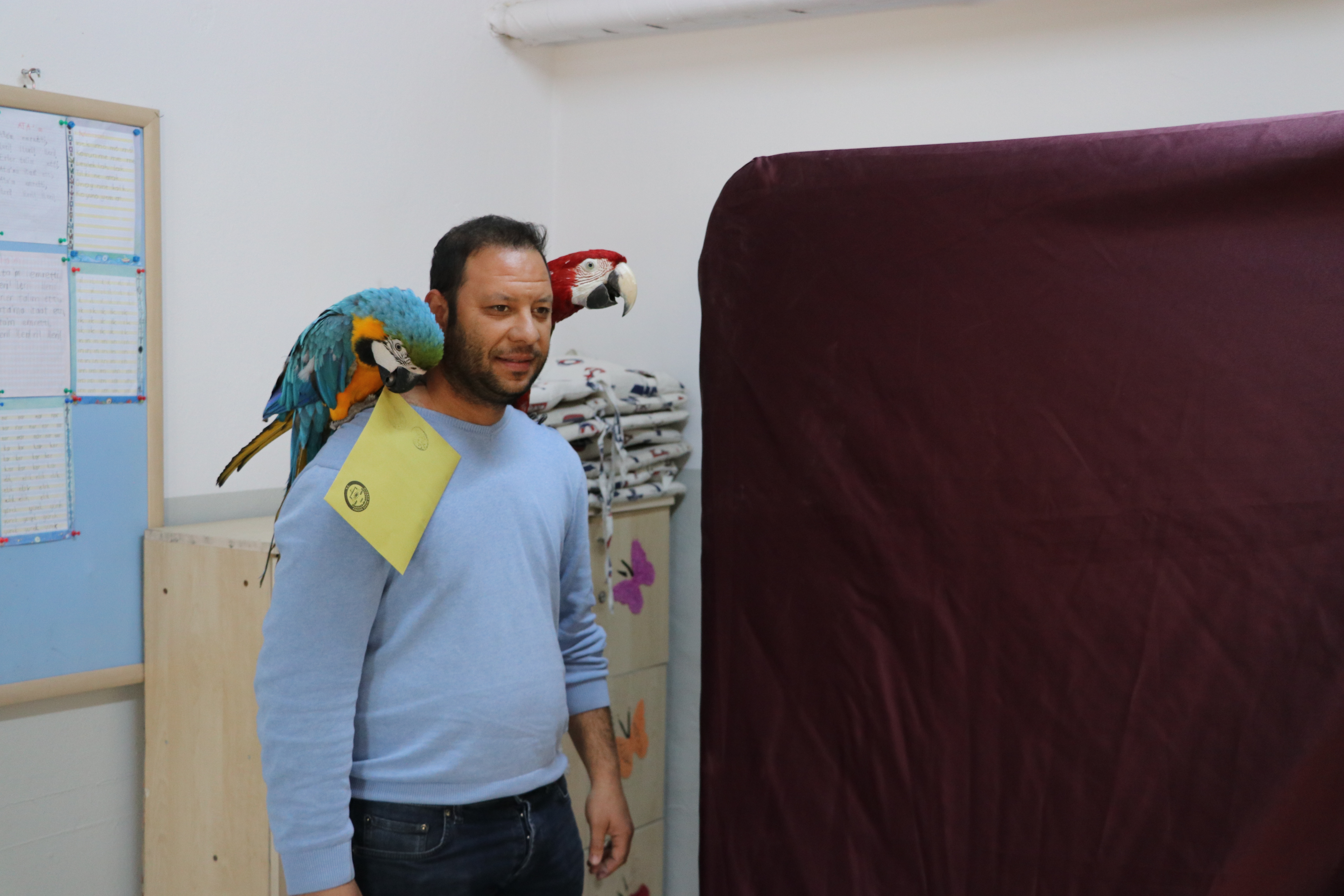 Denizli'de turizm işiyle uğraşan Mehmet Kıvılcım, evinde beslediği iki papağanıyla sandığa giderek oyunu kullandı.