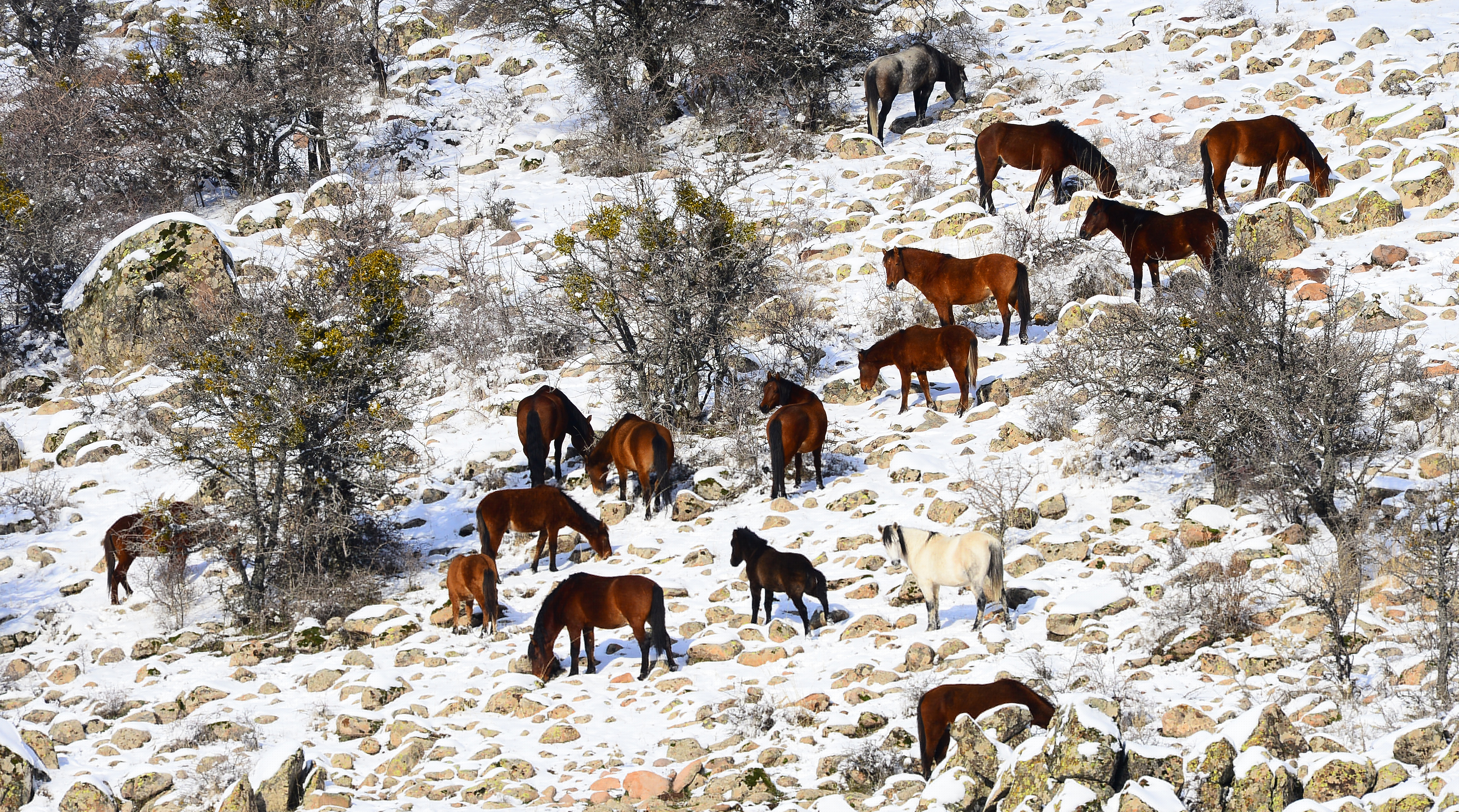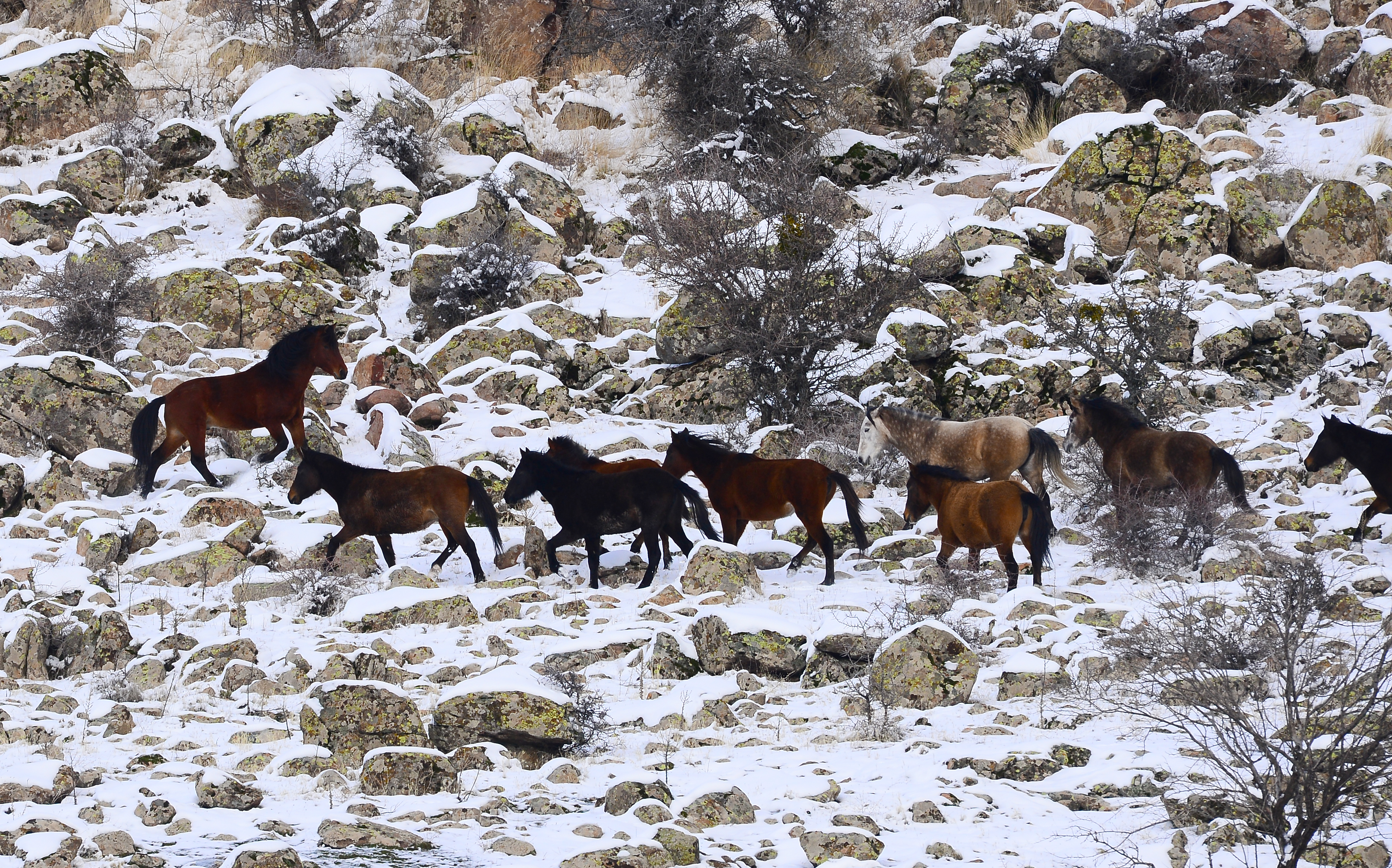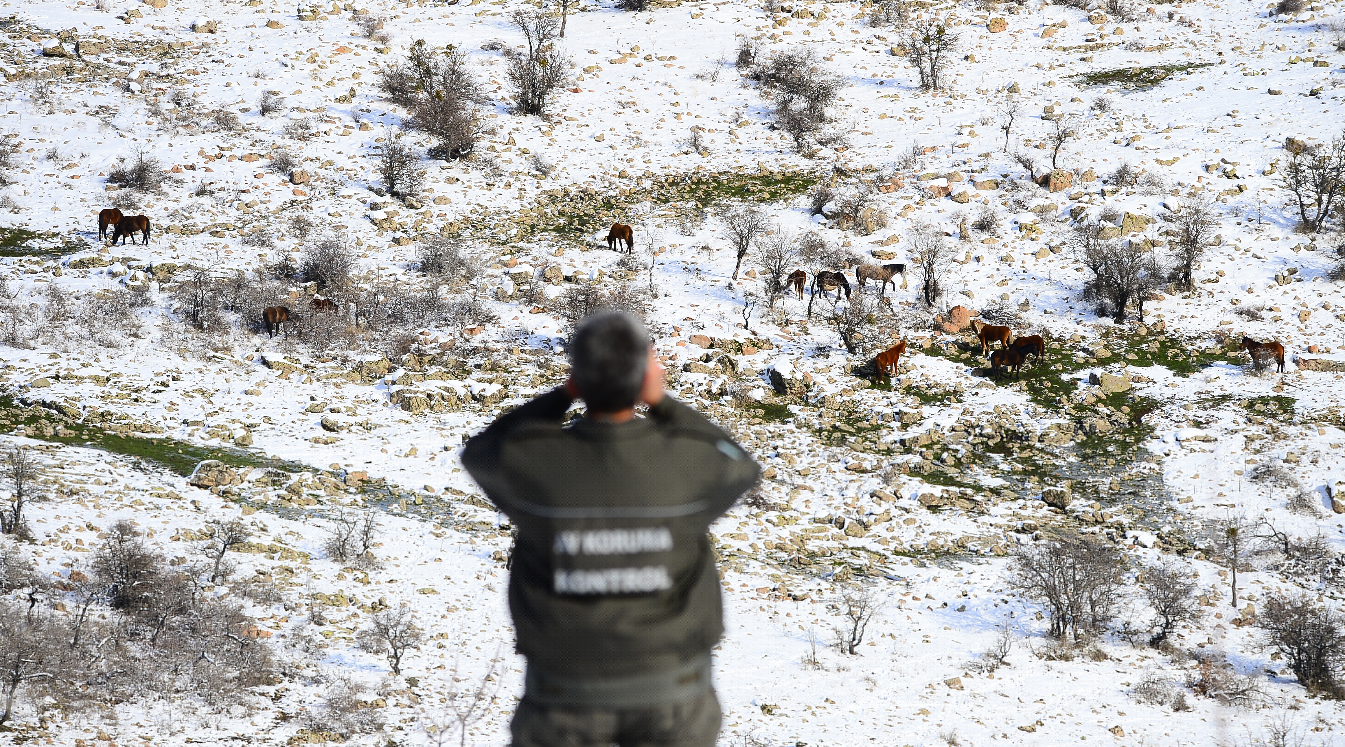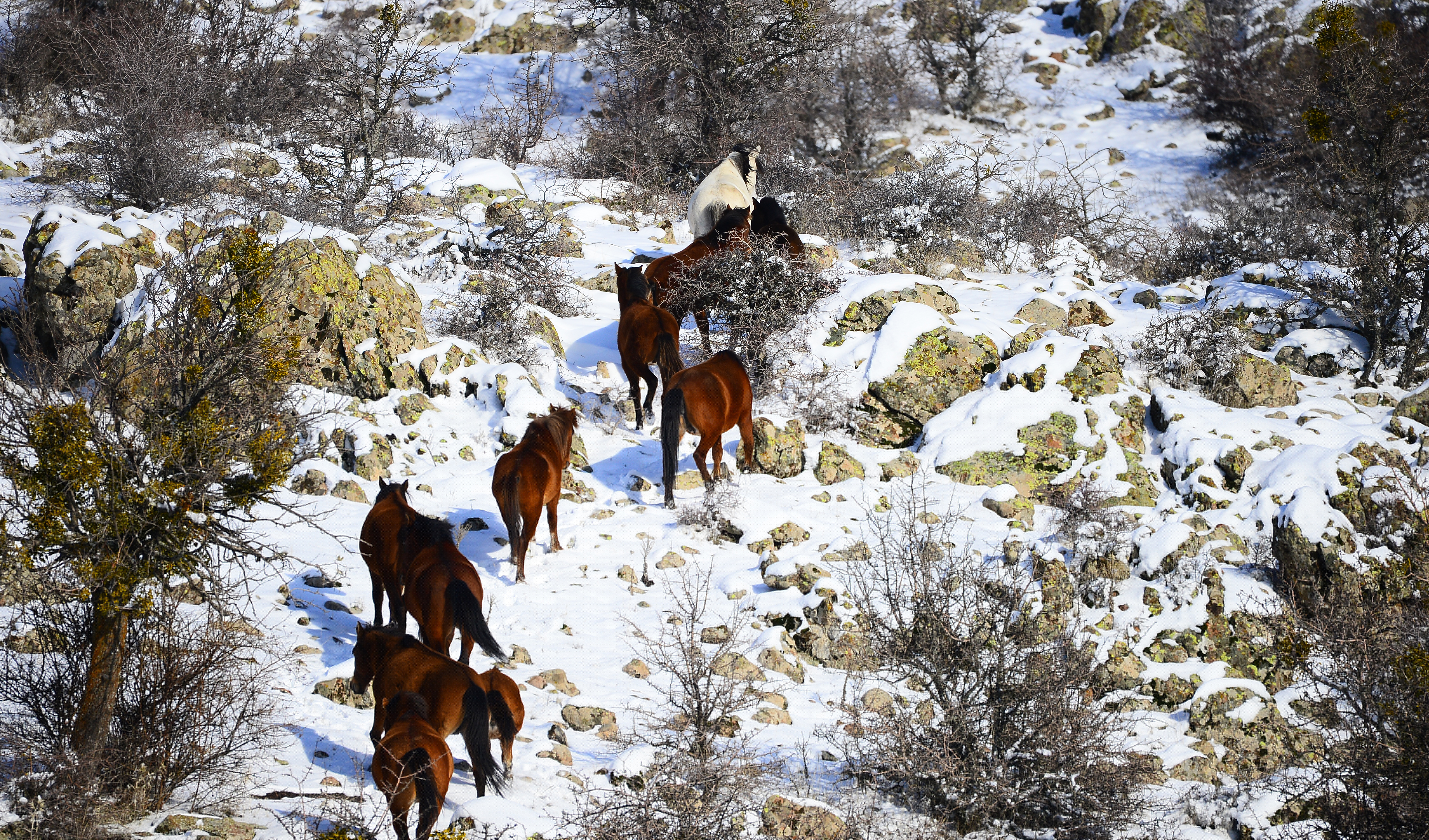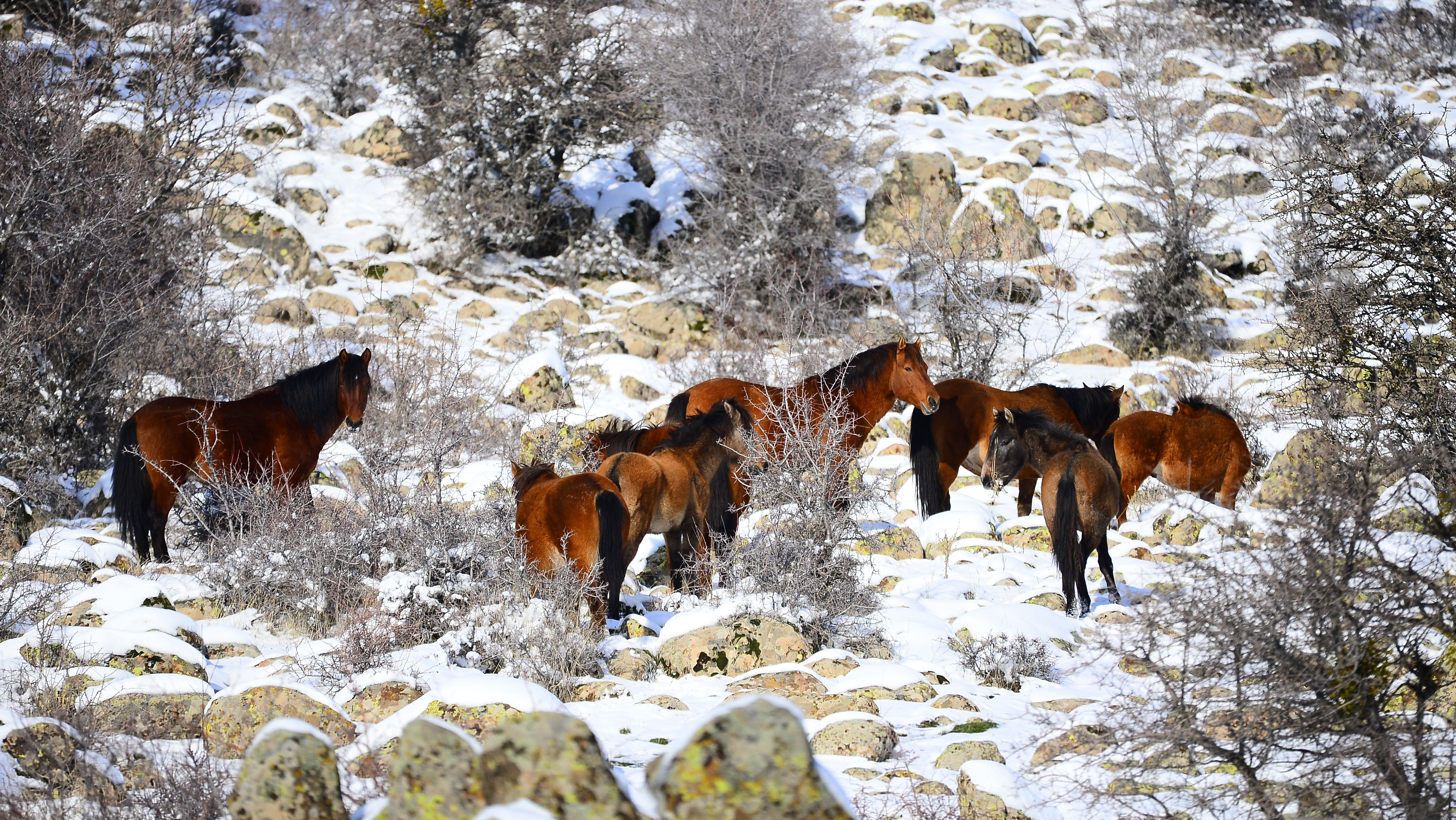 Uşak ve Kütahya sınırında yer alan Murat Dağı'nın yüksek kesimlerinde koloniler halinde yaşayan yılkı atları, kar yağışının ardından yem bulmak ve soğuktan korunmak için dağın eteklerine indi.