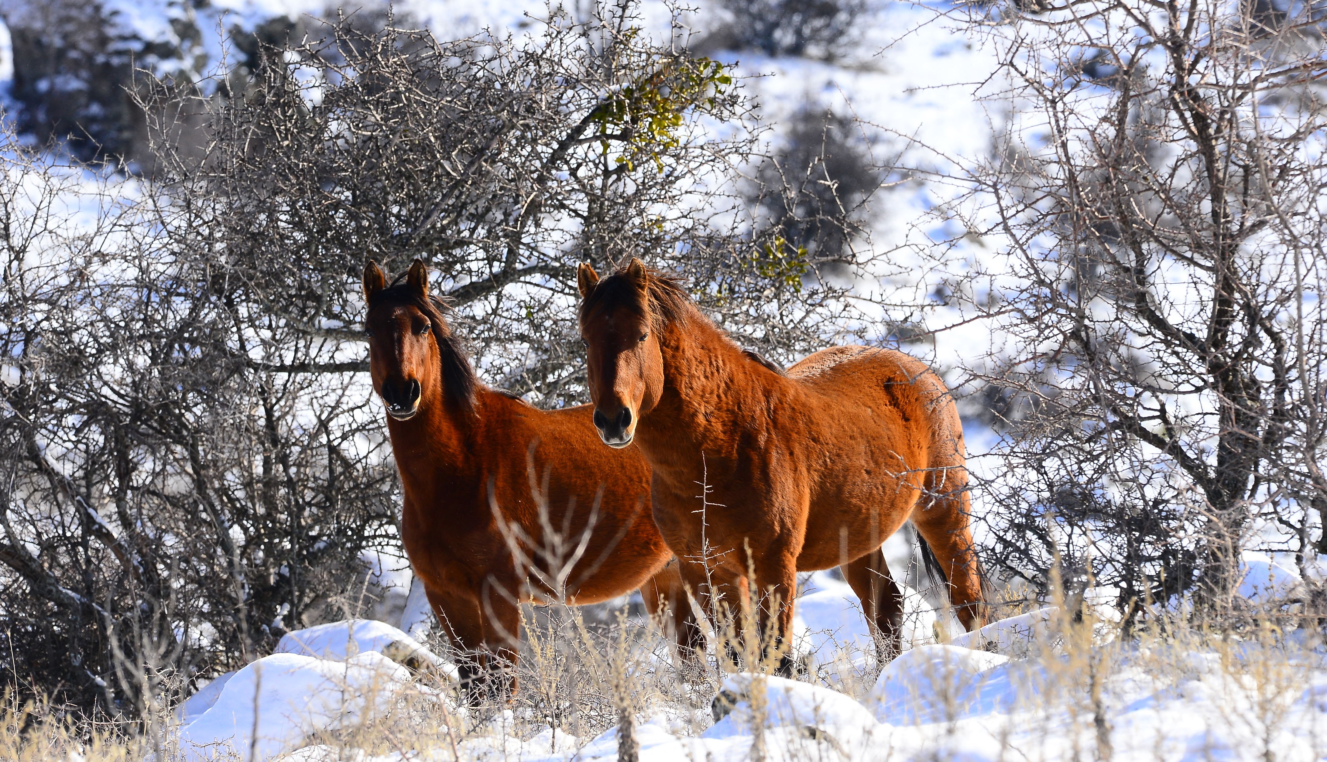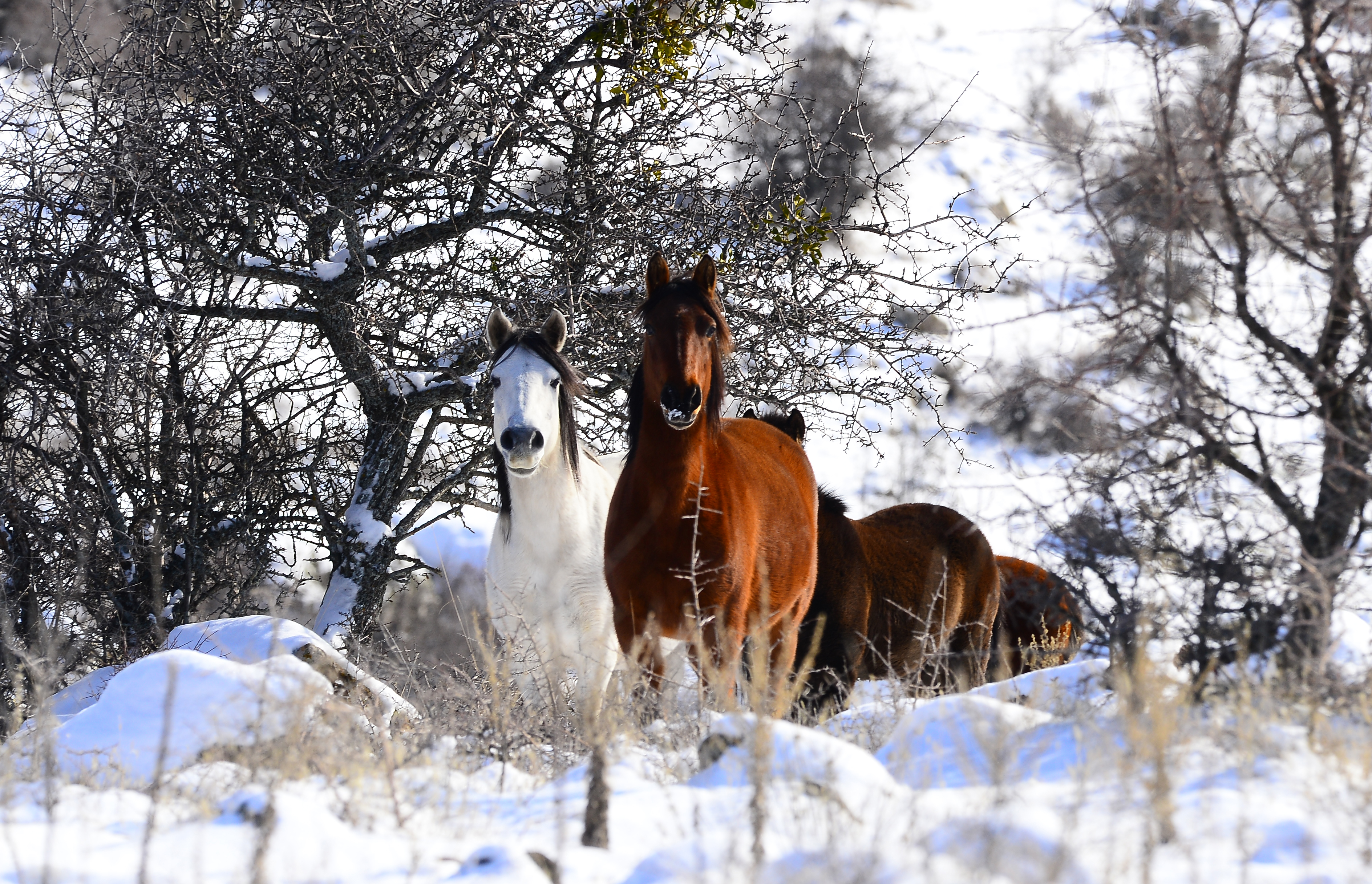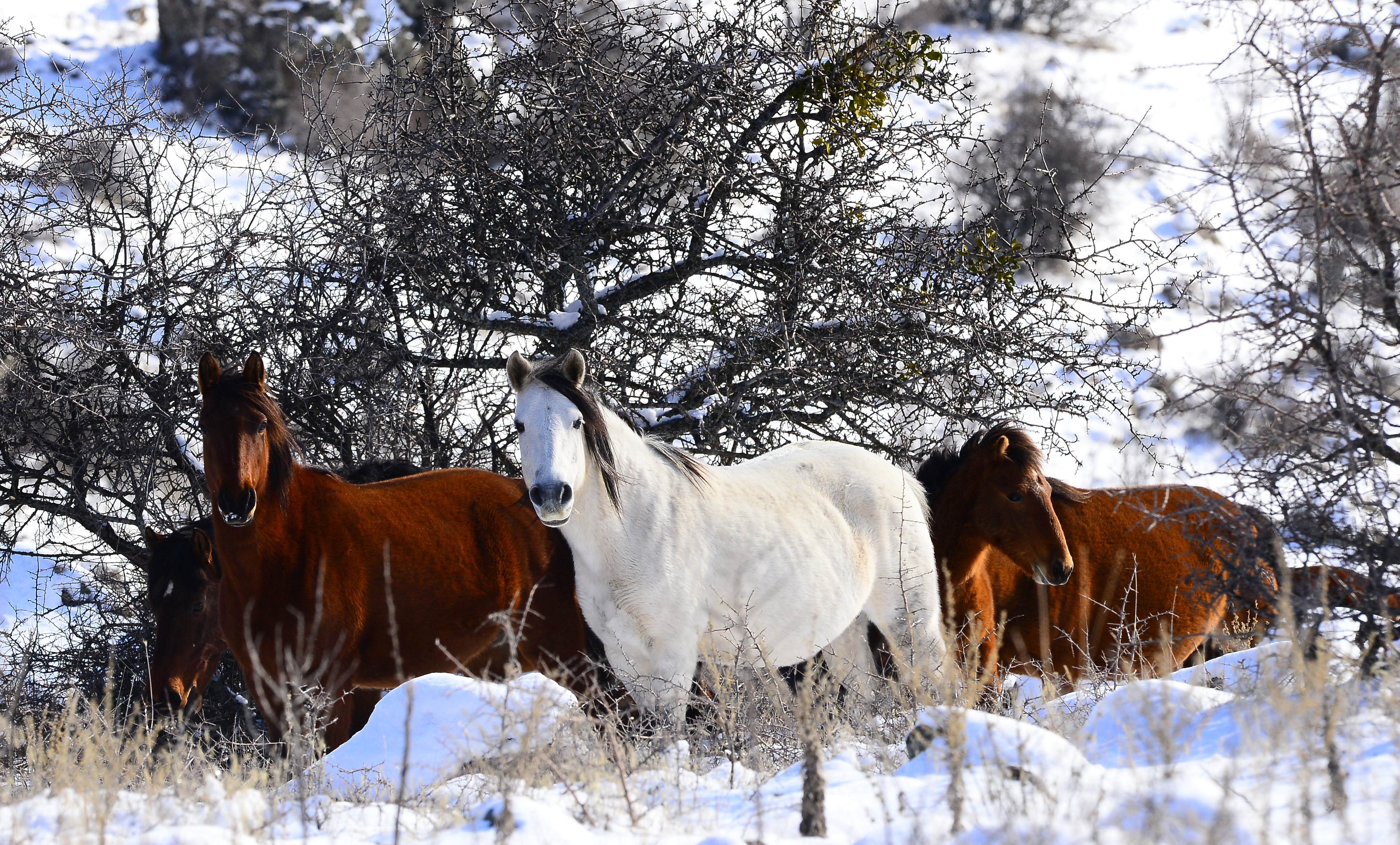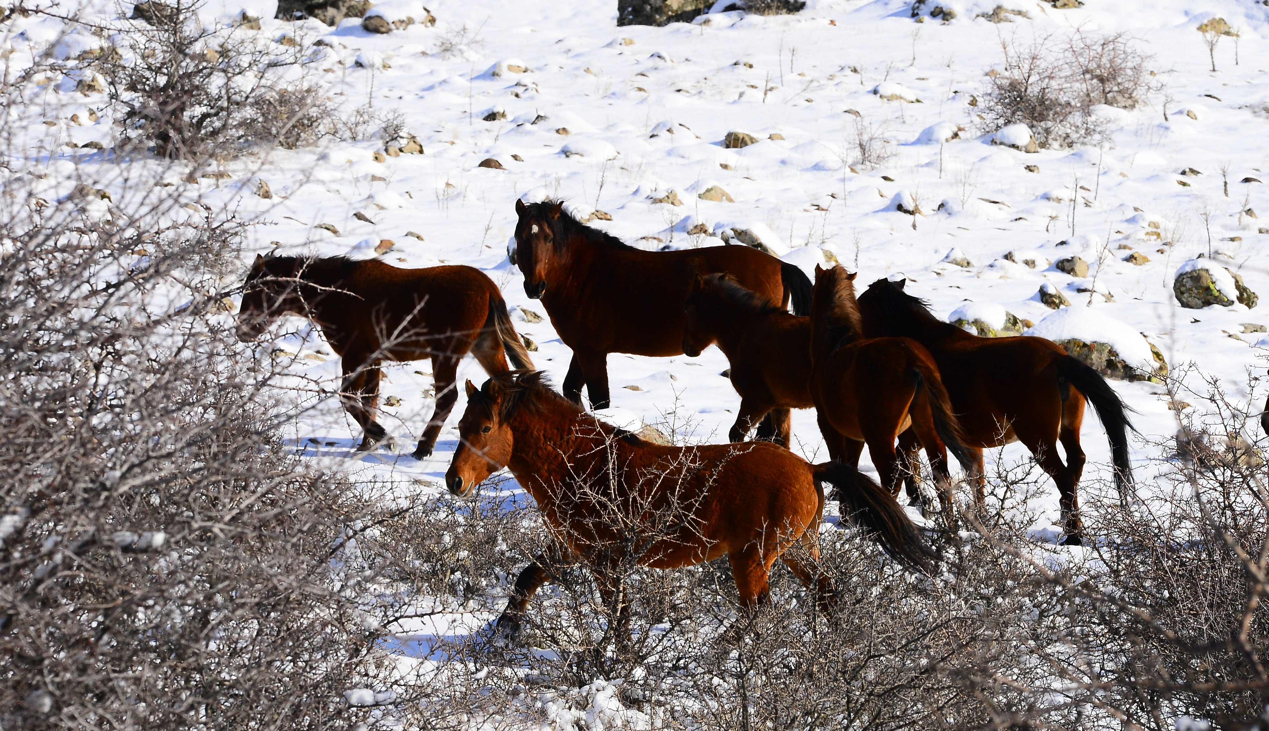 Uşak ve Kütahya sınırında yer alan Murat Dağı'nın yüksek kesimlerinde koloniler halinde yaşayan yılkı atları, kar yağışının ardından yem bulmak ve soğuktan korunmak için dağın eteklerine indi.