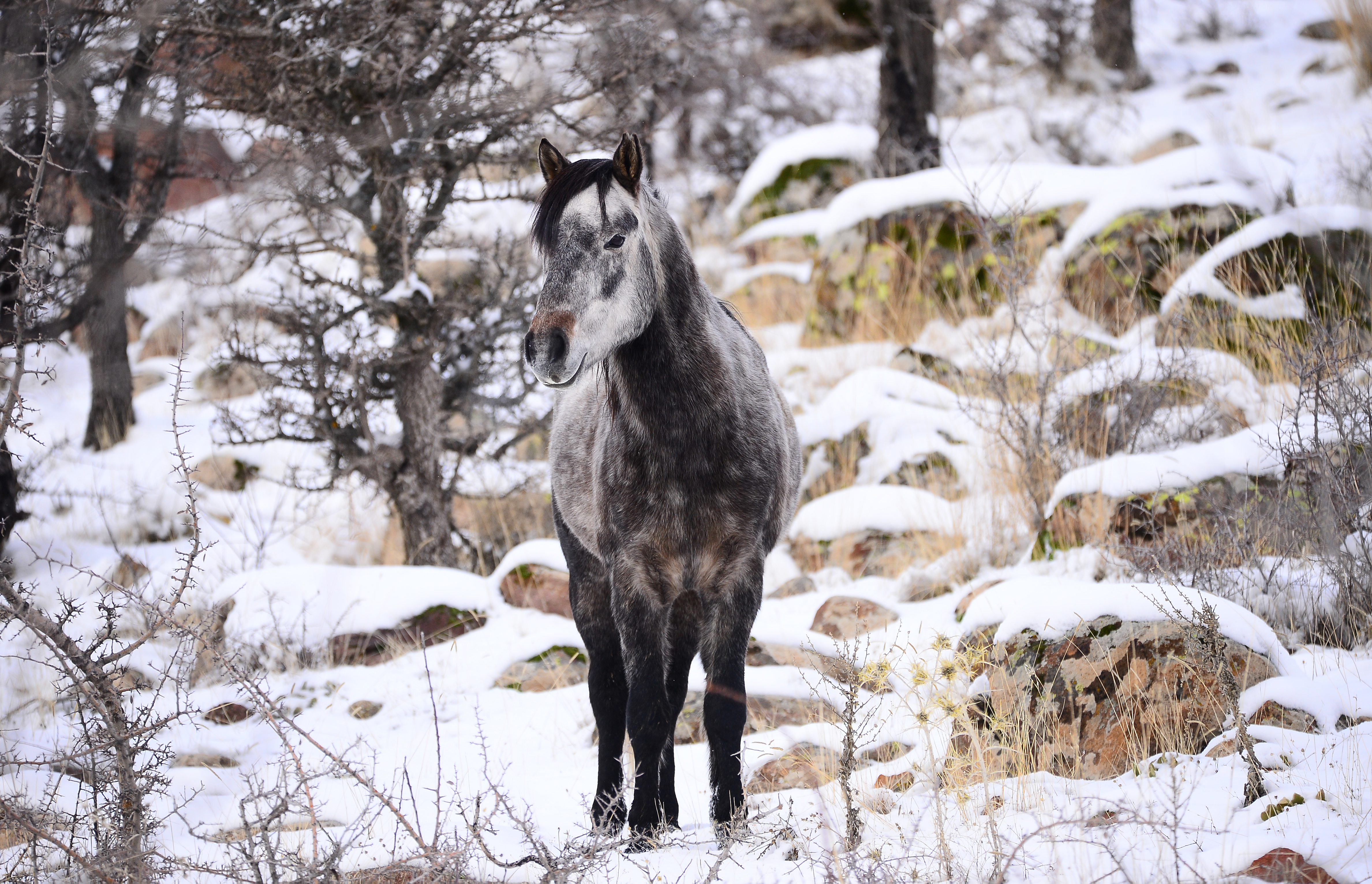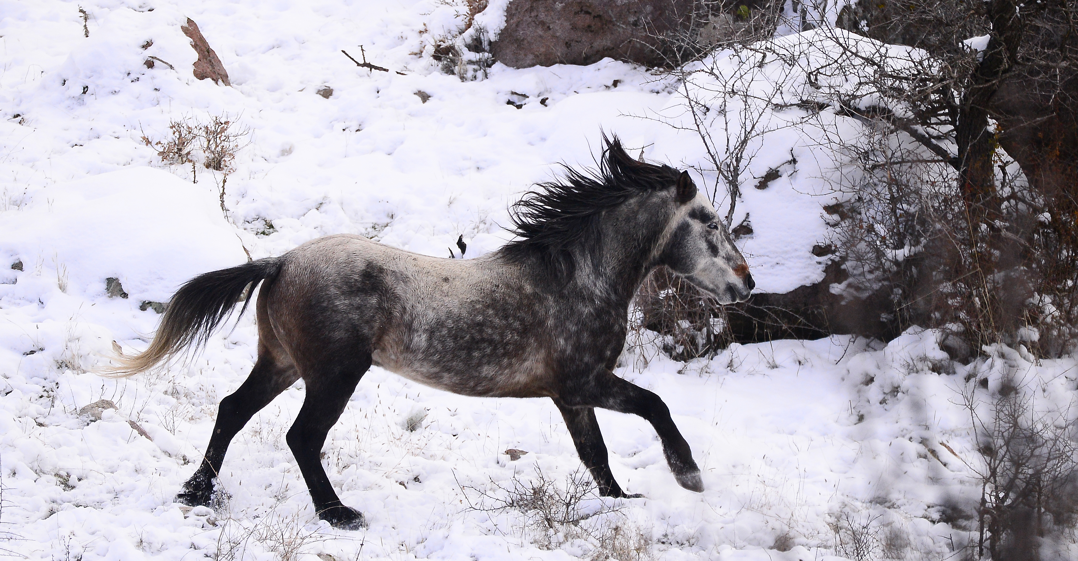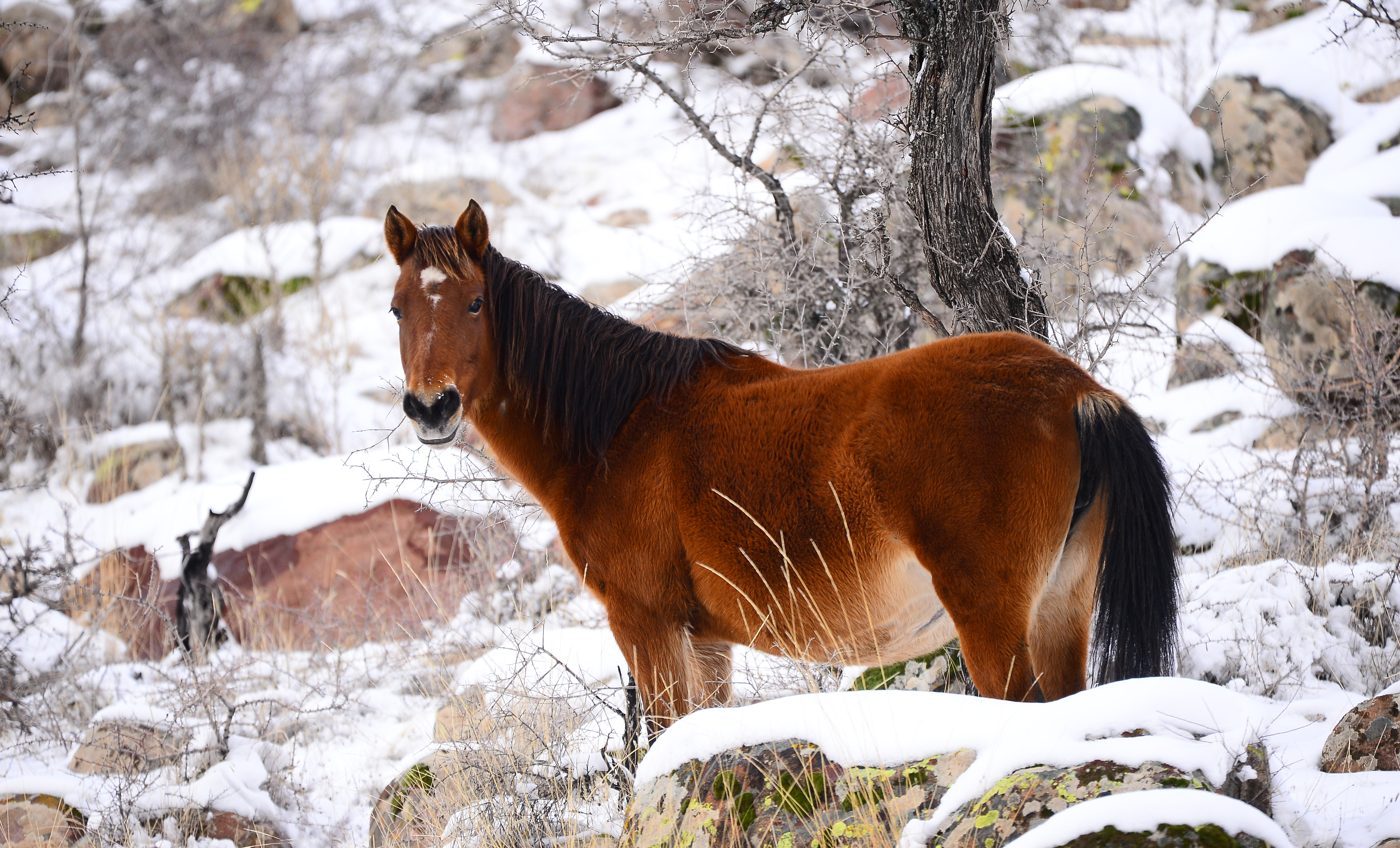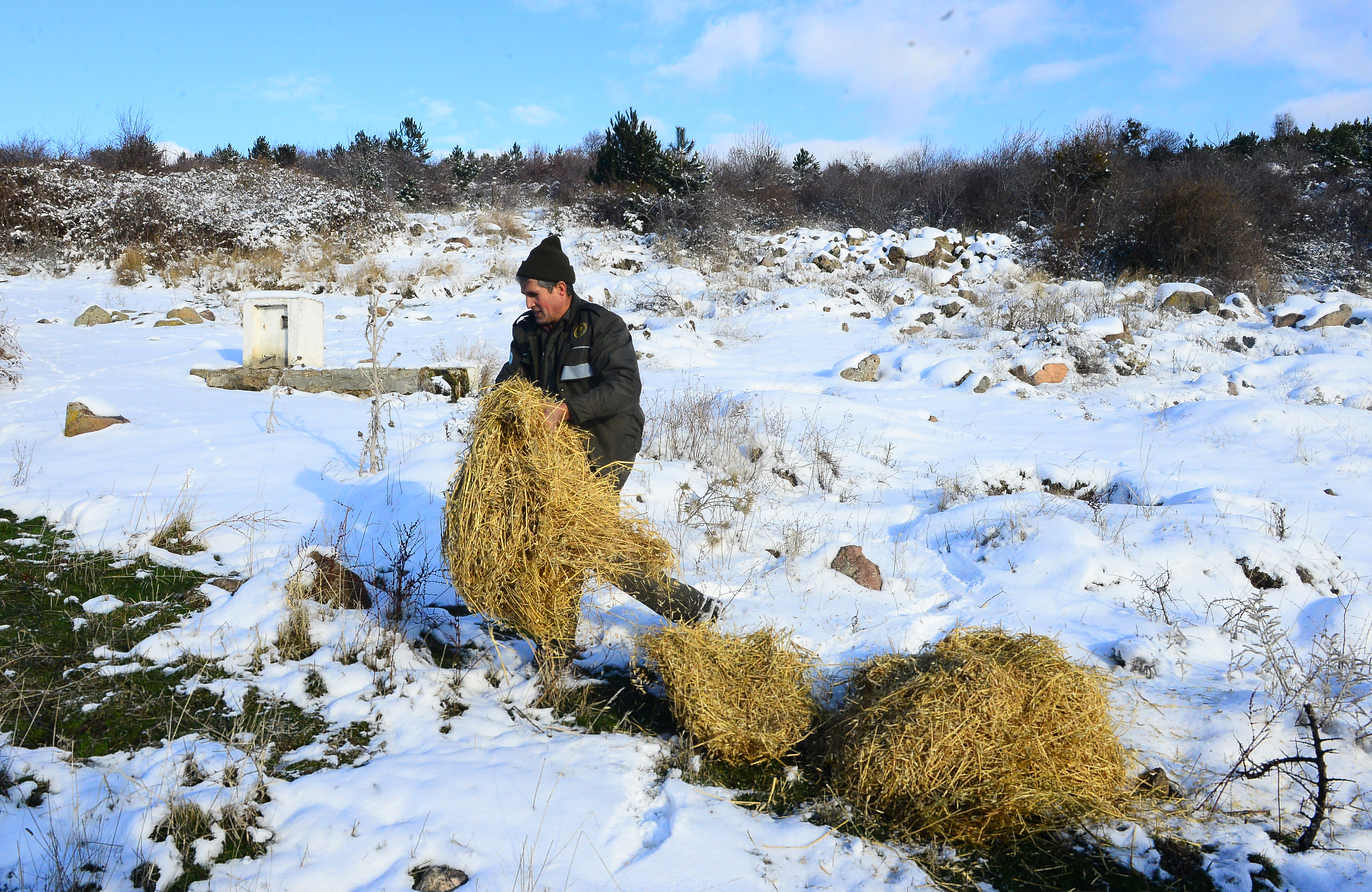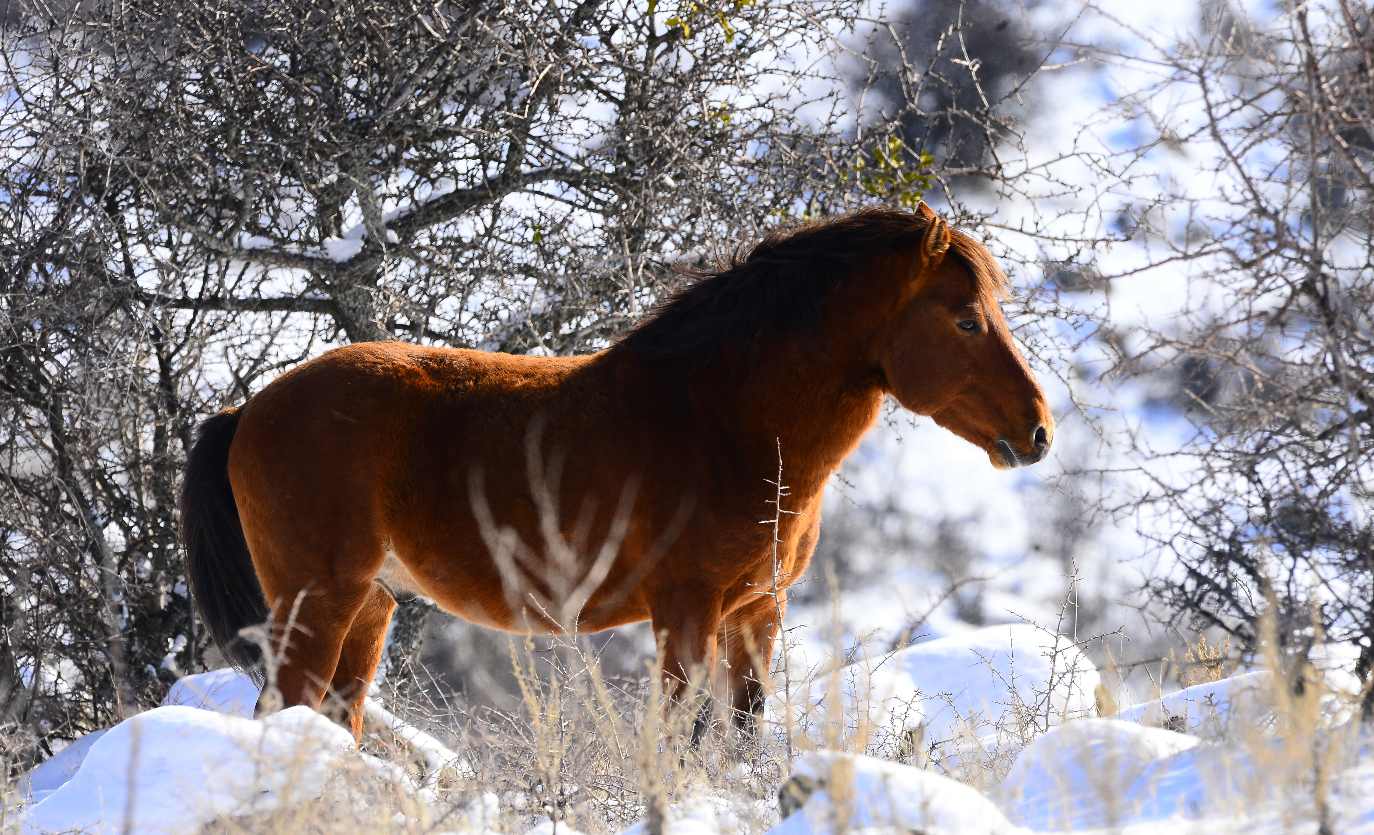 Uşak ve Kütahya sınırında yer alan Murat Dağı'nın yüksek kesimlerinde koloniler halinde yaşayan yılkı atları, kar yağışının ardından yem bulmak ve soğuktan korunmak için dağın eteklerine indi.
