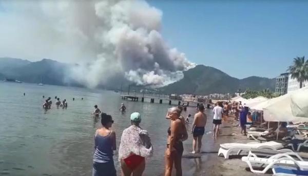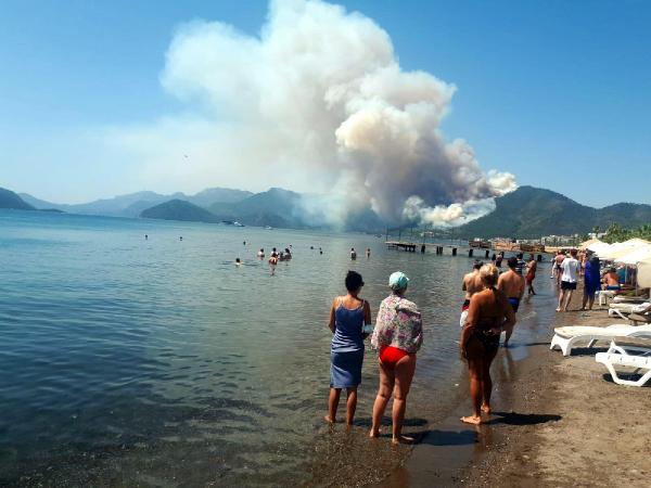 Bu arada her noktadan görülebilen duman, ilçenin üzerinde tabaka oluşturdu. İlçe sakinlerinin yanı sıra plajlardaki yerli ve yabancı turistler, söndürme çalışmalarını kaygıyla izledi.