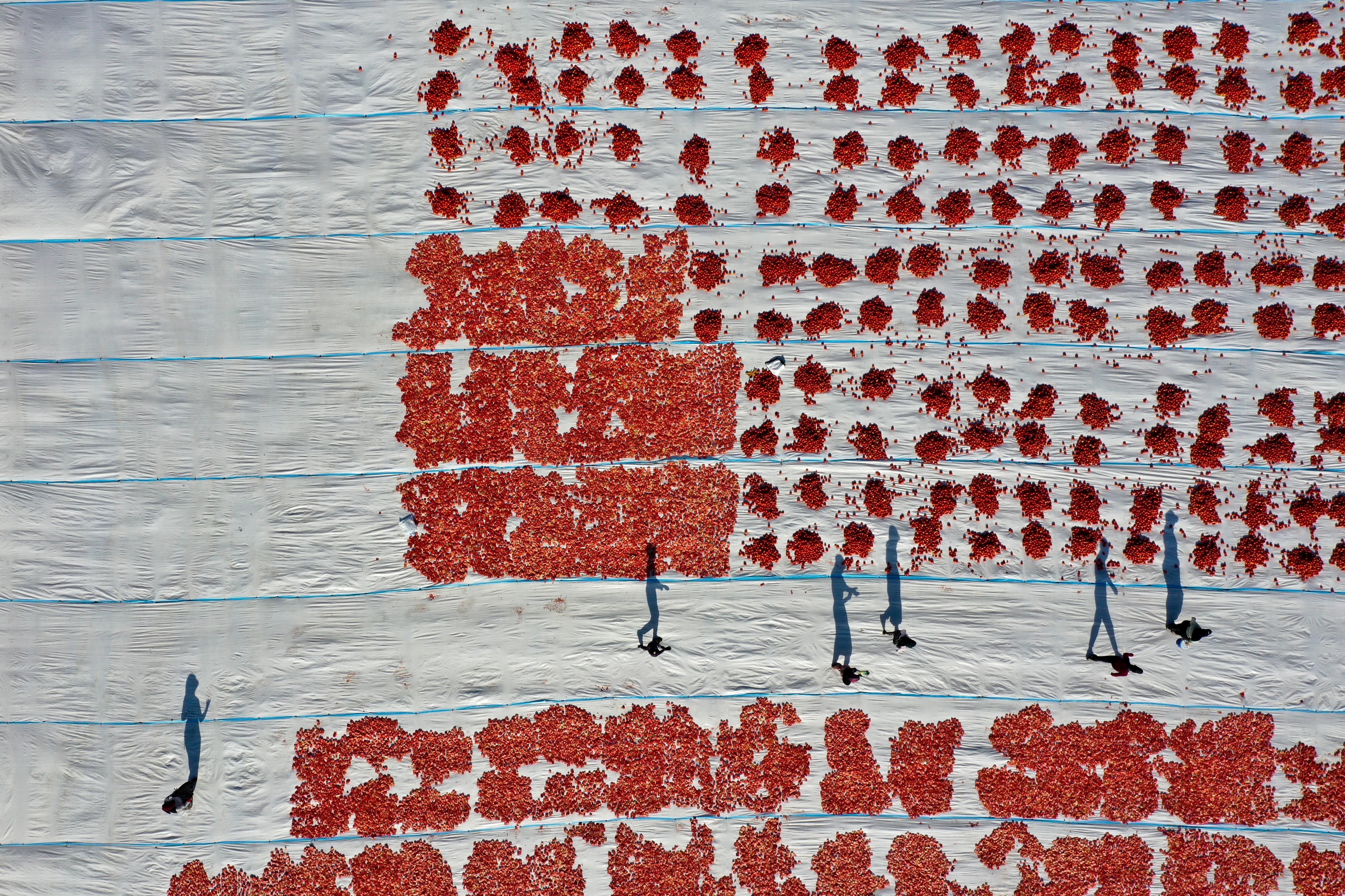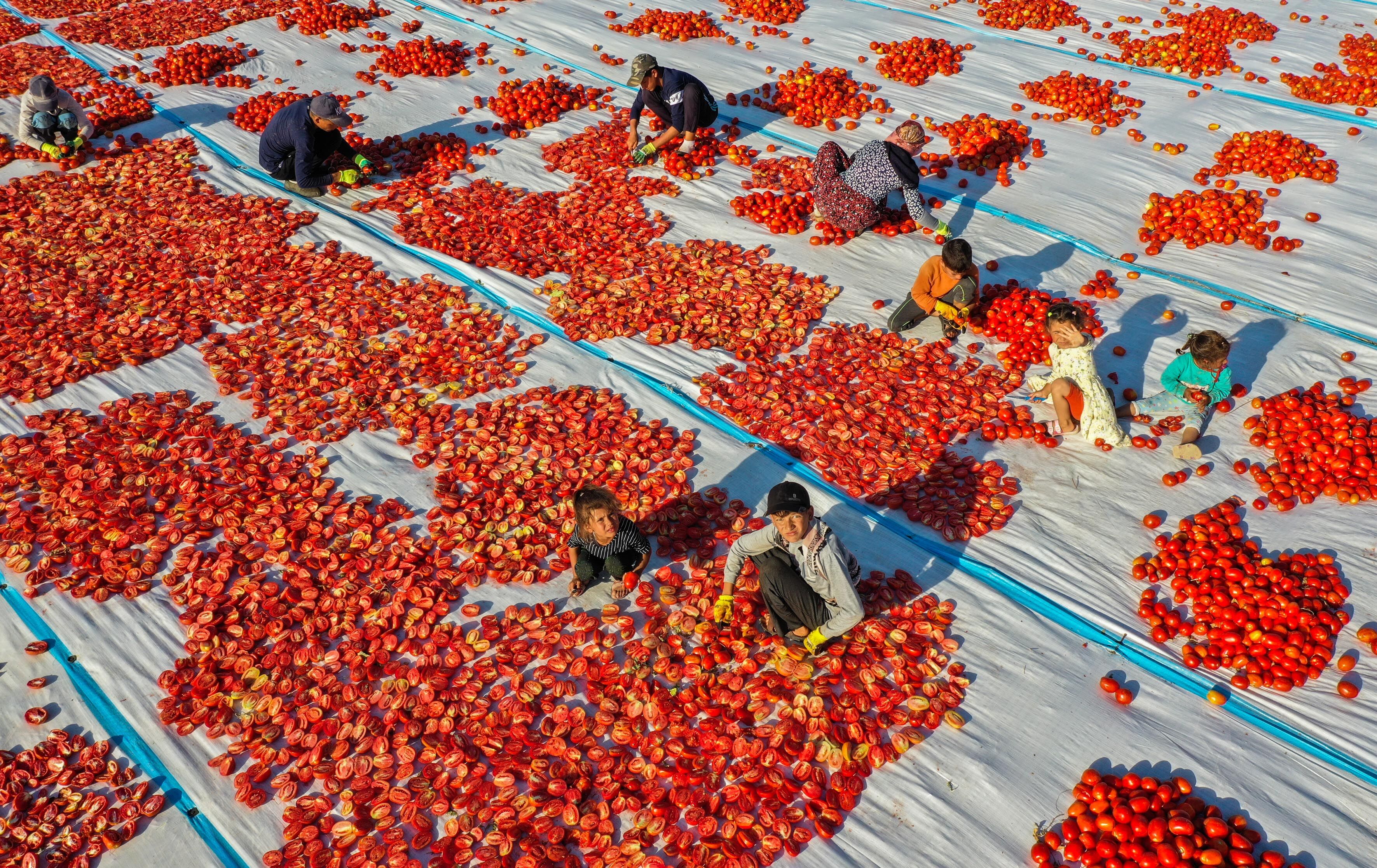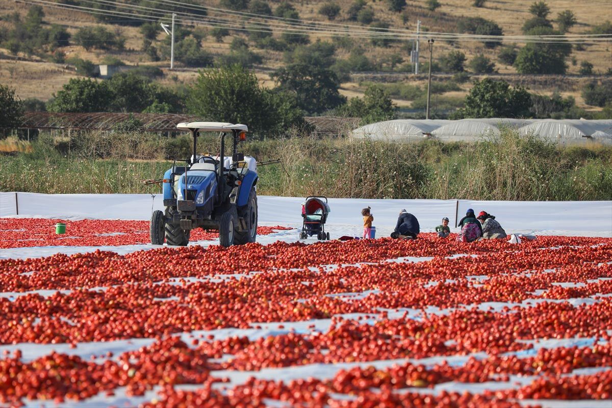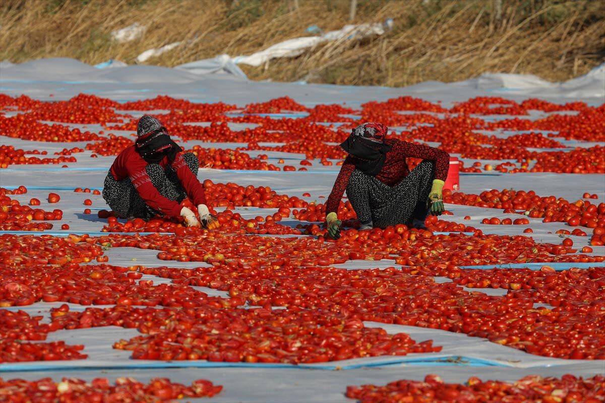 Tarım işçileri tarafından ikiye bölünerek örtülerin üzerine sıralanan domatesler, müşteri talebine göre kükürtlü veya tuzlu olarak 1 hafta güneş altında bekletilerek kurutuluyor.