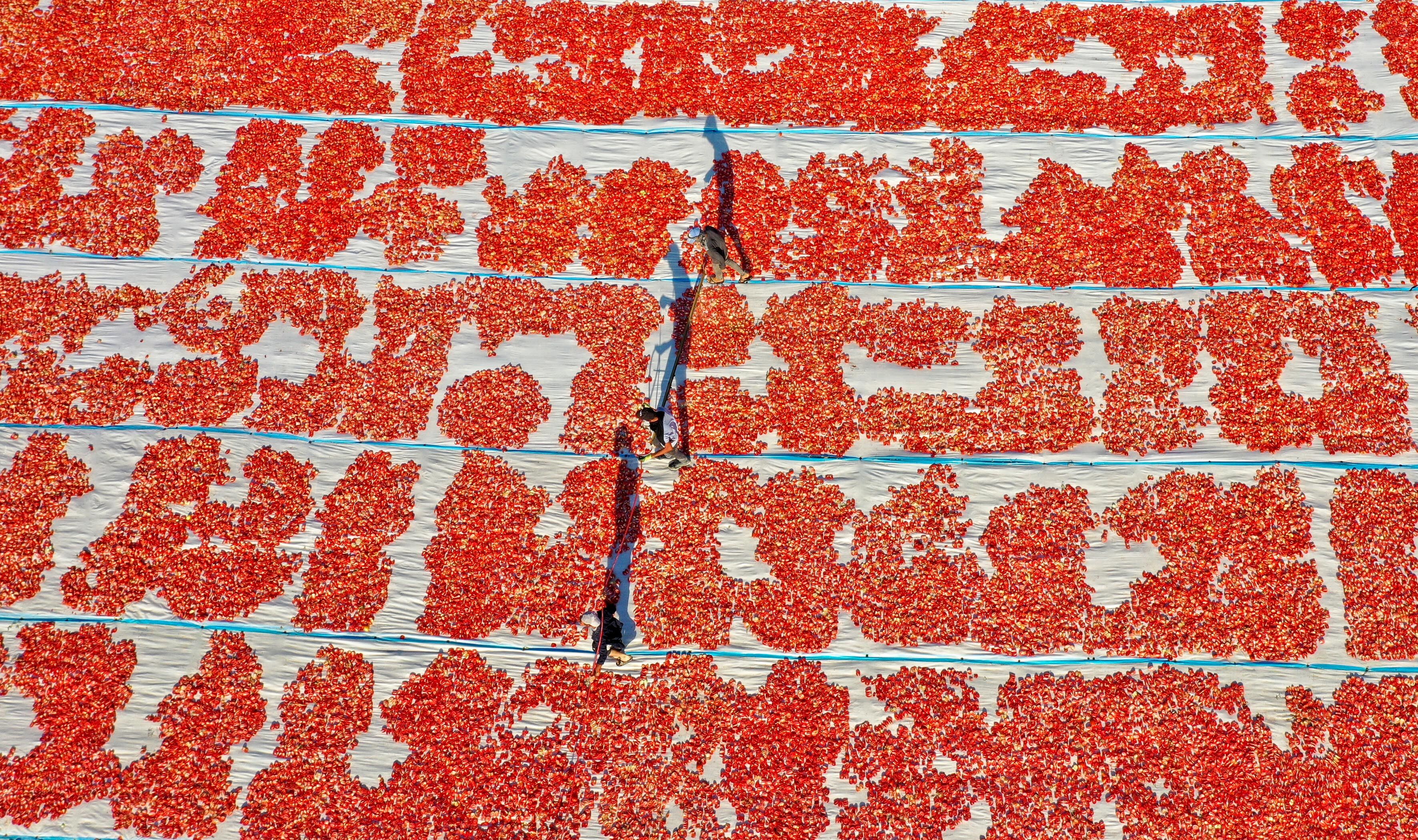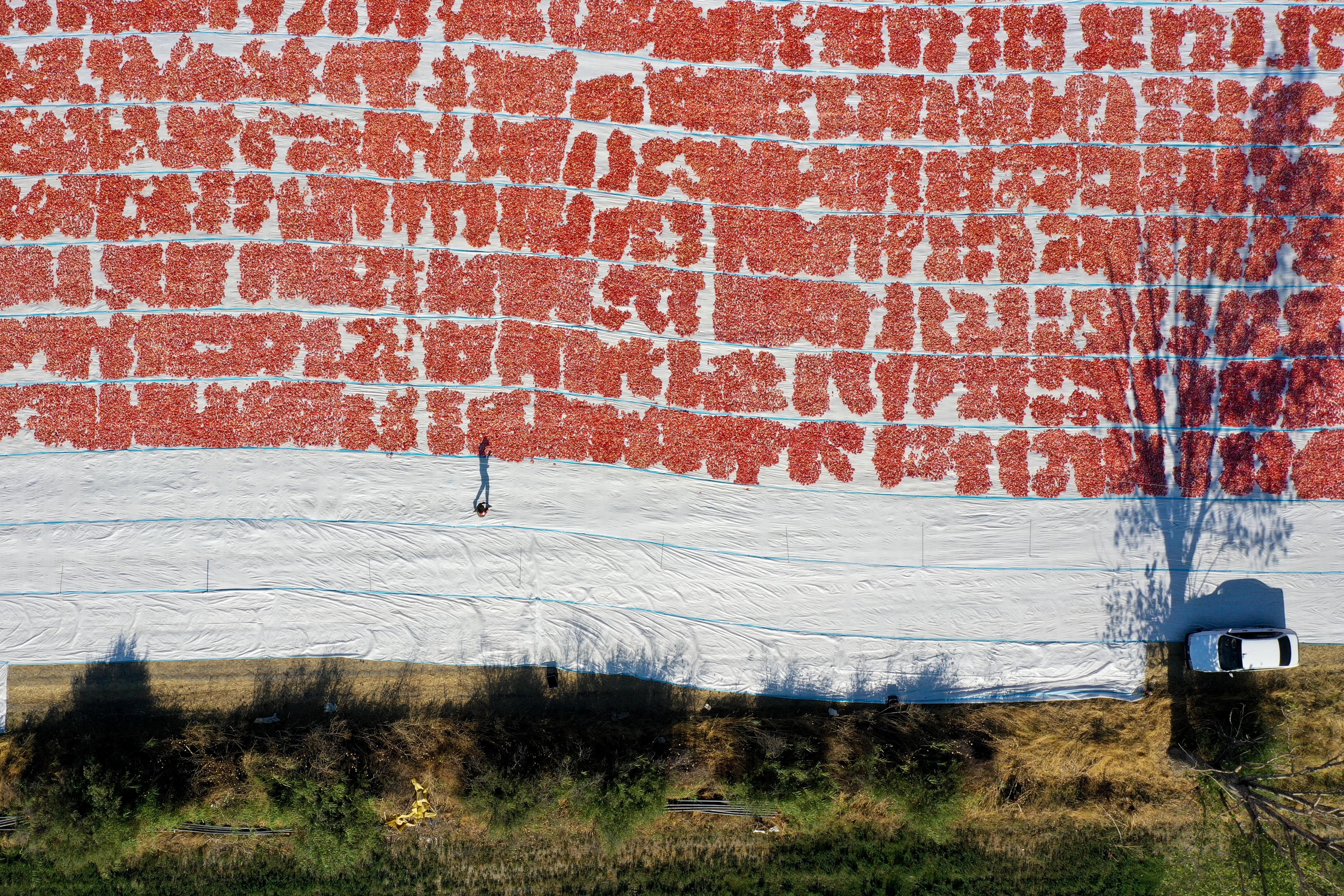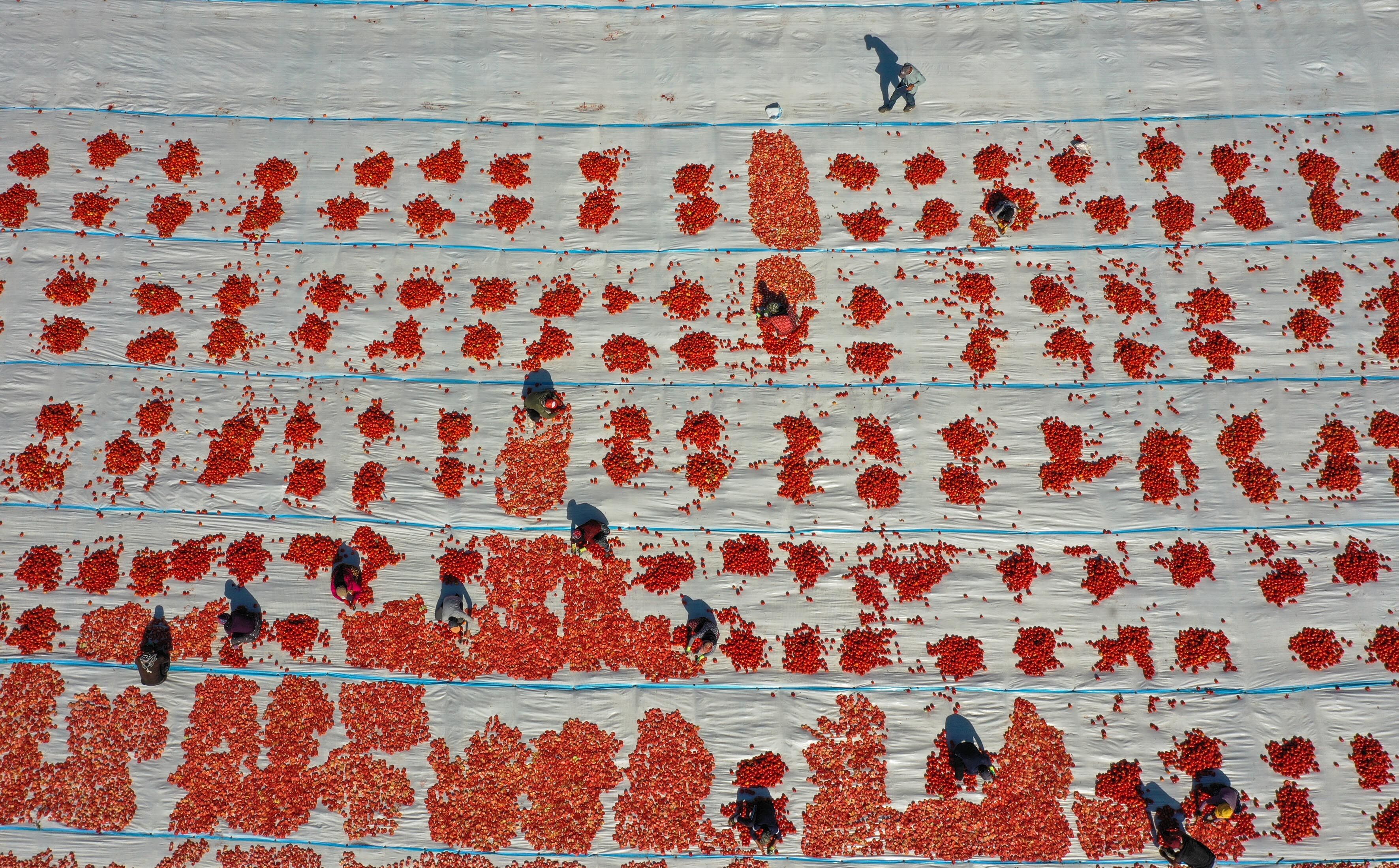 Tarım işçileri tarafından ikiye bölünerek örtülerin üzerine sıralanan domatesler, müşteri talebine göre kükürtlü veya tuzlu olarak 1 hafta güneş altında bekletilerek kurutuluyor.