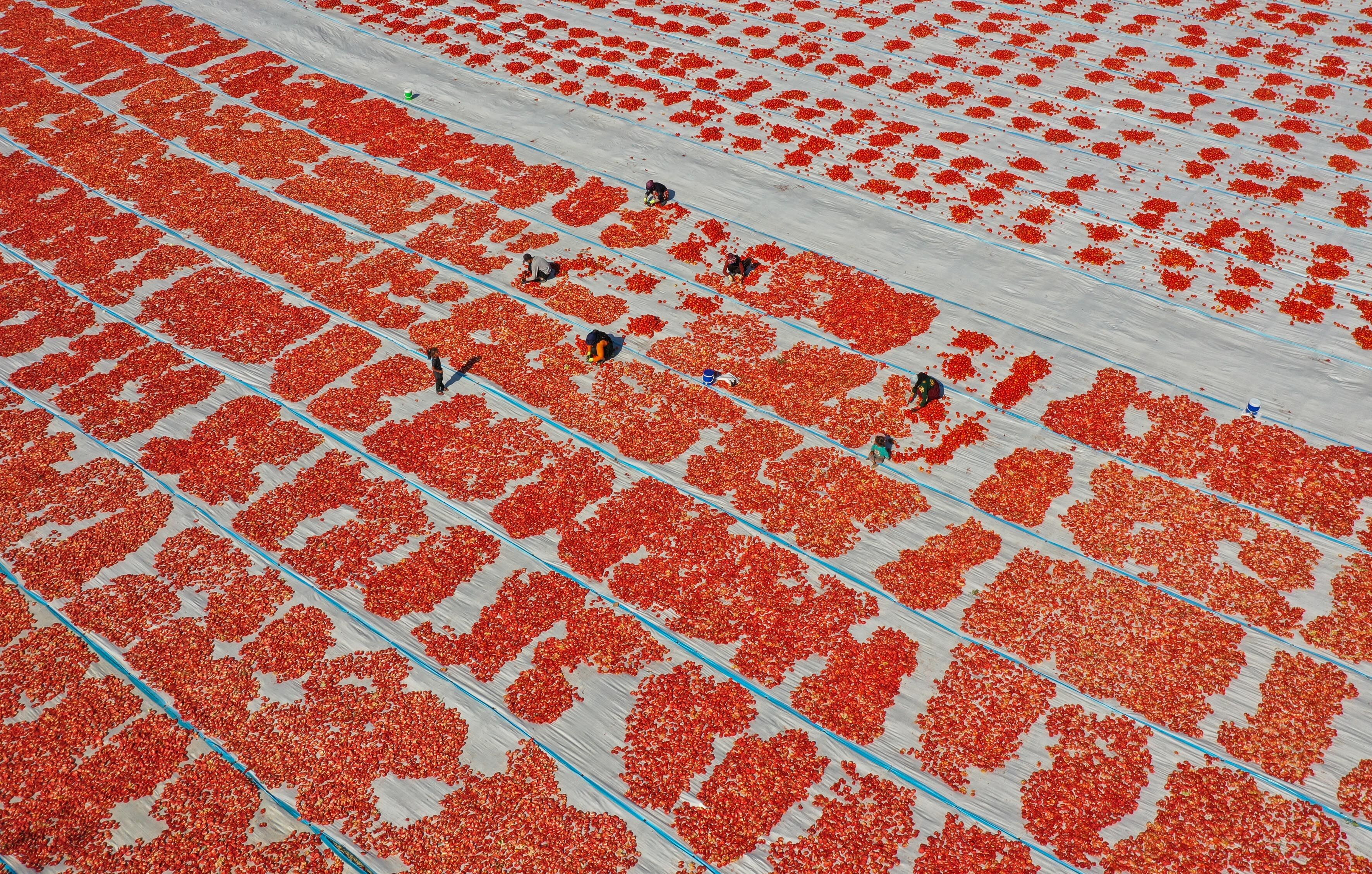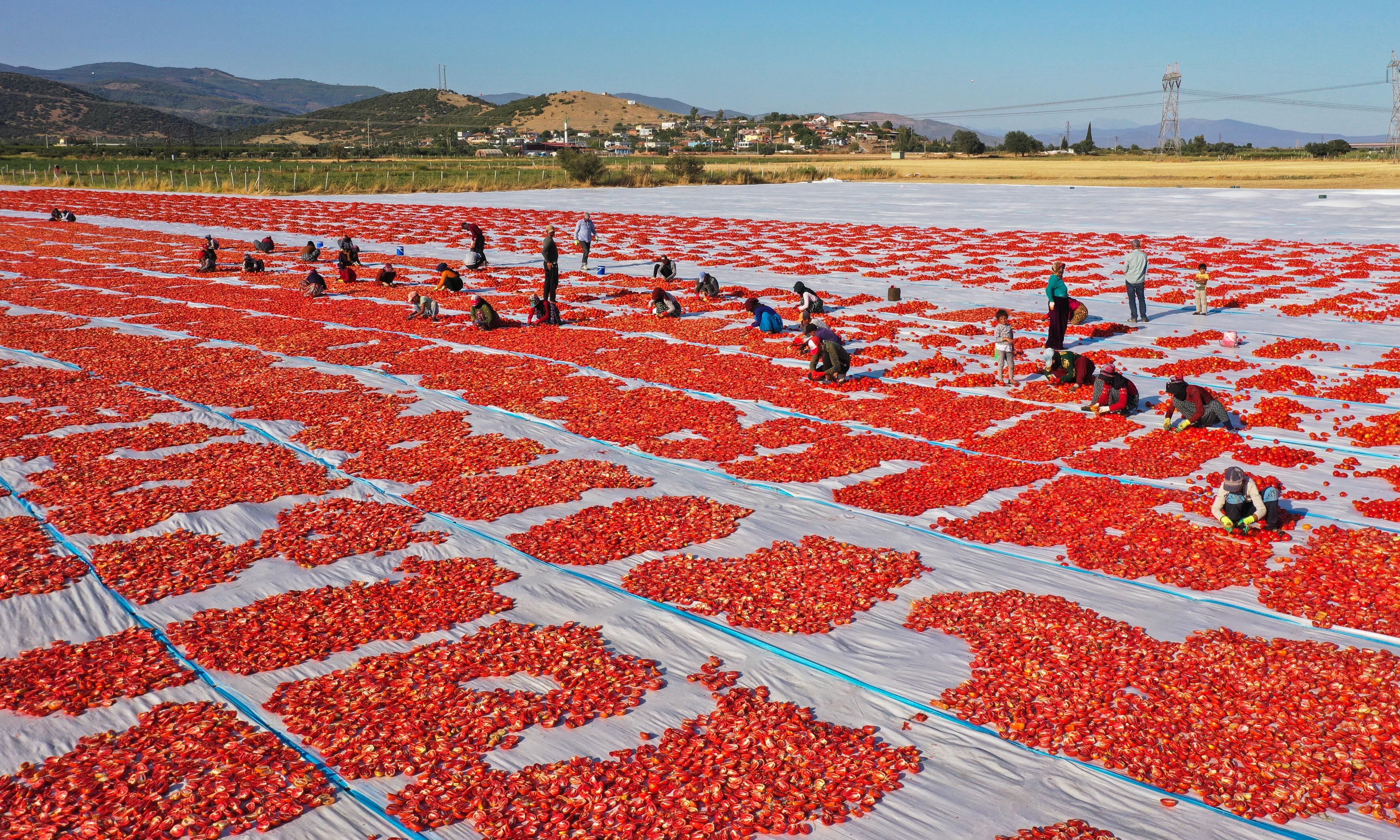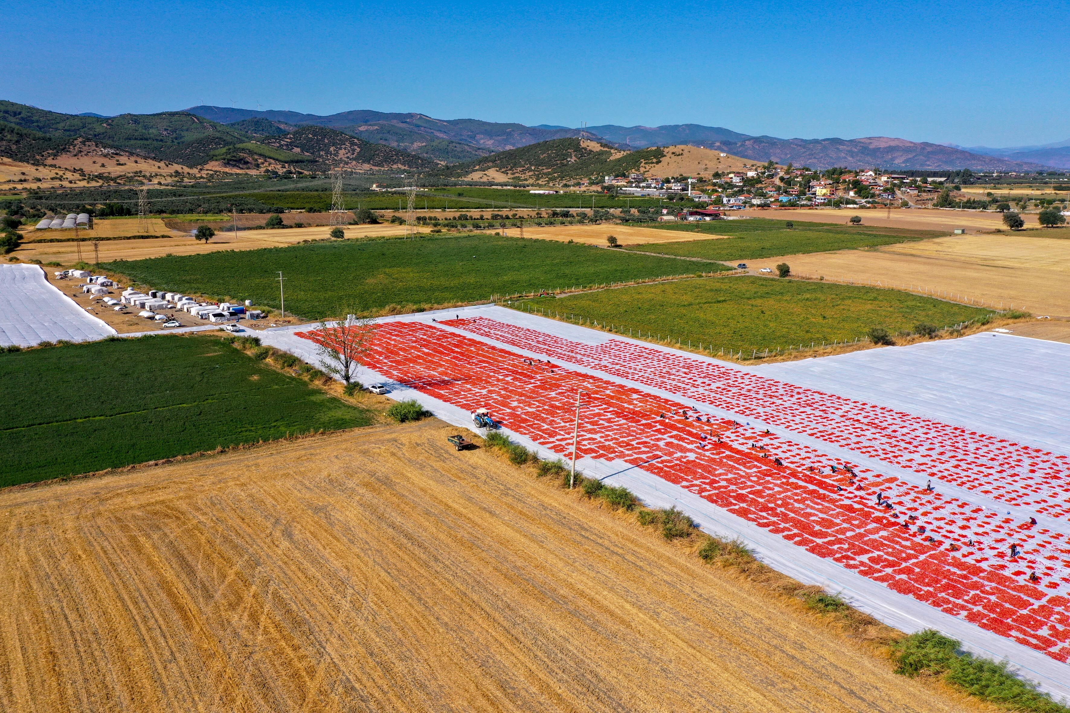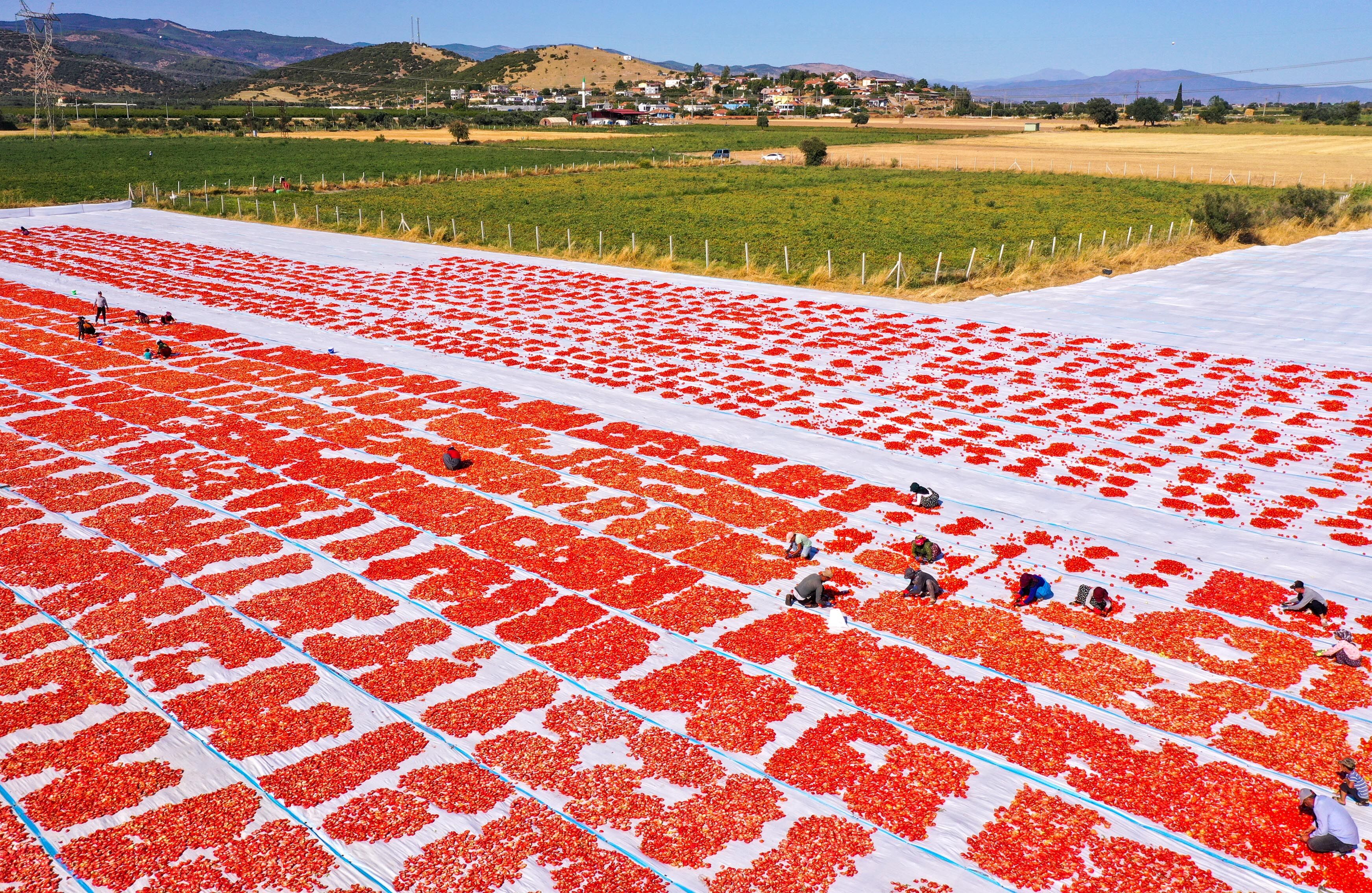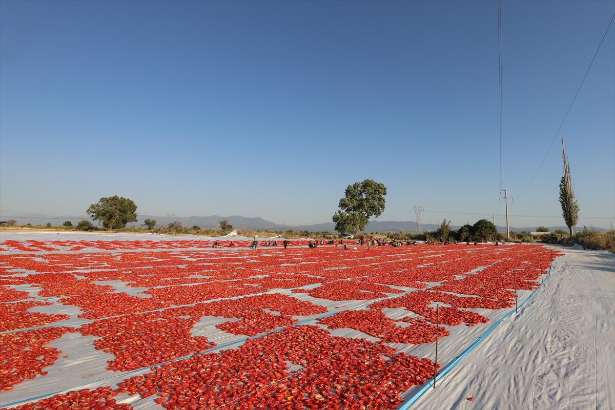 Türkiye'nin kurutulmuş domates üretim merkezi konumundaki İzmir'in Torbalı ilçesinde tarlalar kırmızıya büründü.