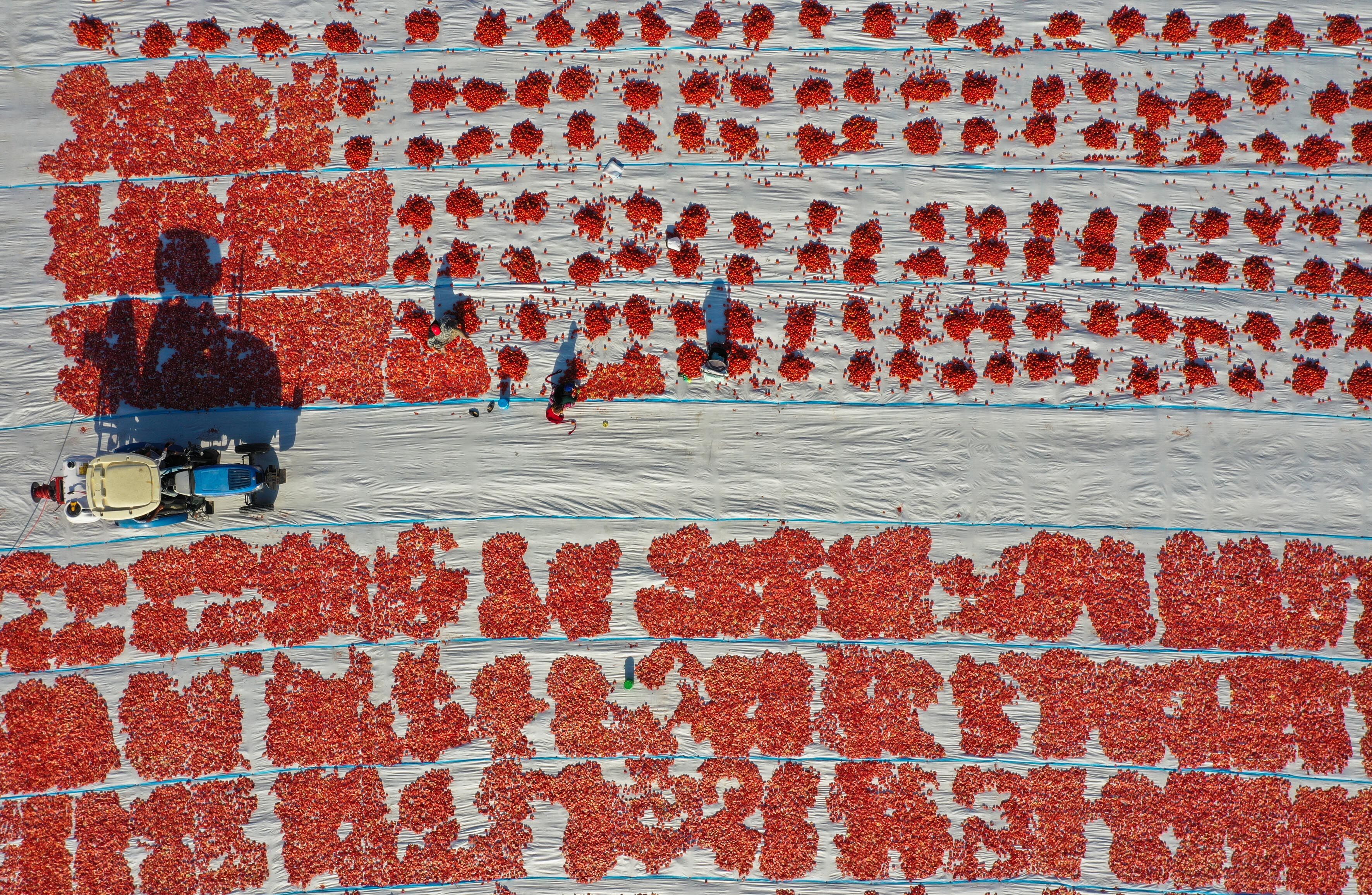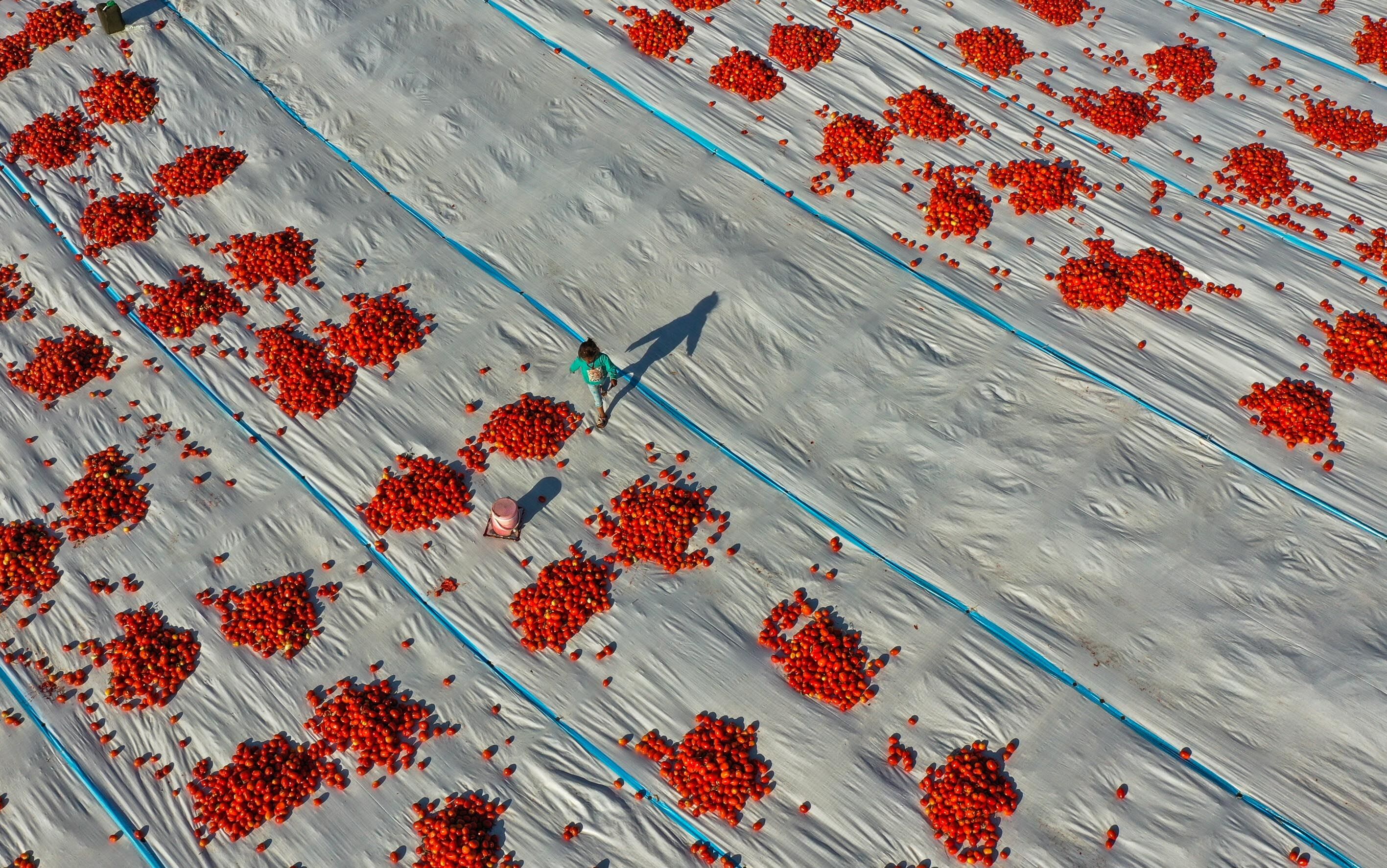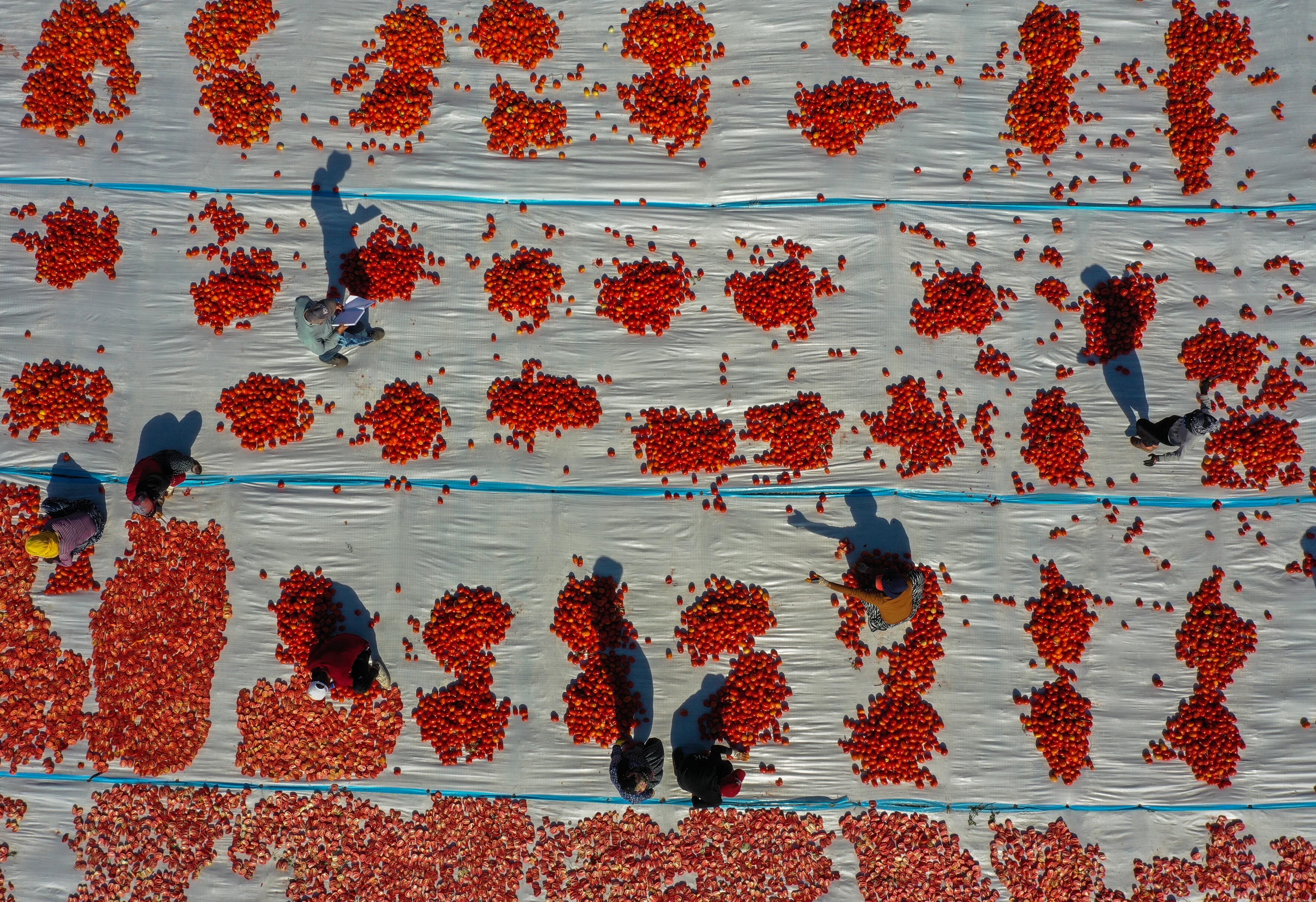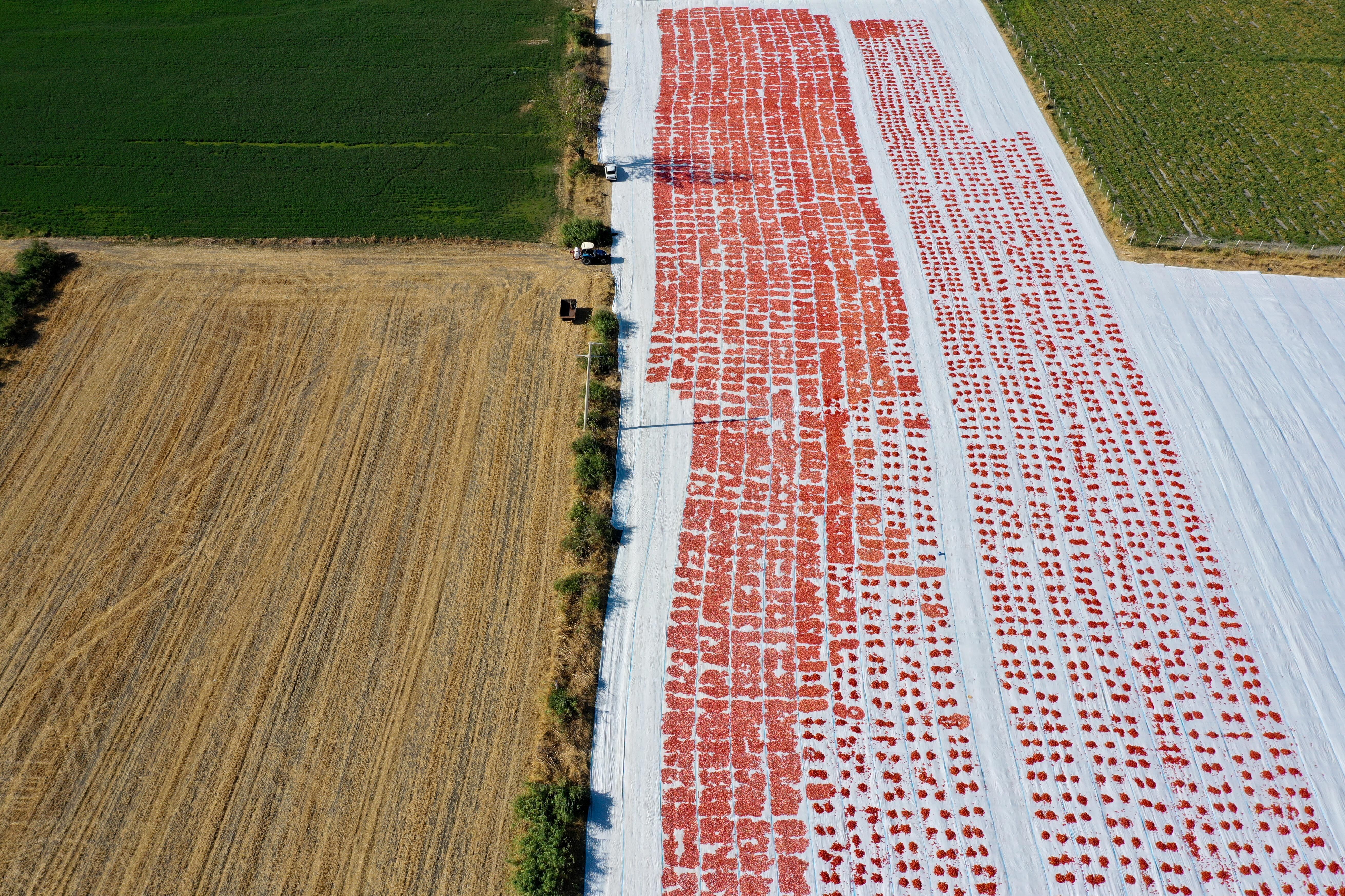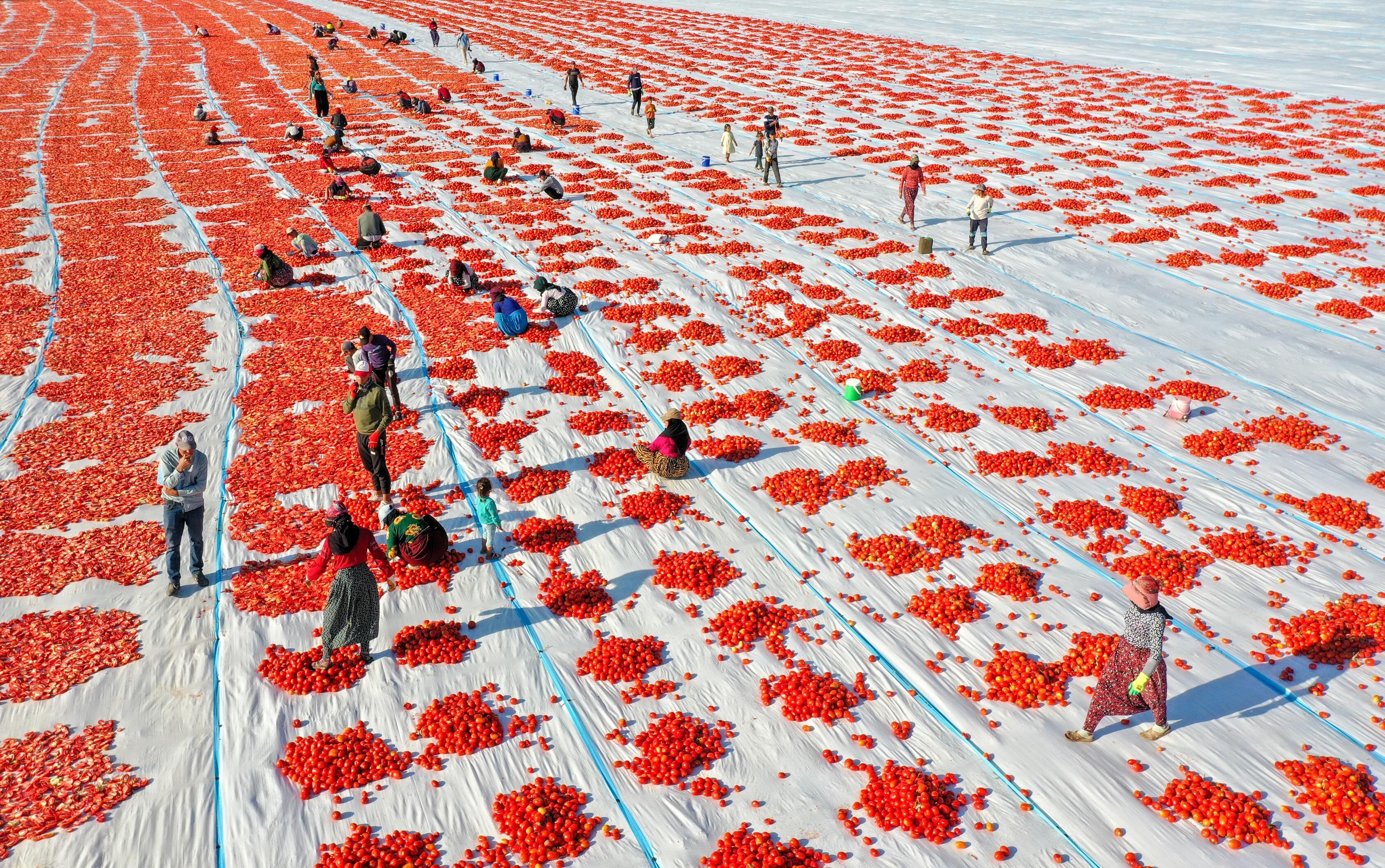 Türkiye'nin kurutulmuş domates üretim merkezi konumundaki İzmir'in Torbalı ilçesinde tarlalar kırmızıya büründü.