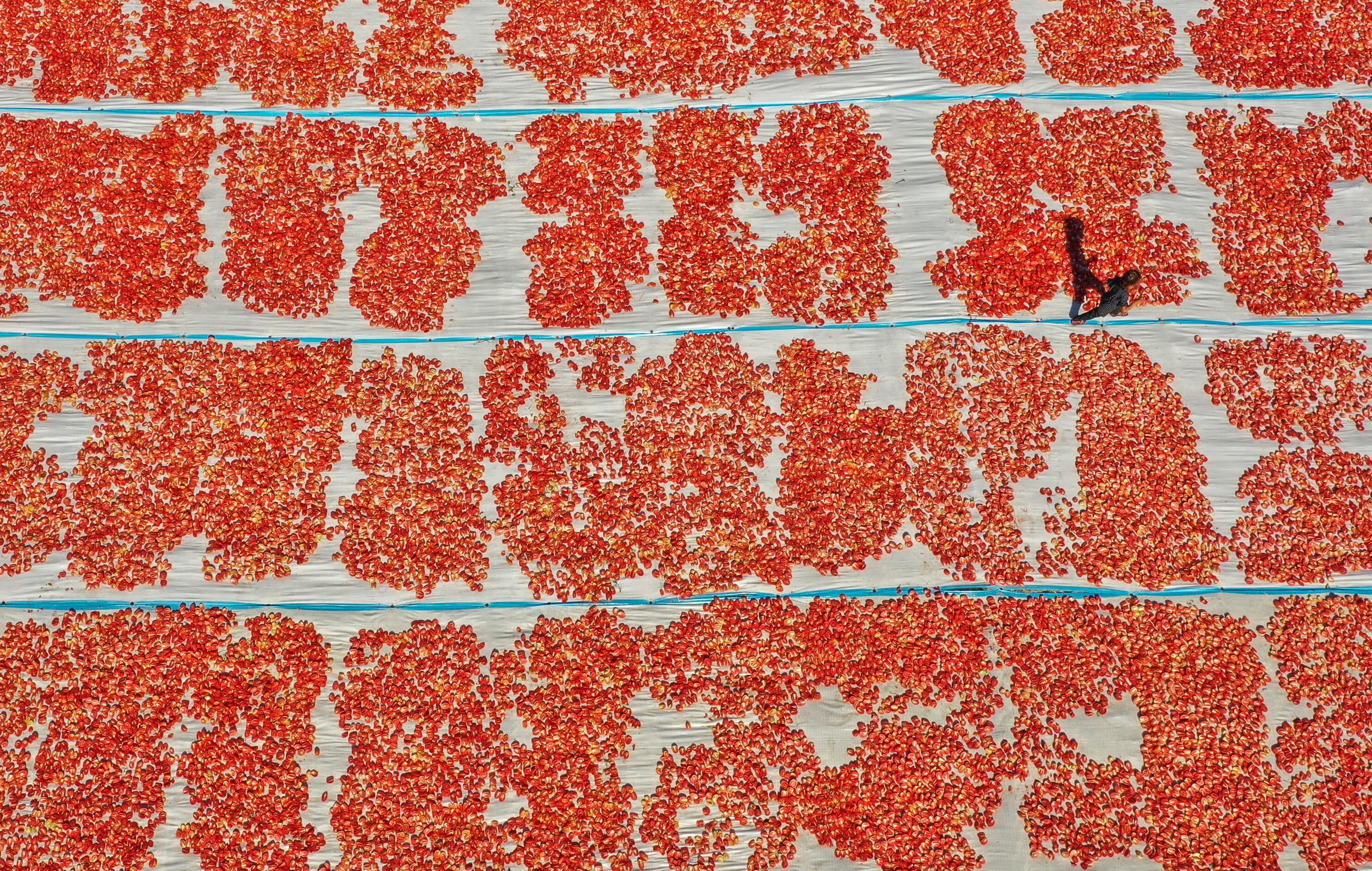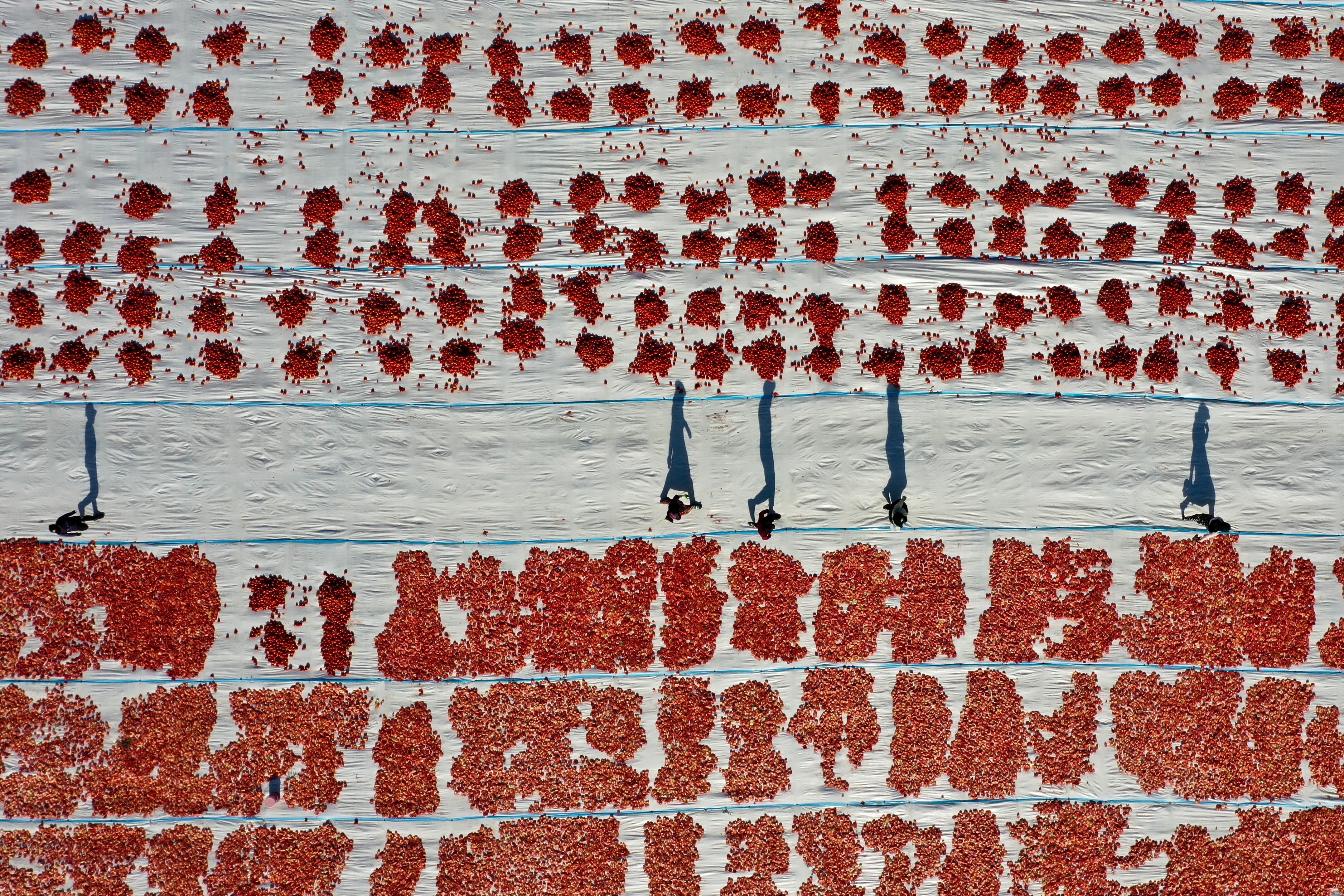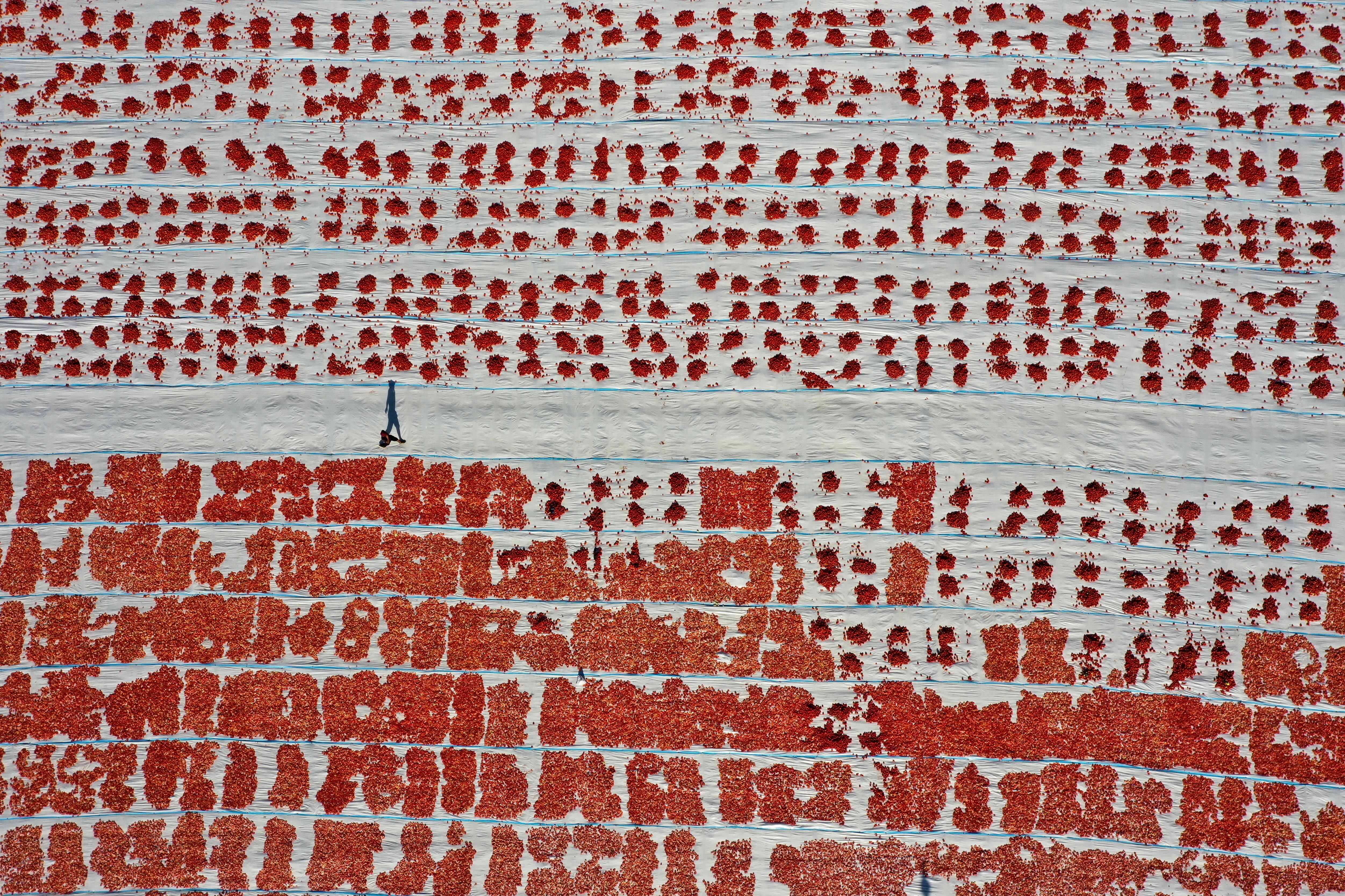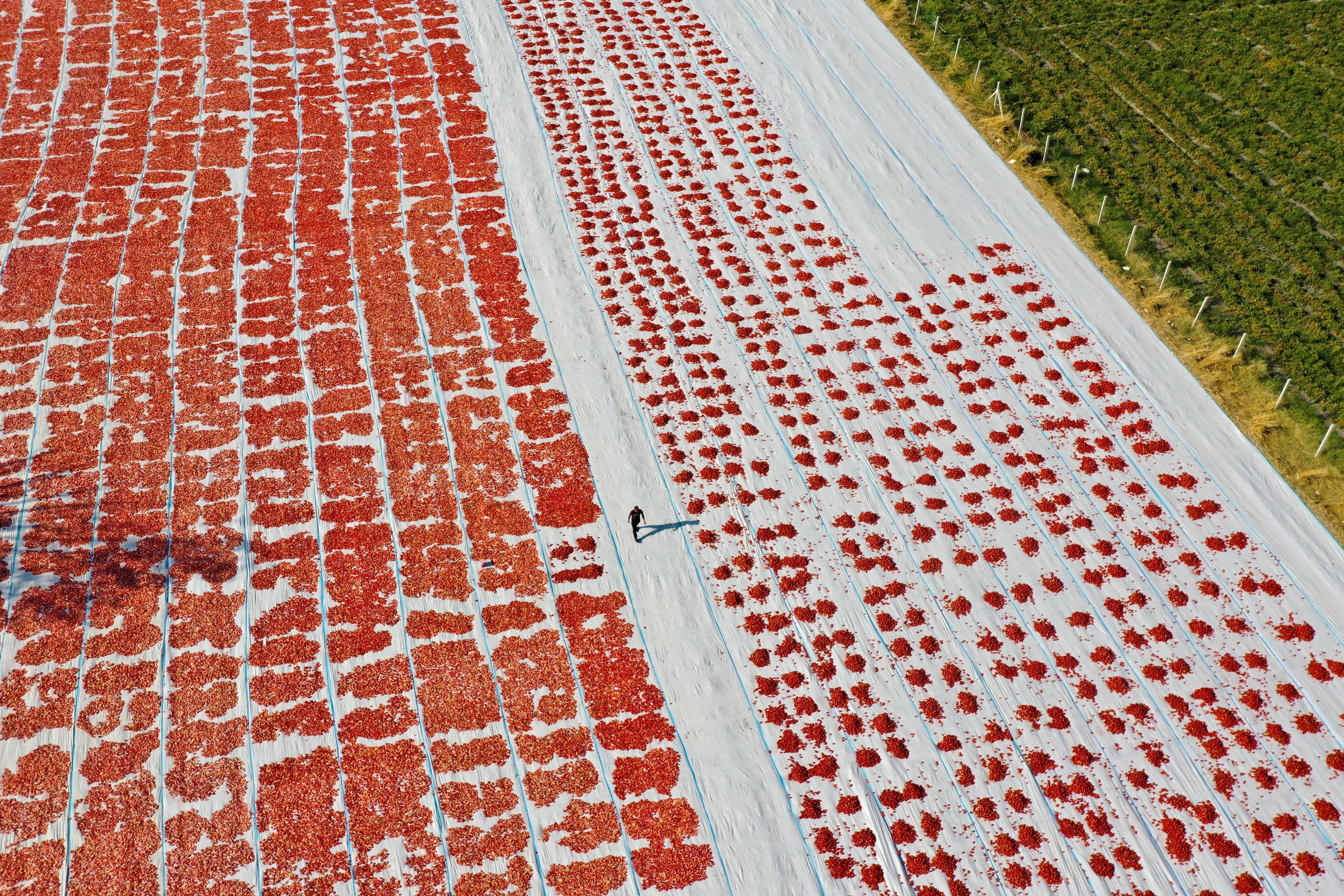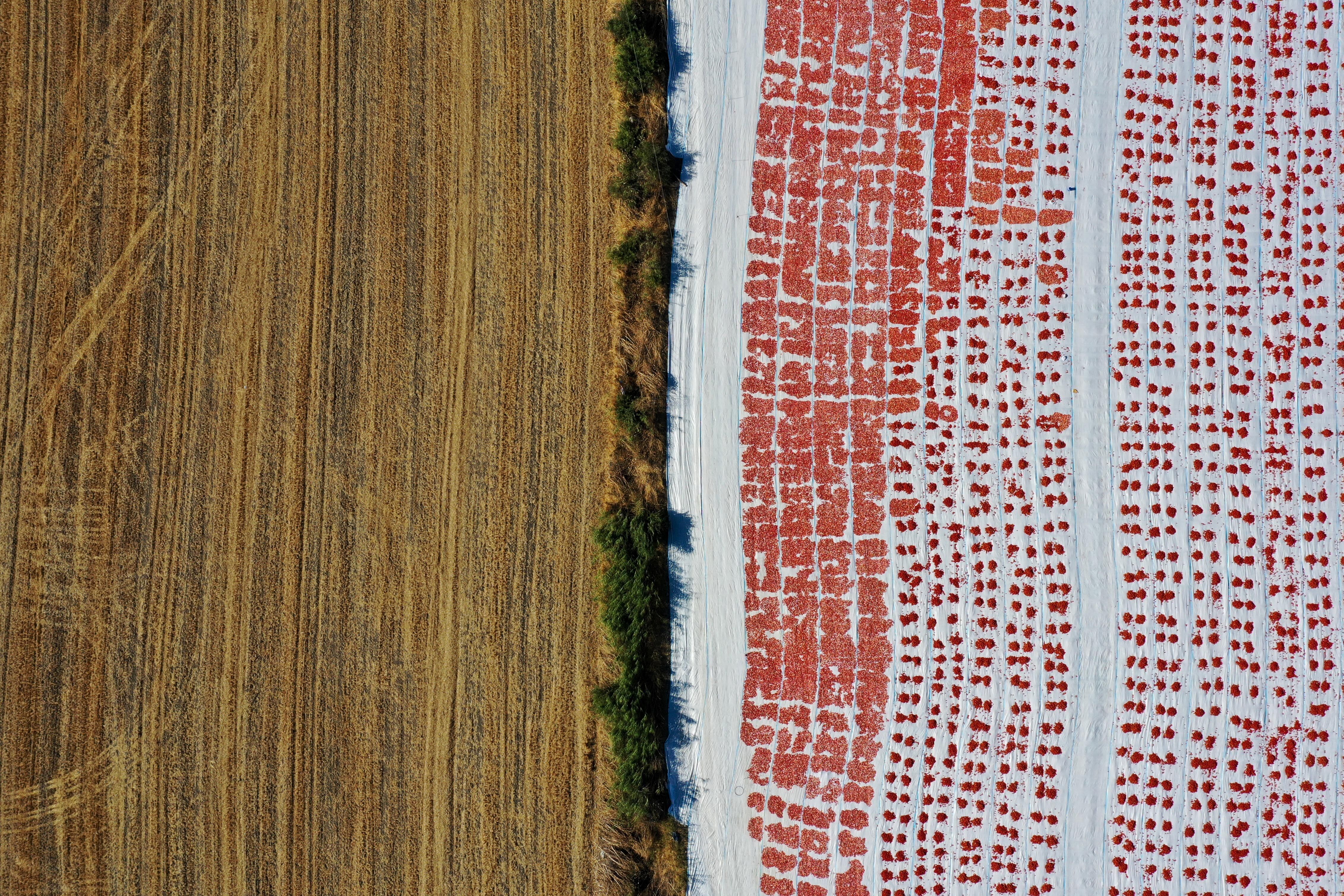 Türkiye'nin kurutulmuş domates üretim merkezi konumundaki İzmir'in Torbalı ilçesinde tarlalar kırmızıya büründü.