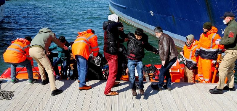 Hava şartlarının olumsuzluğuna rağmen lastik botla denize açılan ve soğuktan etkilenen sığınmacıların, sahil güvenlik personelince kendilerine verilen battaniyeyle ısınmaya çalıştıkları gözlendi.