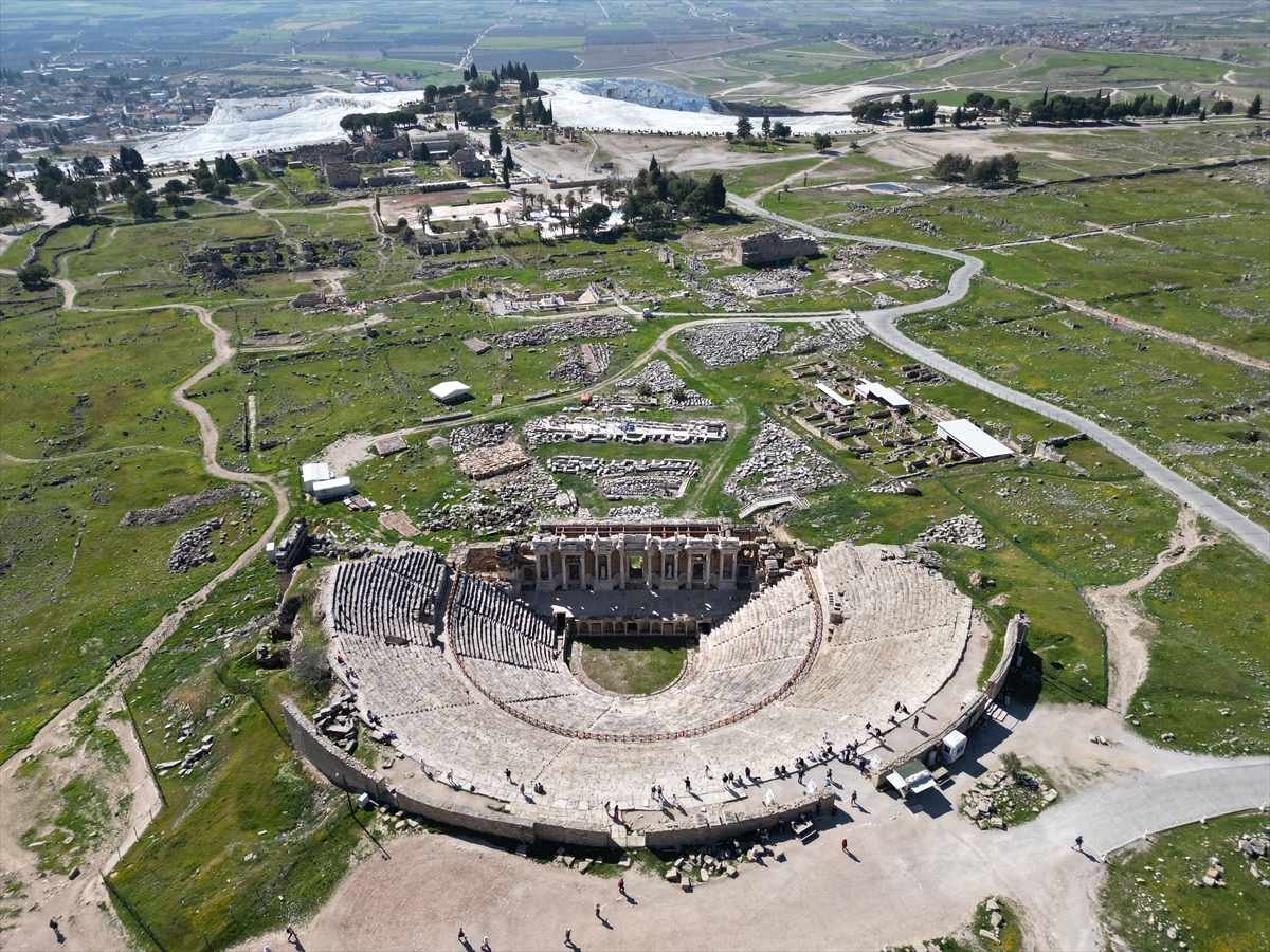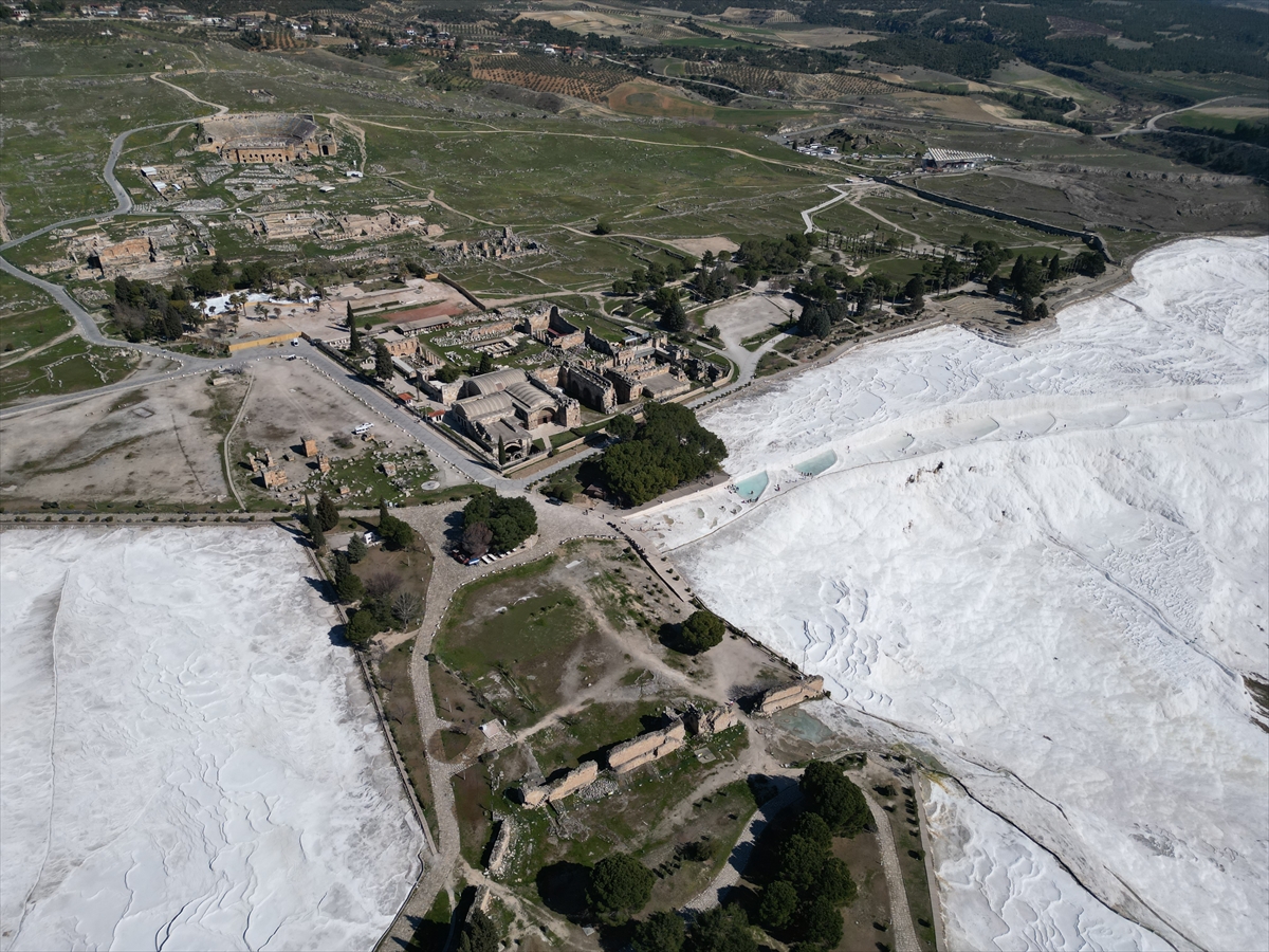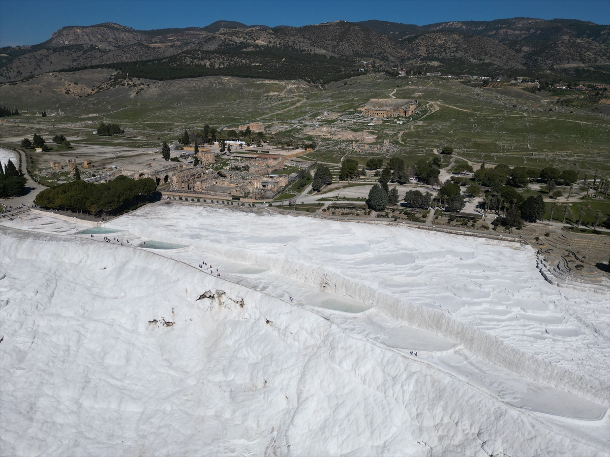 Dünyanın dört bir tarafından gelenler, travertenleriyle benzersiz doğal güzelliğe sahip Pamukkale'de, geçmişi 2 bin 200 yıl öncesine uzanan Hierapolis Antik Kenti'nde tarihle iç içe vakit geçiriyor.