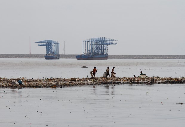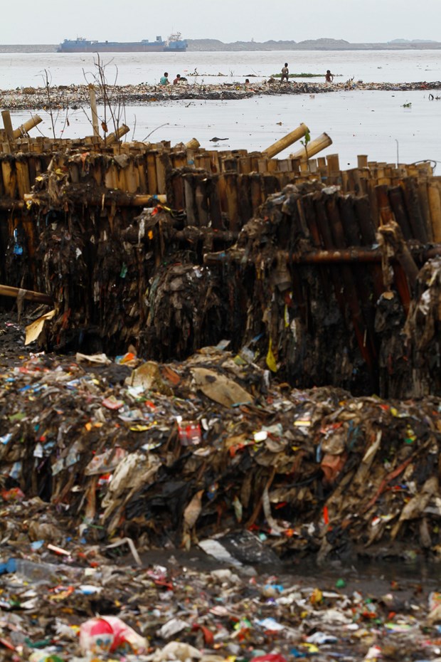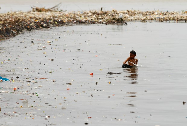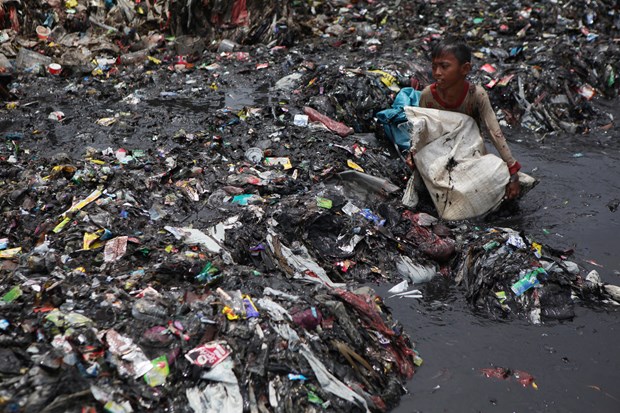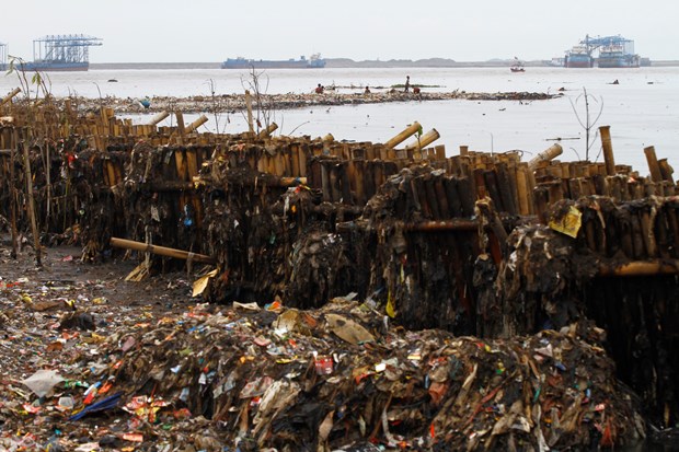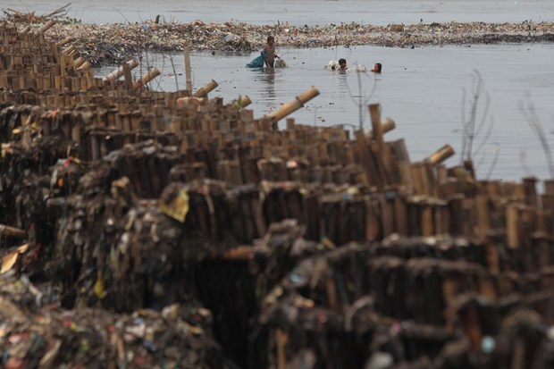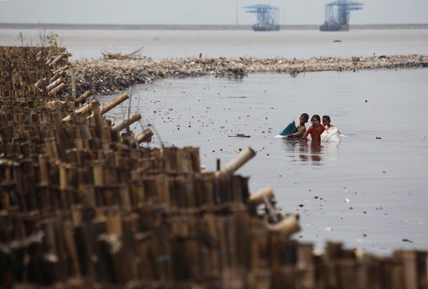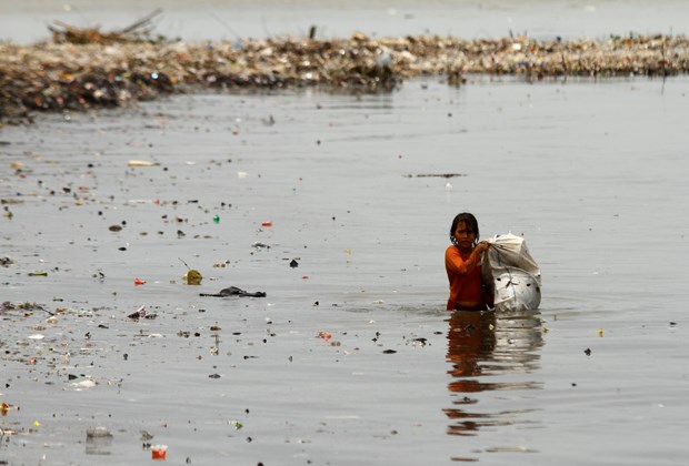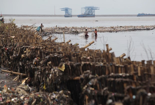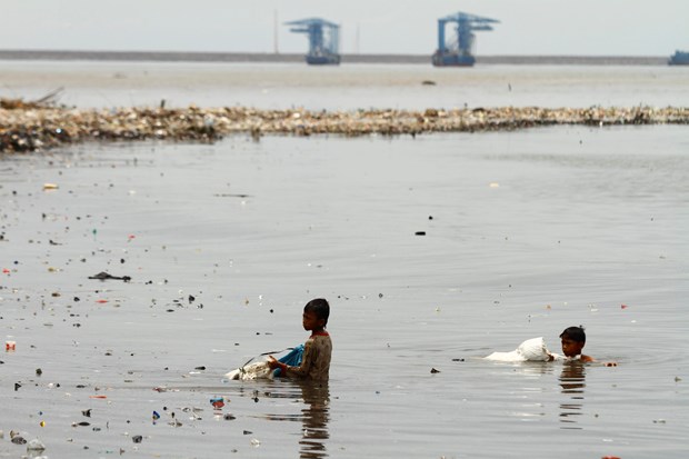 Endonezya'nın başkenti Jakarta'da denize kıyısı bulunan sahil köyünde, çocuklar dalgaların kıyıya sürüklediği plastik çöp ve atık topluyor.