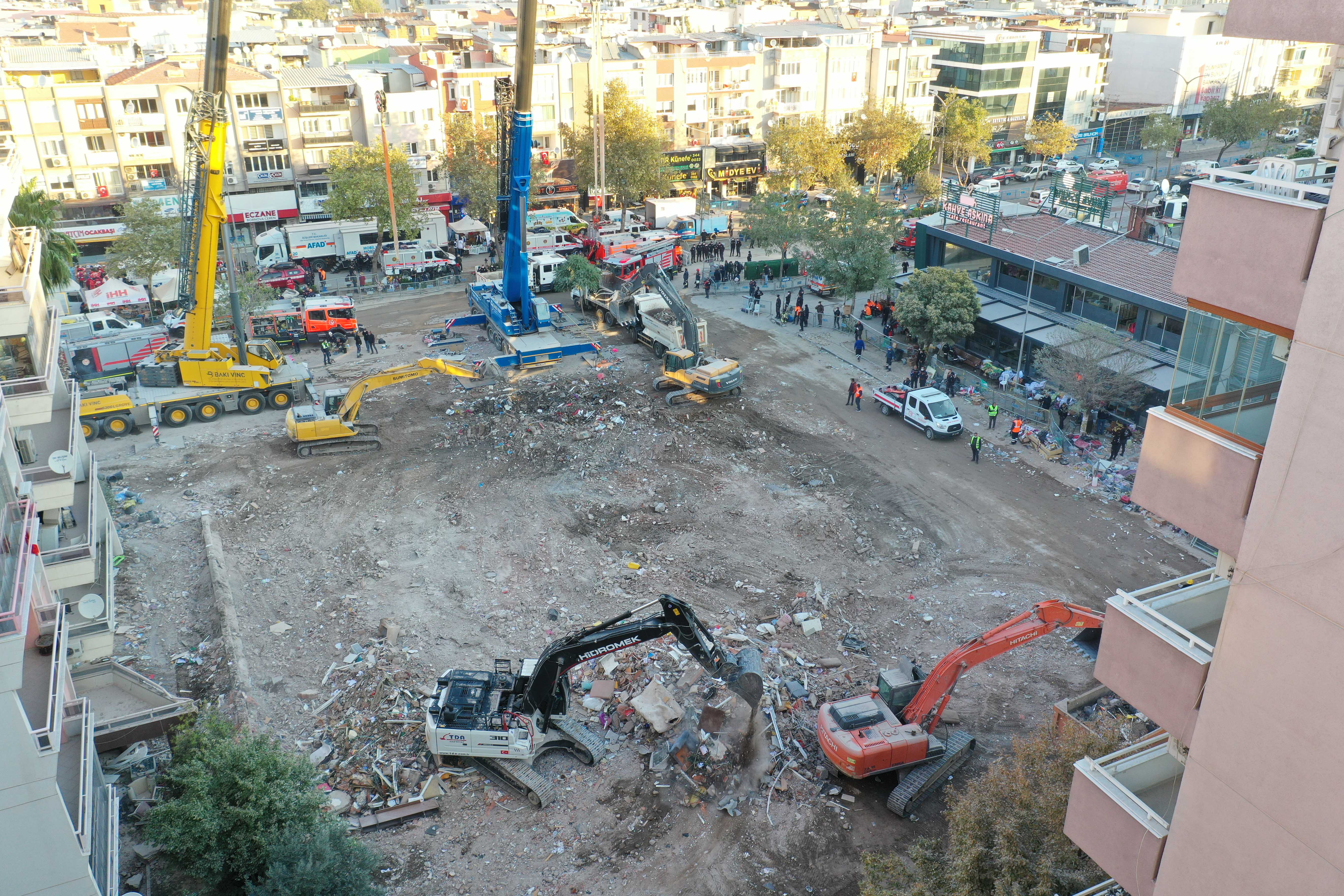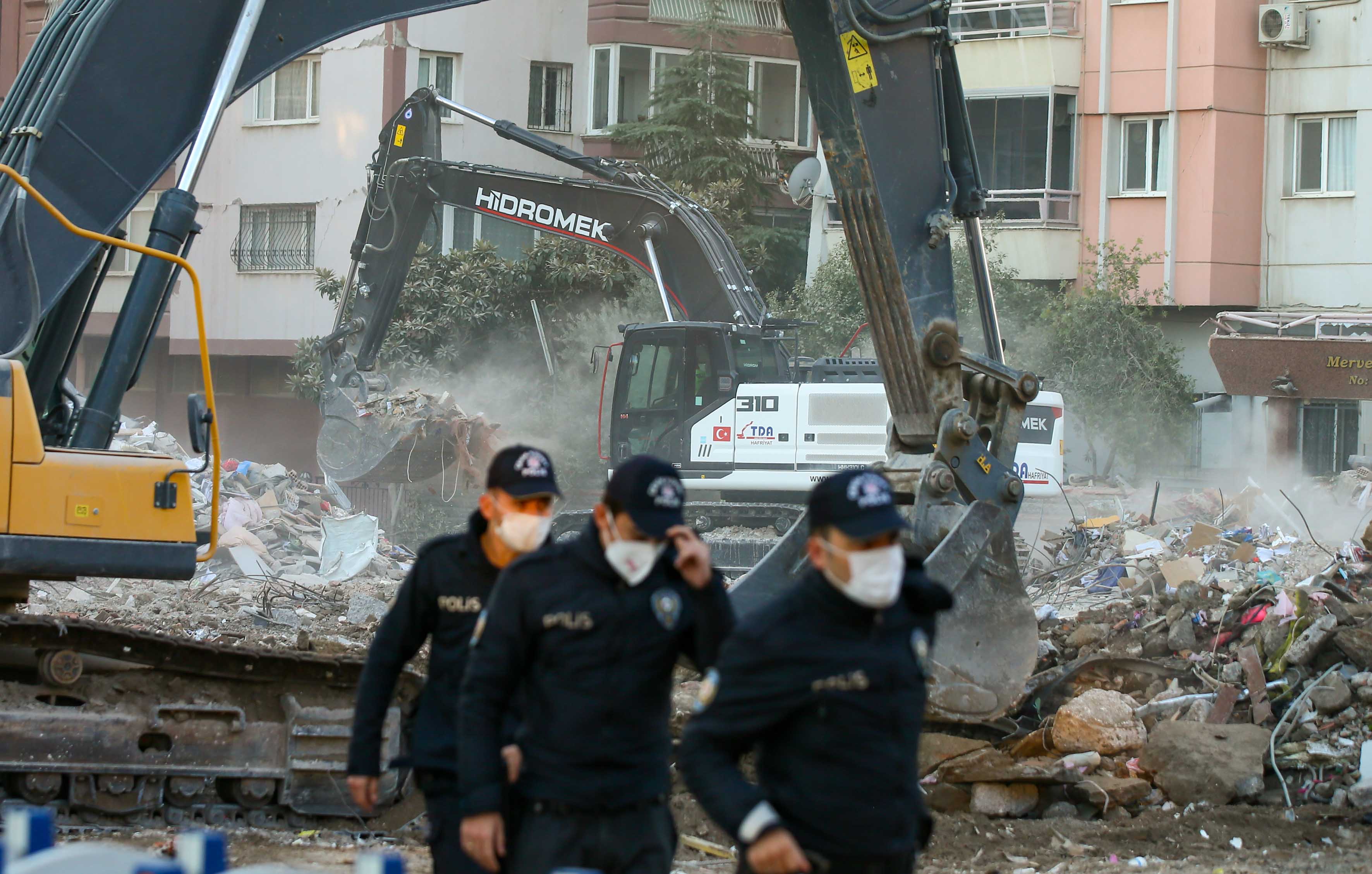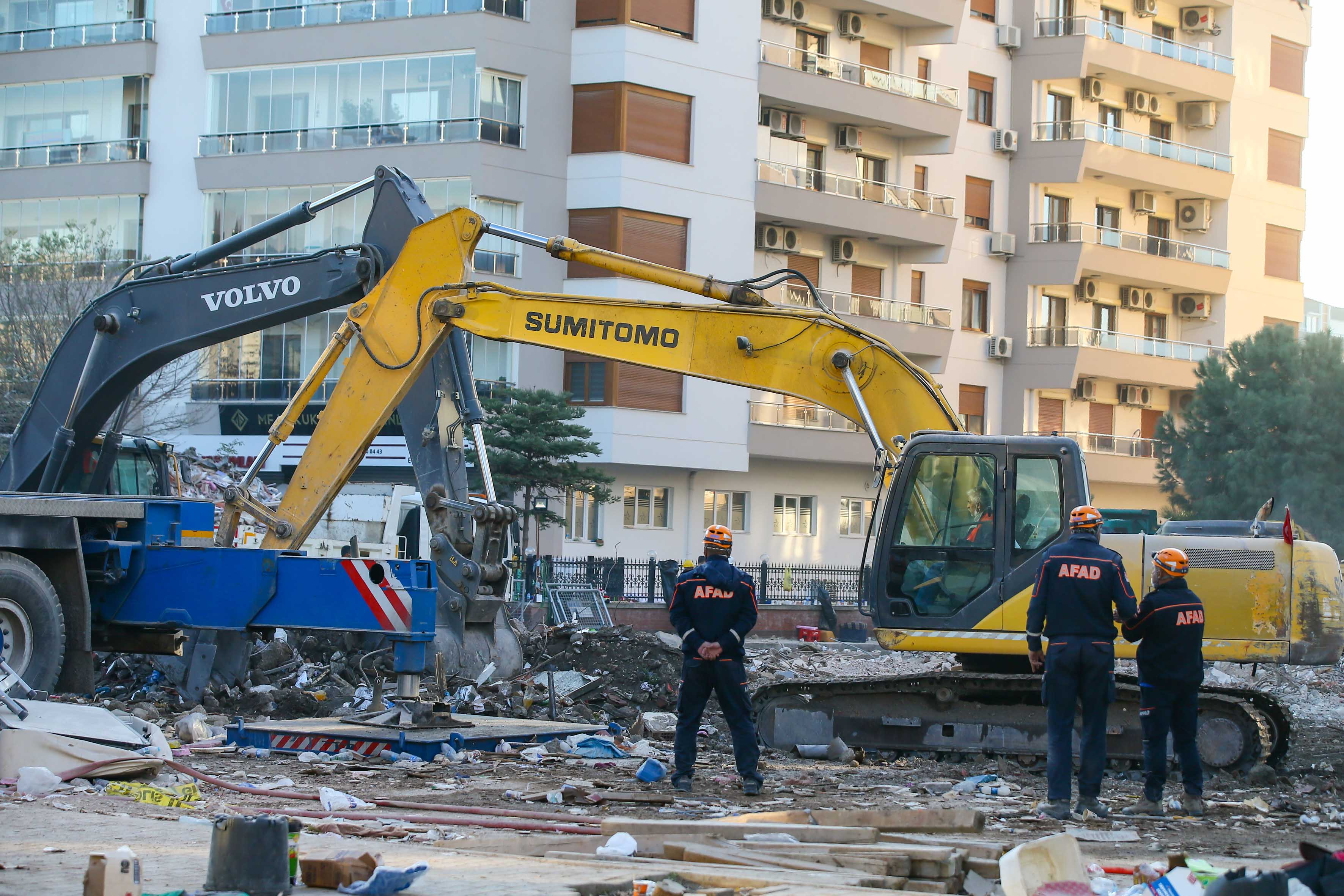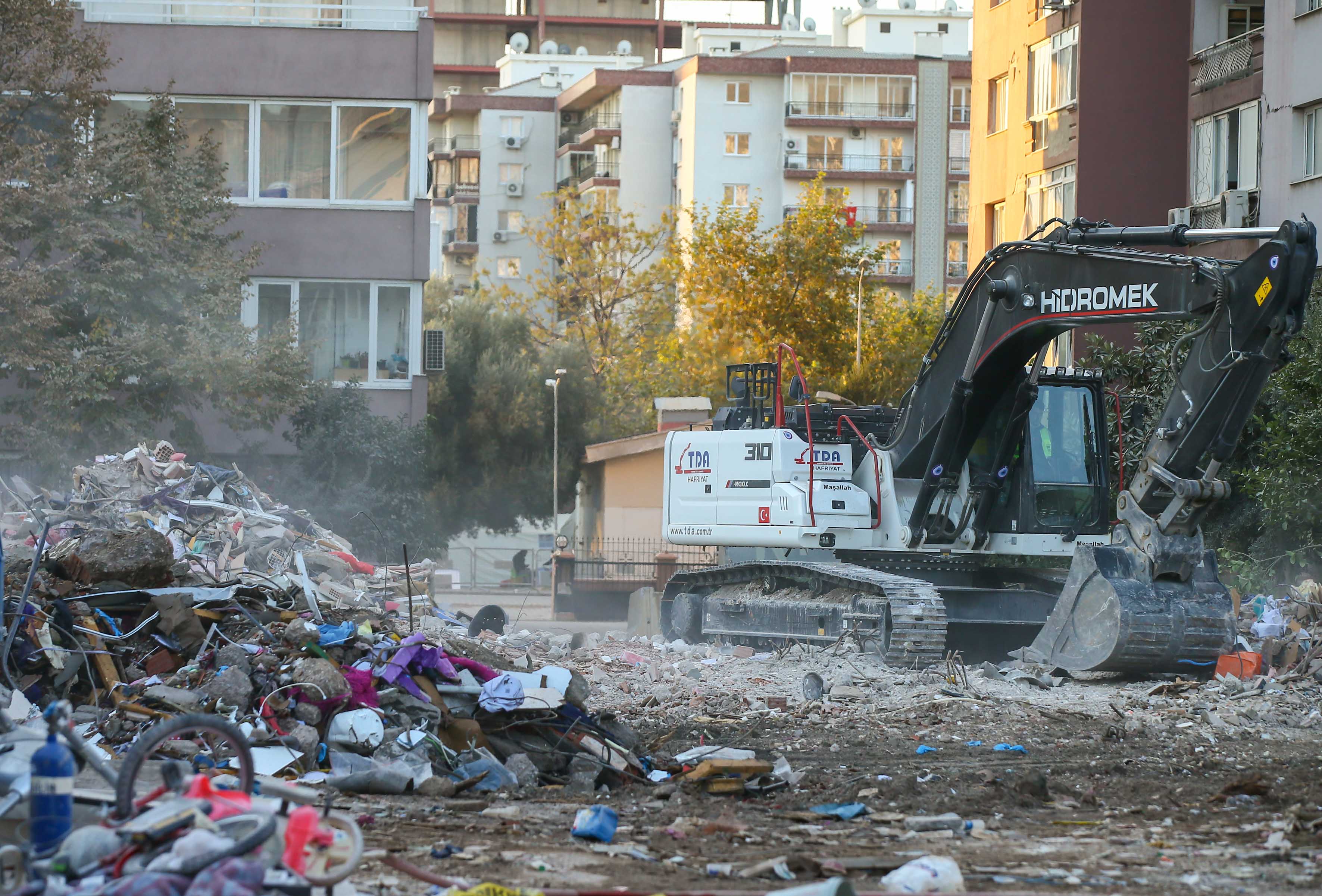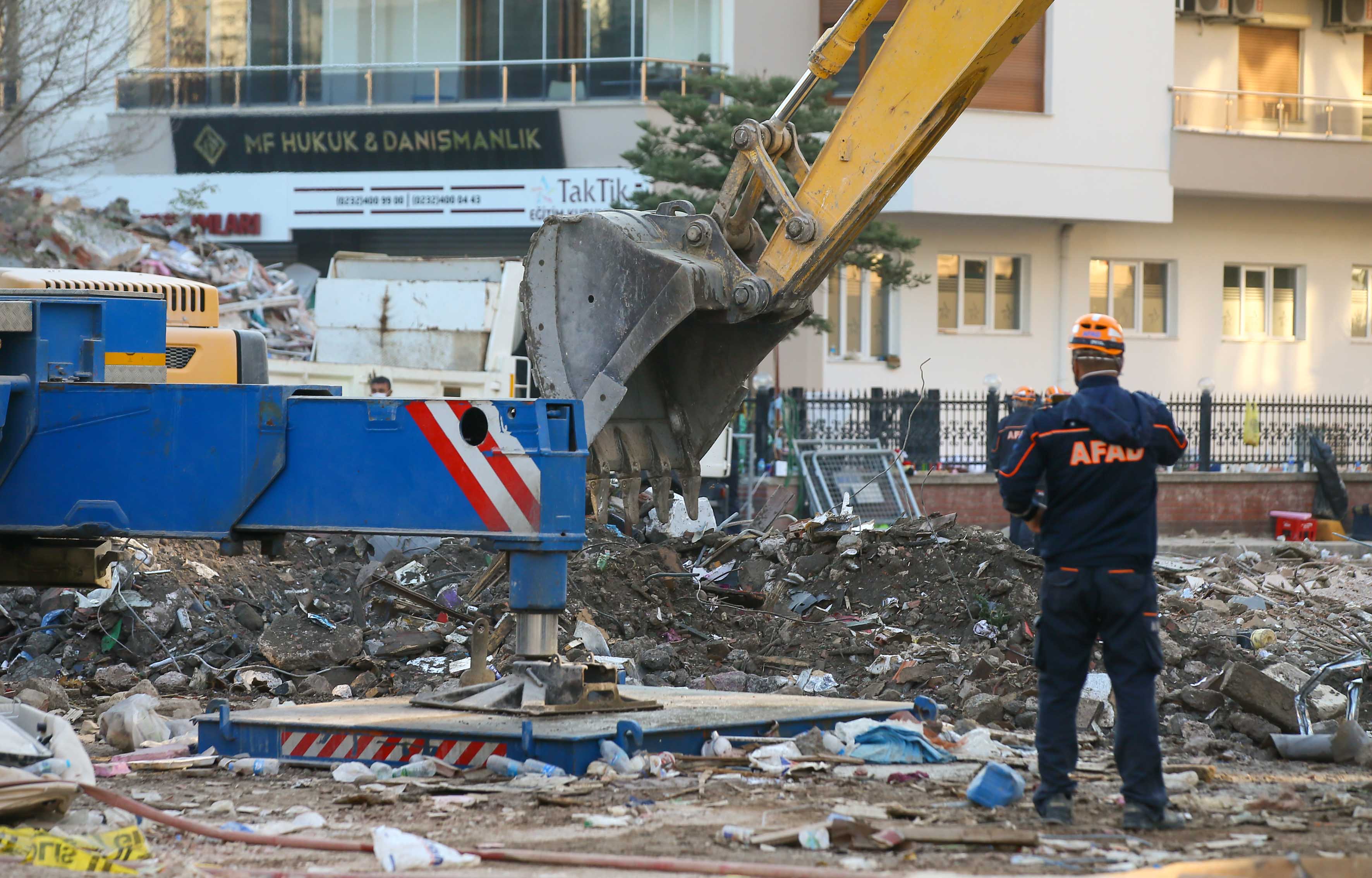 İzmir'deki depremin ardından arama kurtarma çalışmaları tamamlanan Bayraklı ilçesindeki Rıza Bey Apartmanı'ndaki enkaz kaldırma çalışmaları sürüyor.