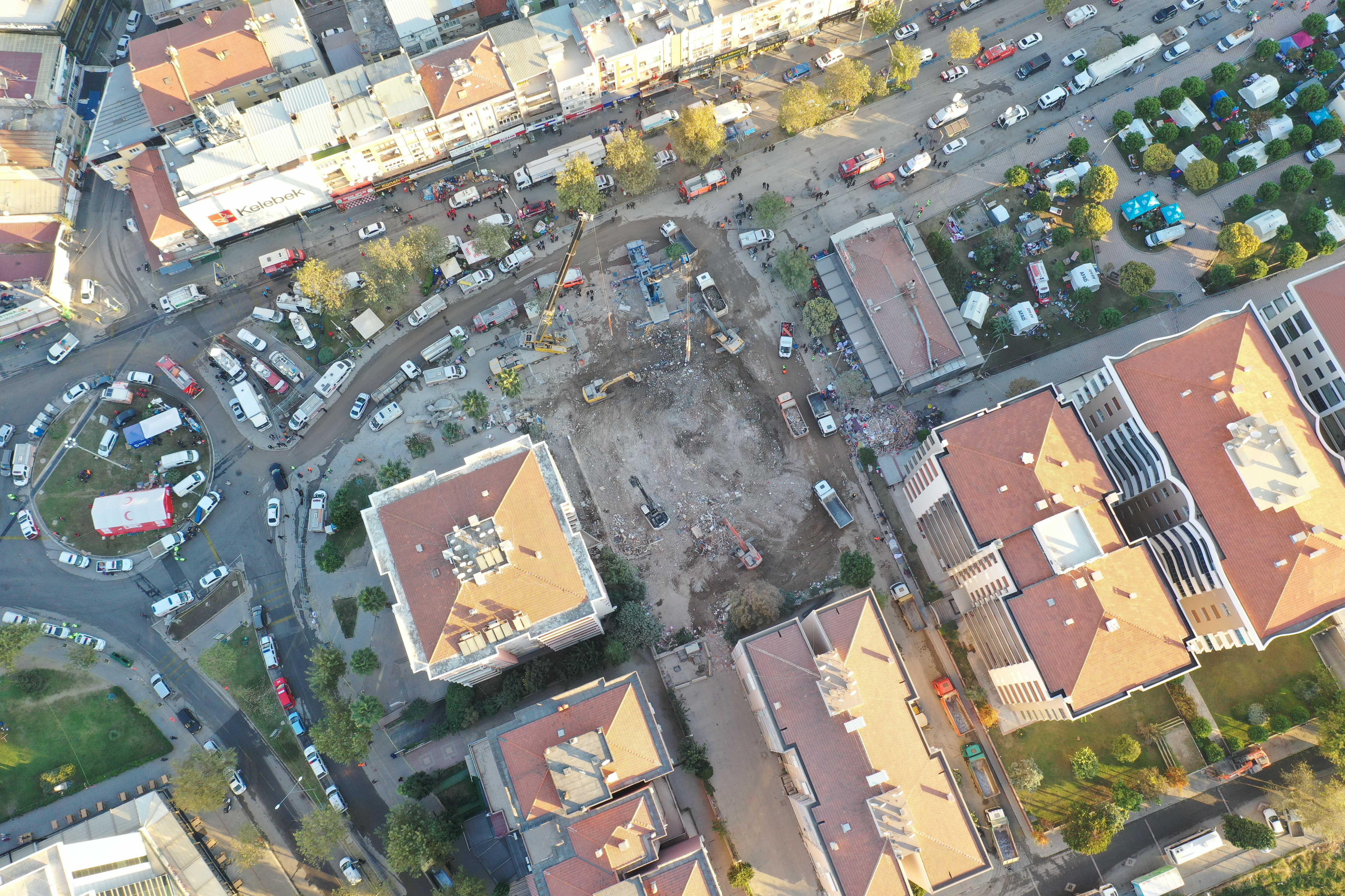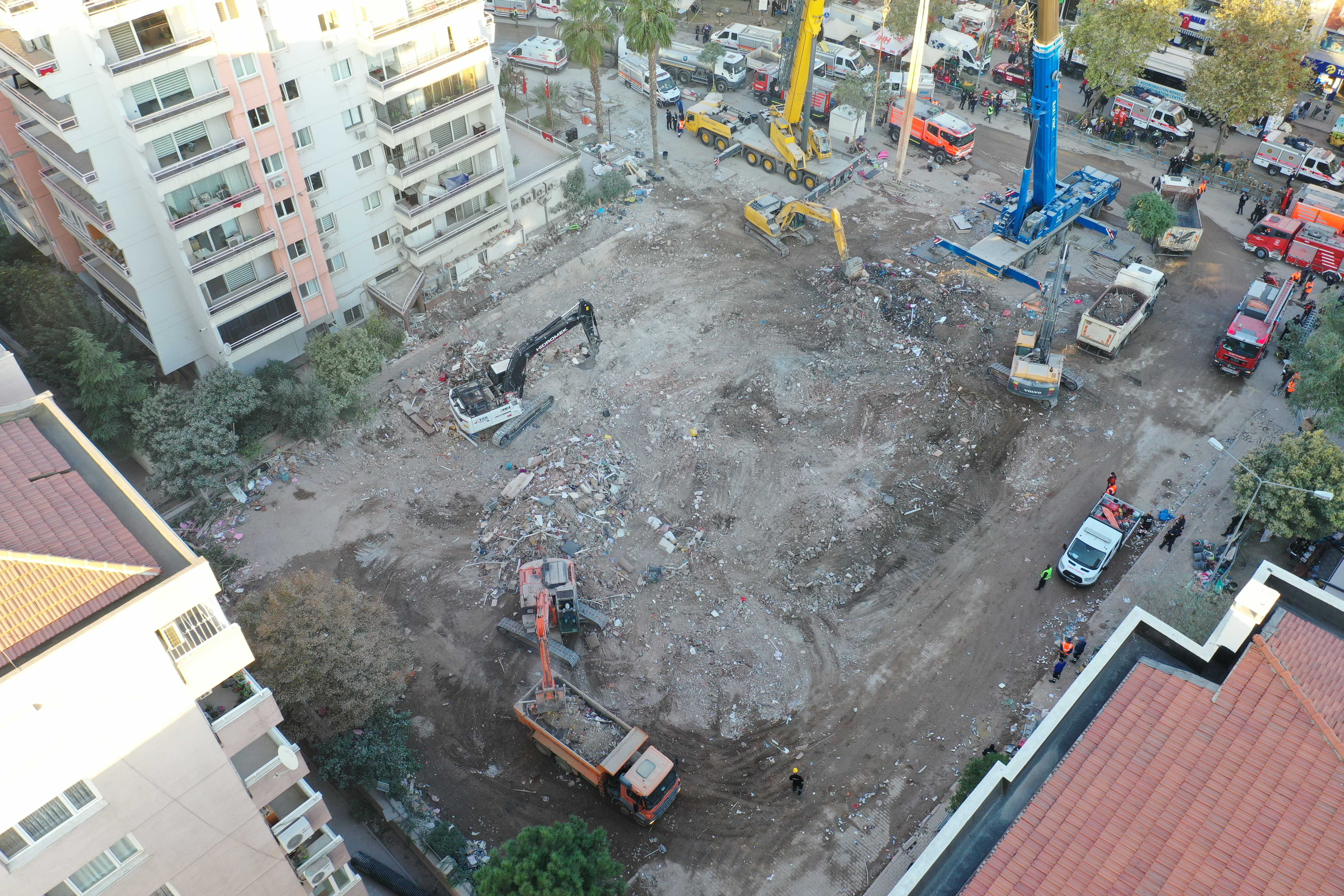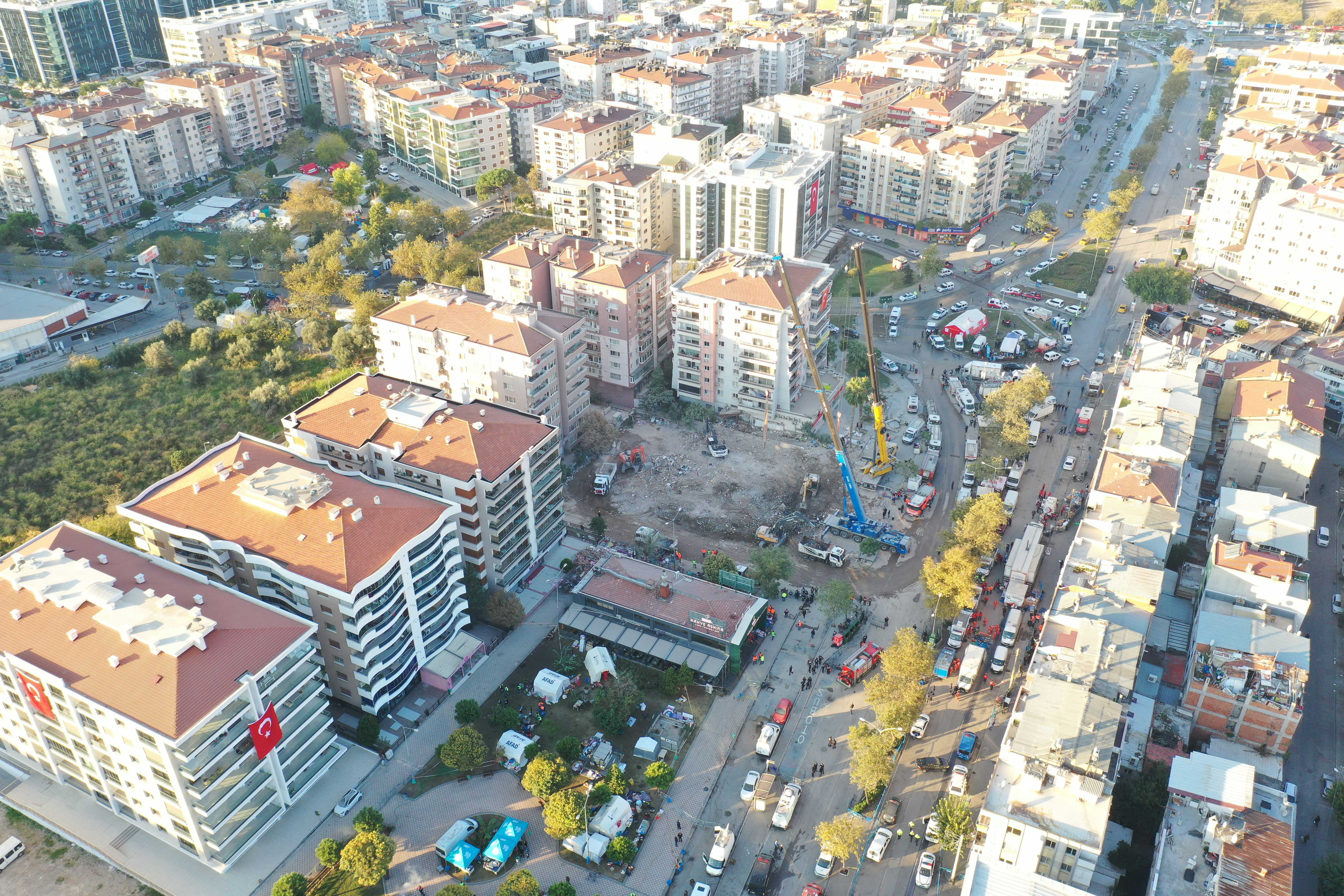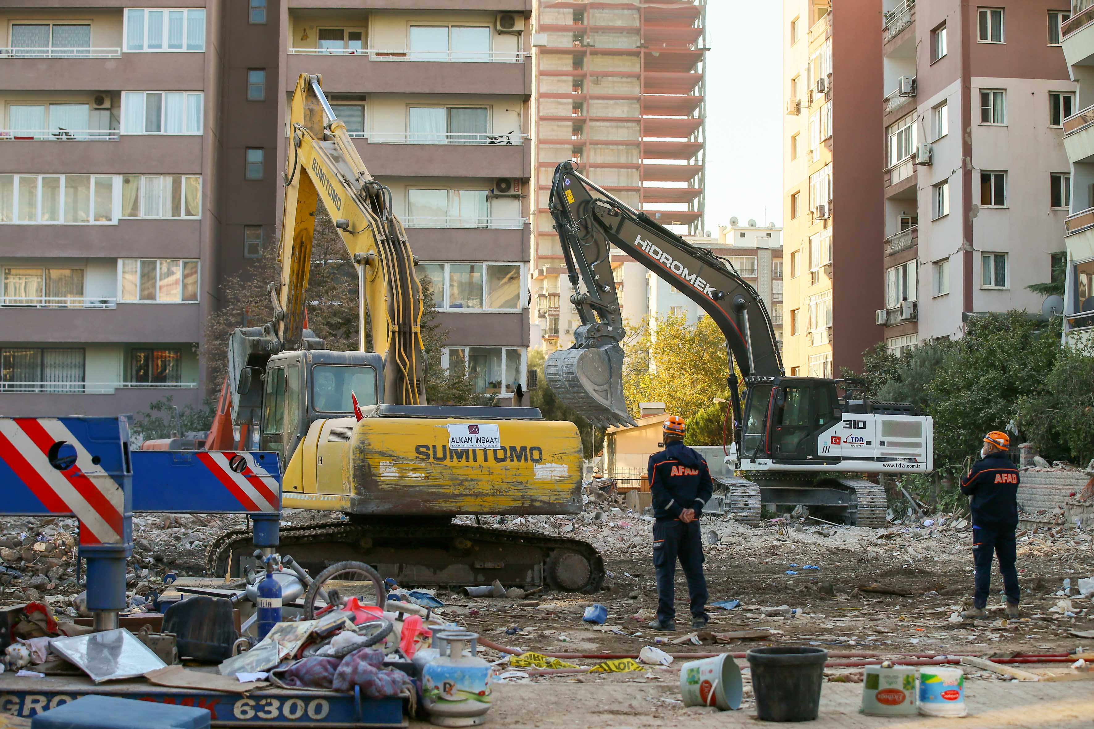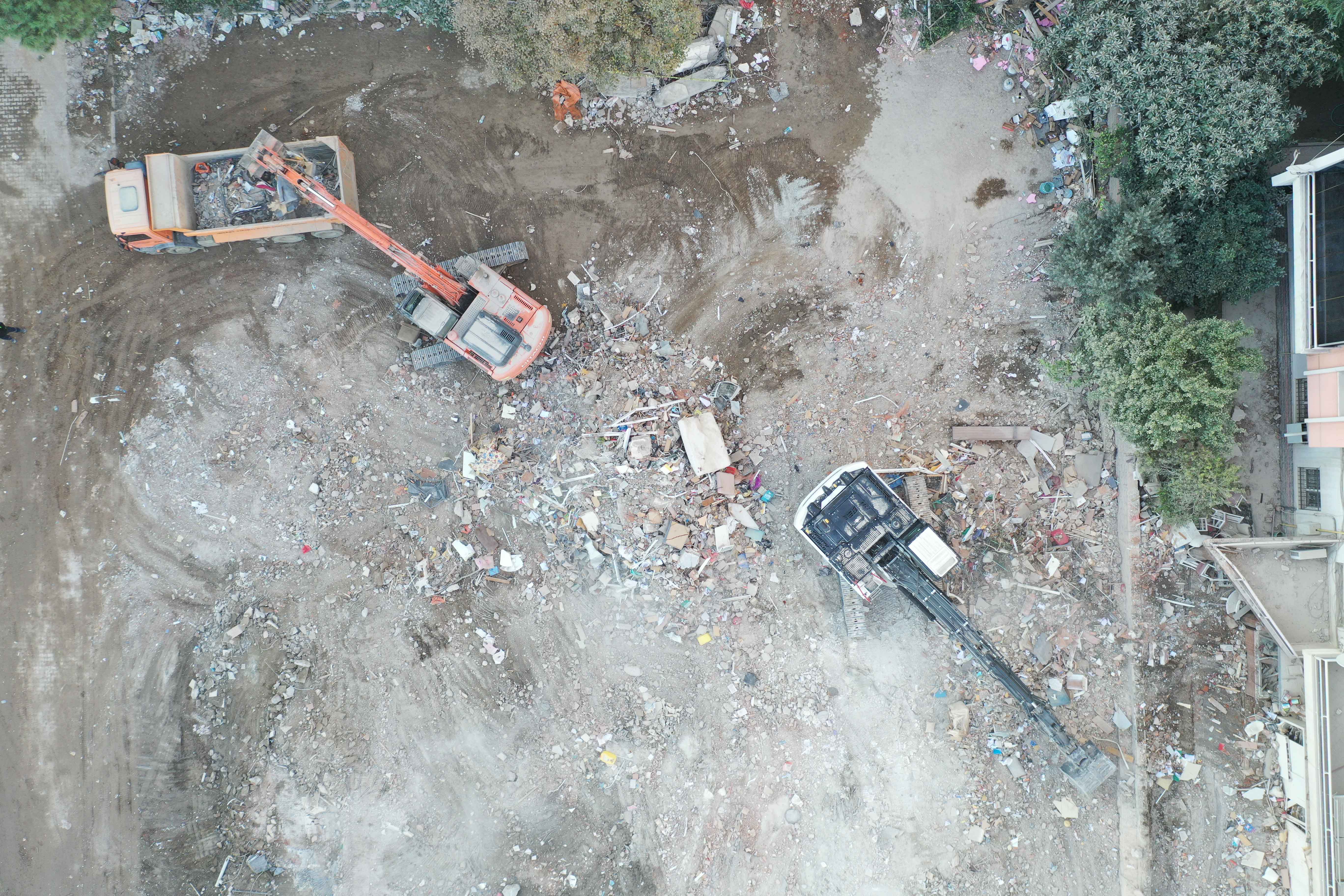 İzmir'deki depremin ardından arama kurtarma çalışmaları tamamlanan Bayraklı ilçesindeki Rıza Bey Apartmanı'ndaki enkaz kaldırma çalışmaları sürüyor.