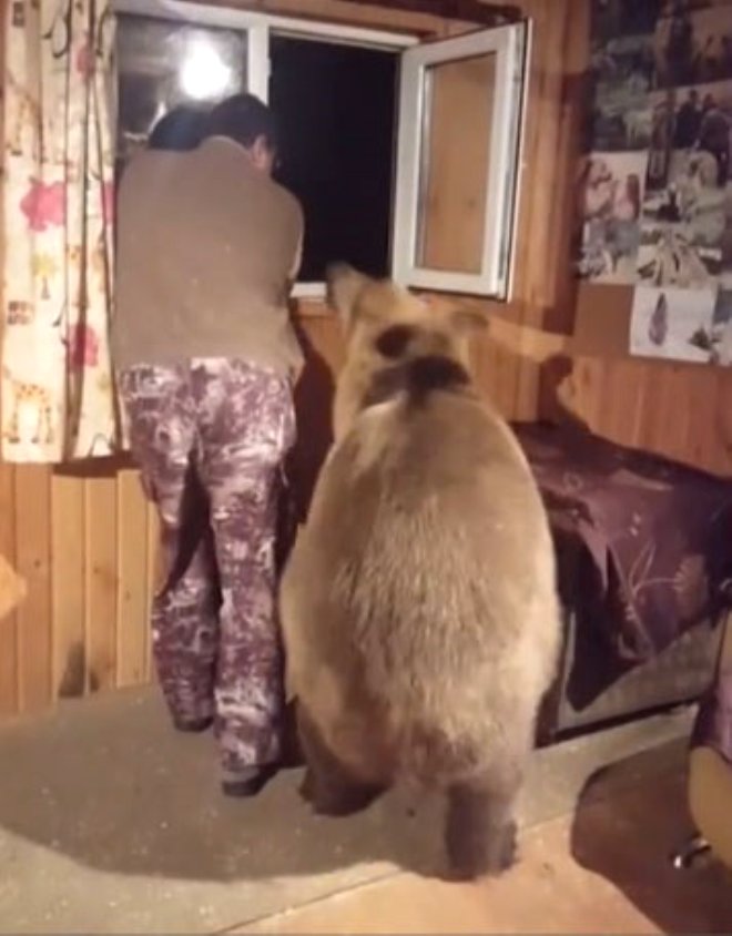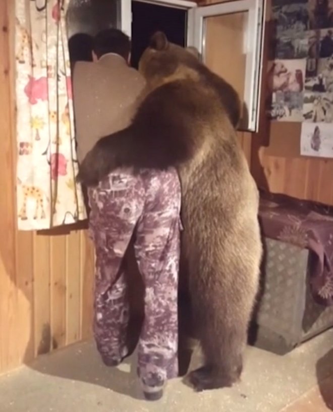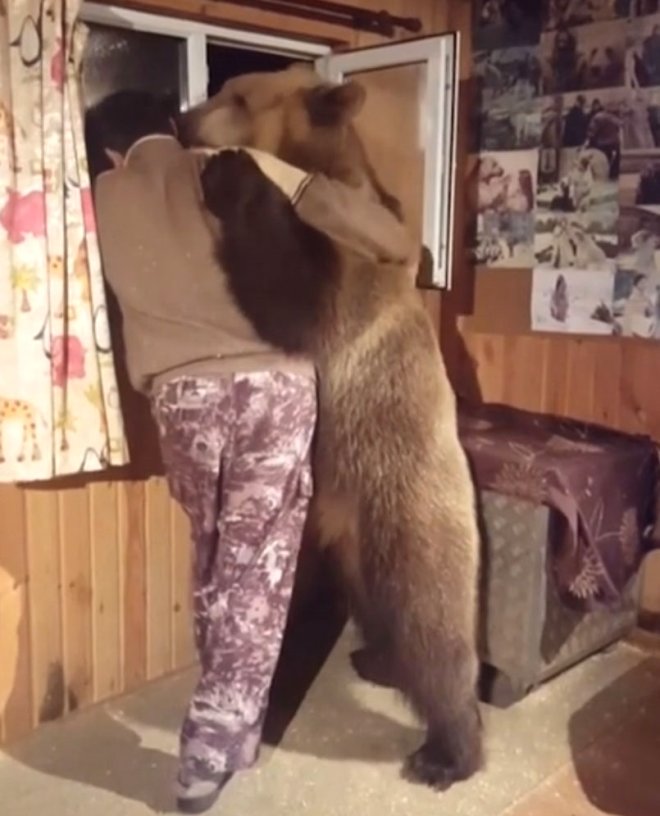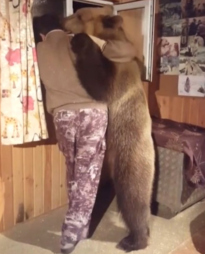 2 yaşındaki evcil bir ayı, pencereden bakan sahibini kucaklayıp, öptü.