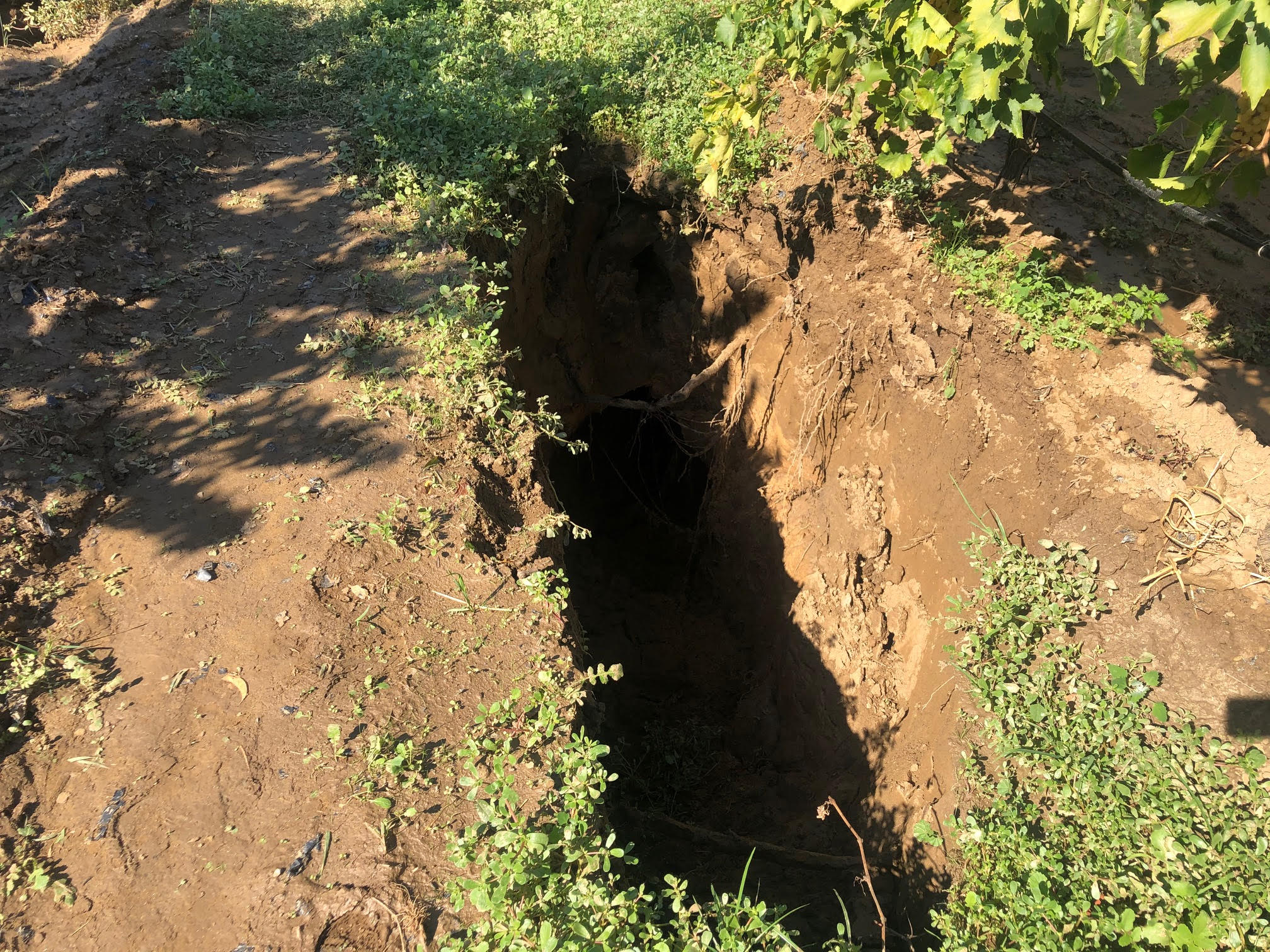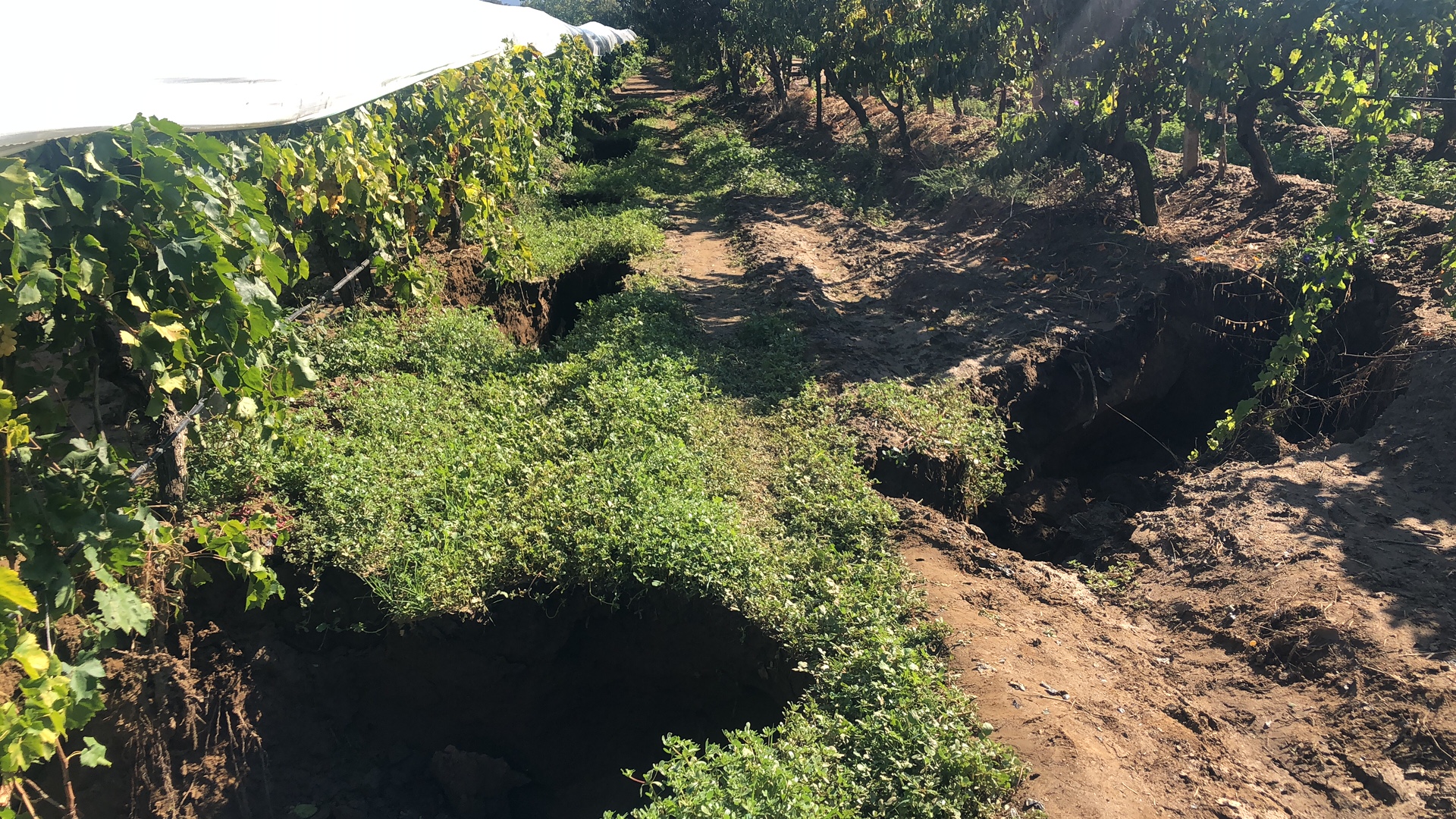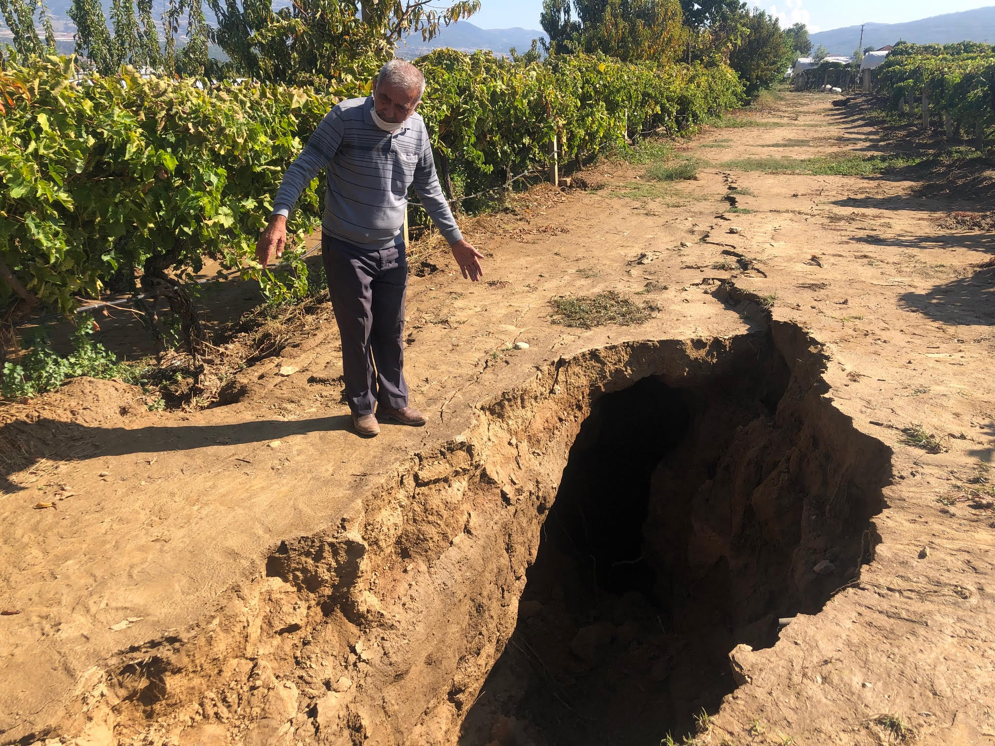 Sarıgöl'de üç gün önce etkili olan sağanak ve dolu sonrası hasar tespit çalışması sırasında, bağların içinden geçen fay hattında geniş yarık ve çukurlar oluştuğu görüldü.