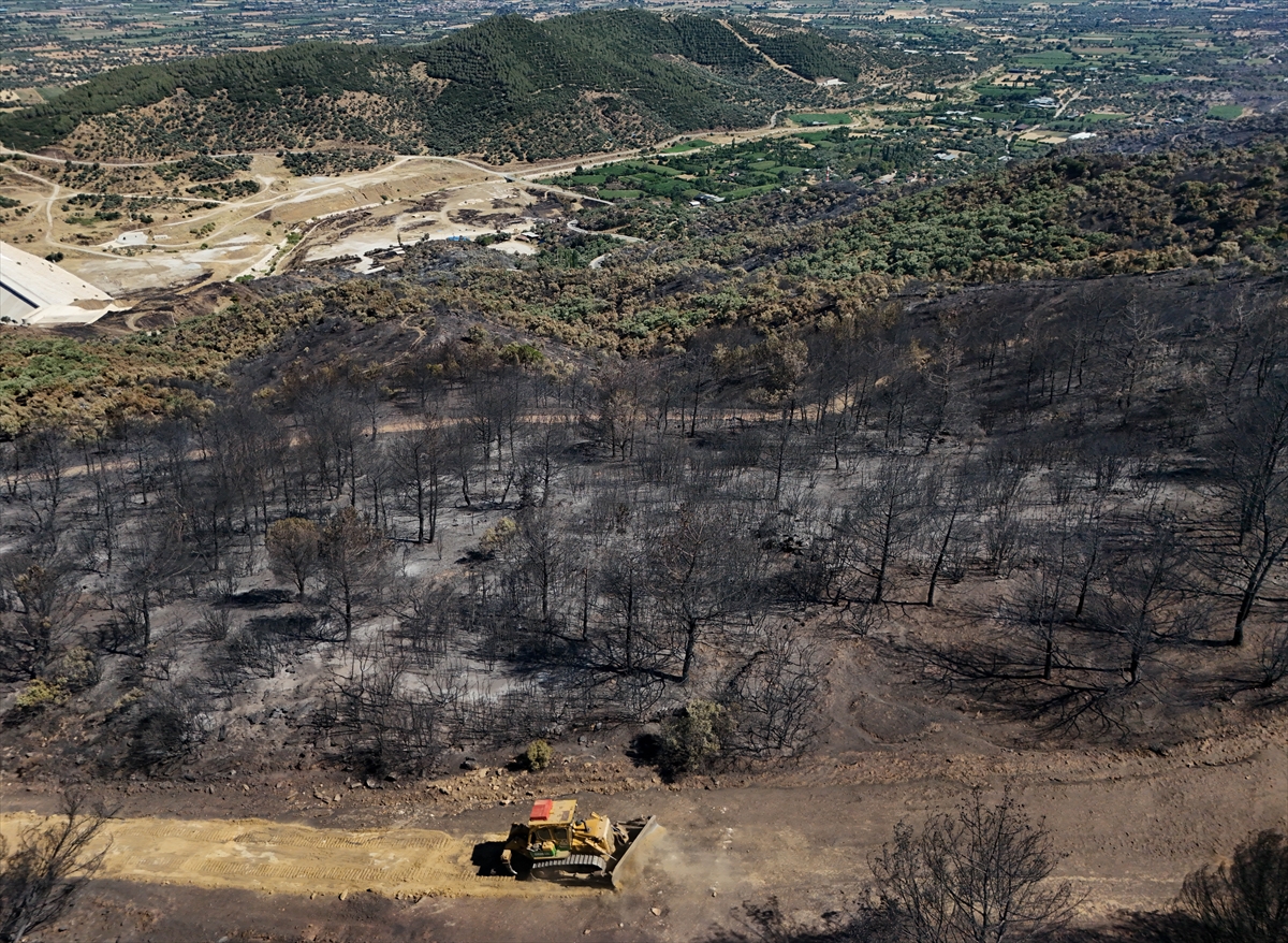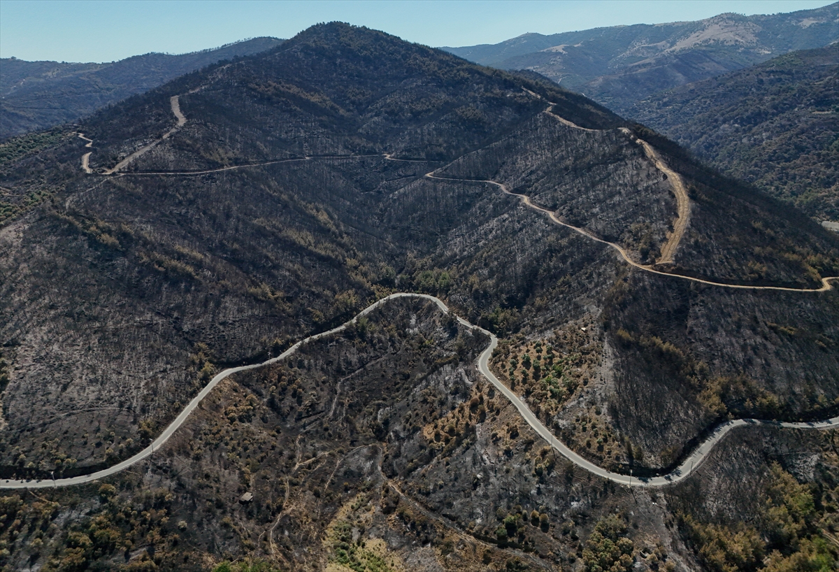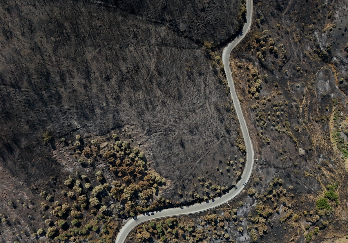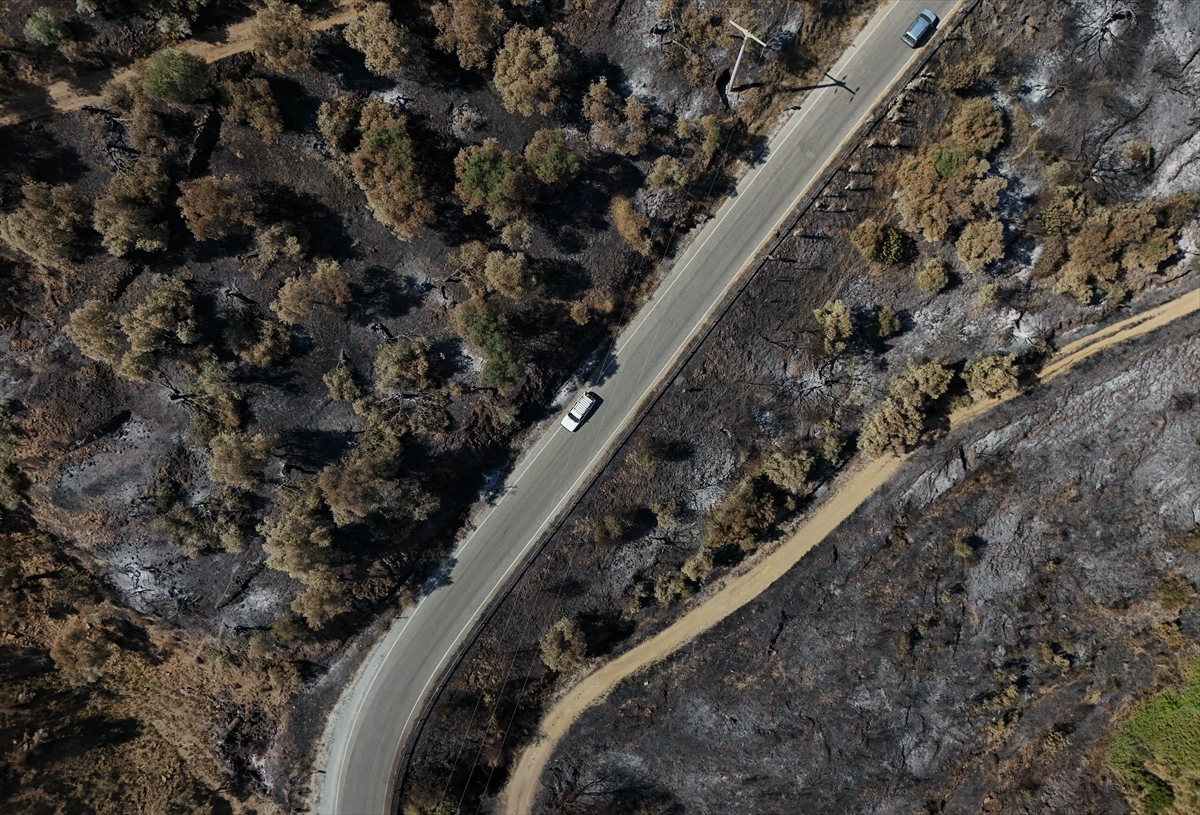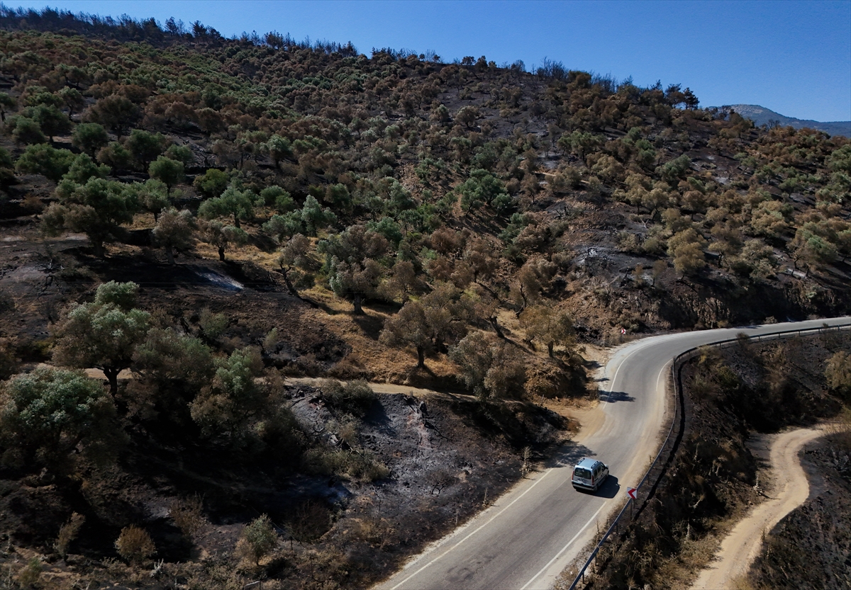 Sarp arazide, yoğun çam ormanlarının yanı sıra zeytin bahçelerinin de bulunduğu bölgede, yangın sonrası yeşil alanların siyaha büründüğü görüldü.