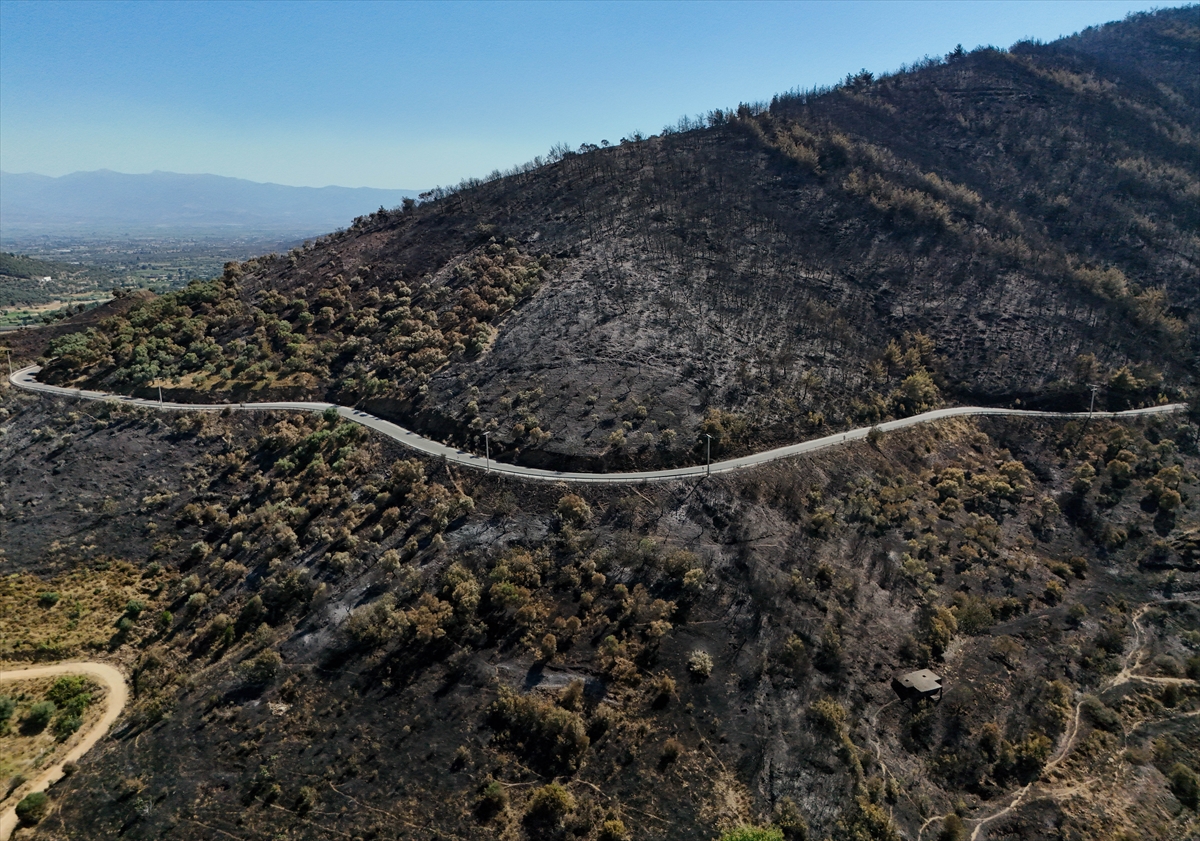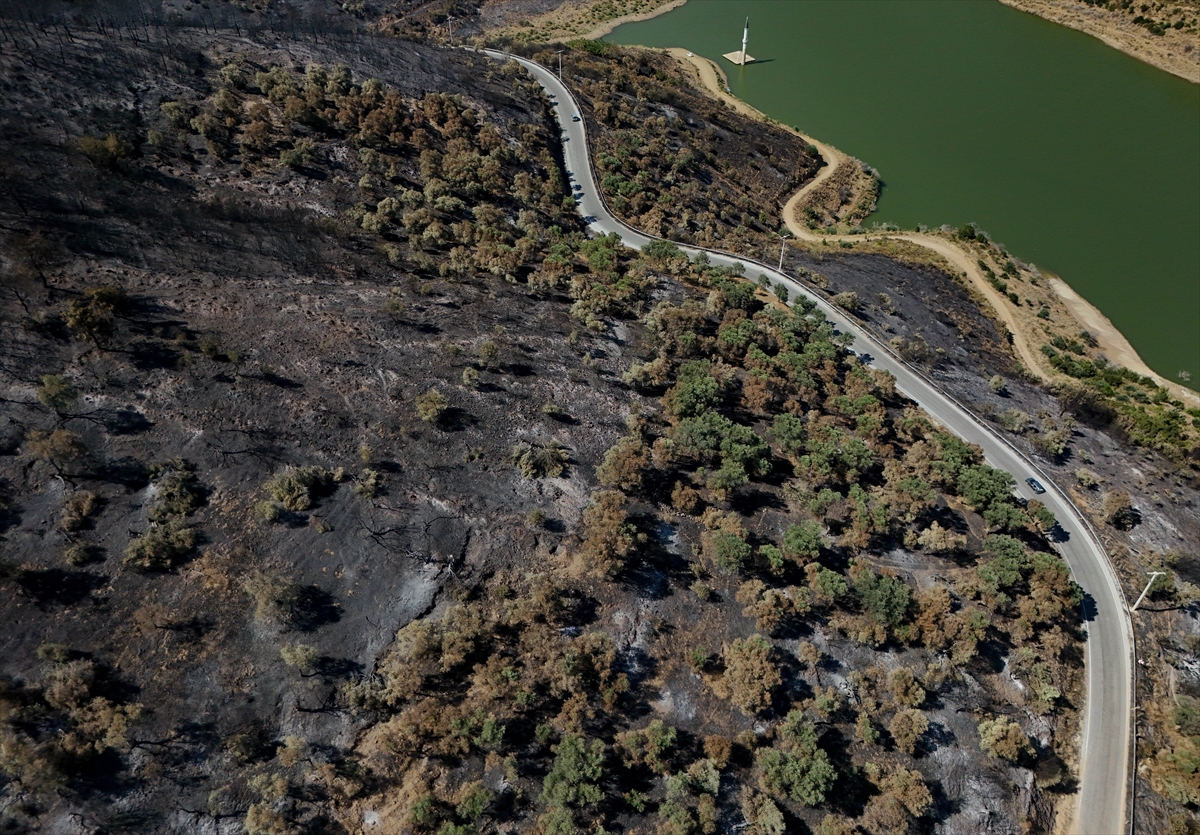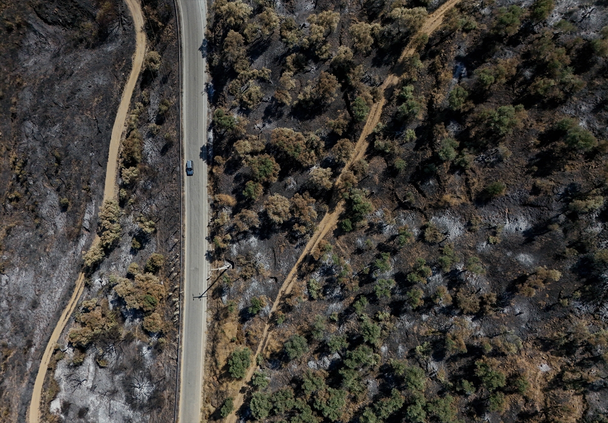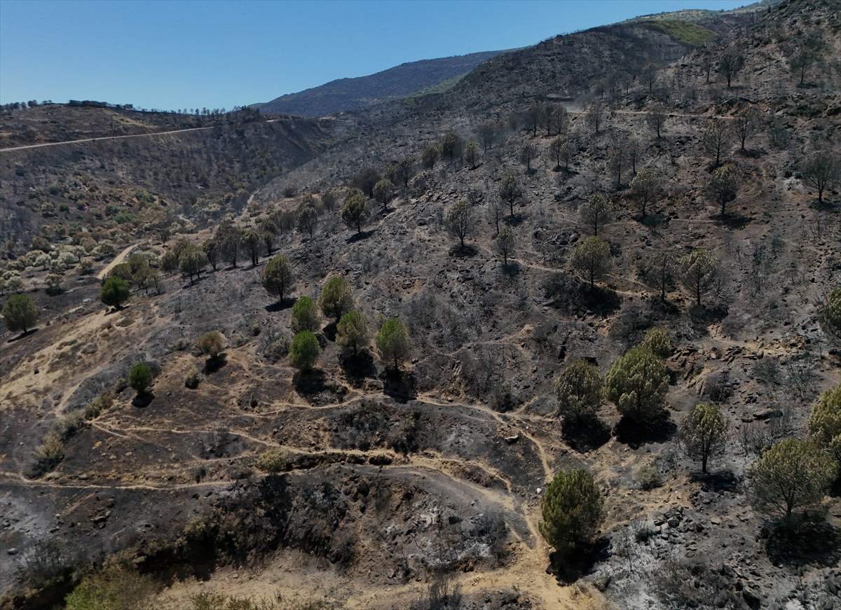Sarp arazide, yoğun çam ormanlarının yanı sıra zeytin bahçelerinin de bulunduğu bölgede, yangın sonrası yeşil alanların siyaha büründüğü görüldü.