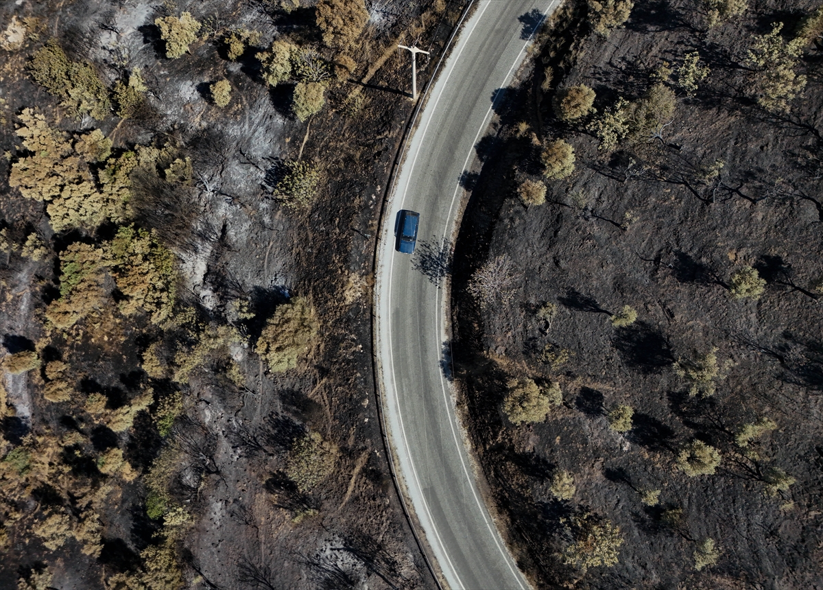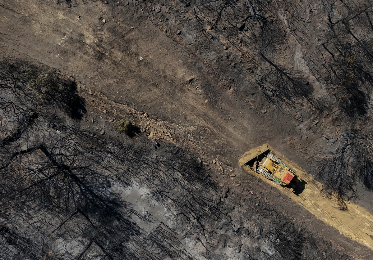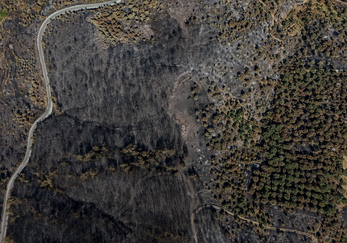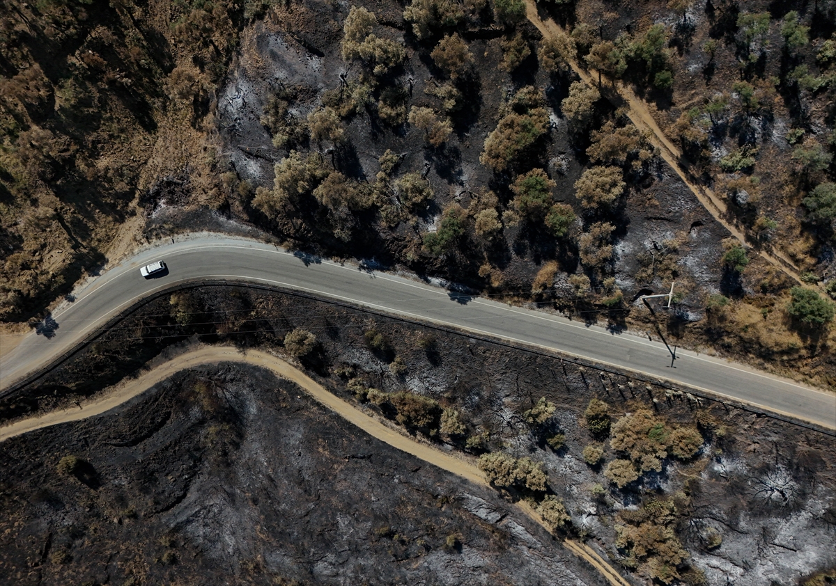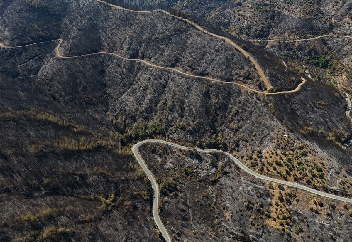 Sarp arazide, yoğun çam ormanlarının yanı sıra zeytin bahçelerinin de bulunduğu bölgede, yangın sonrası yeşil alanların siyaha büründüğü görüldü.